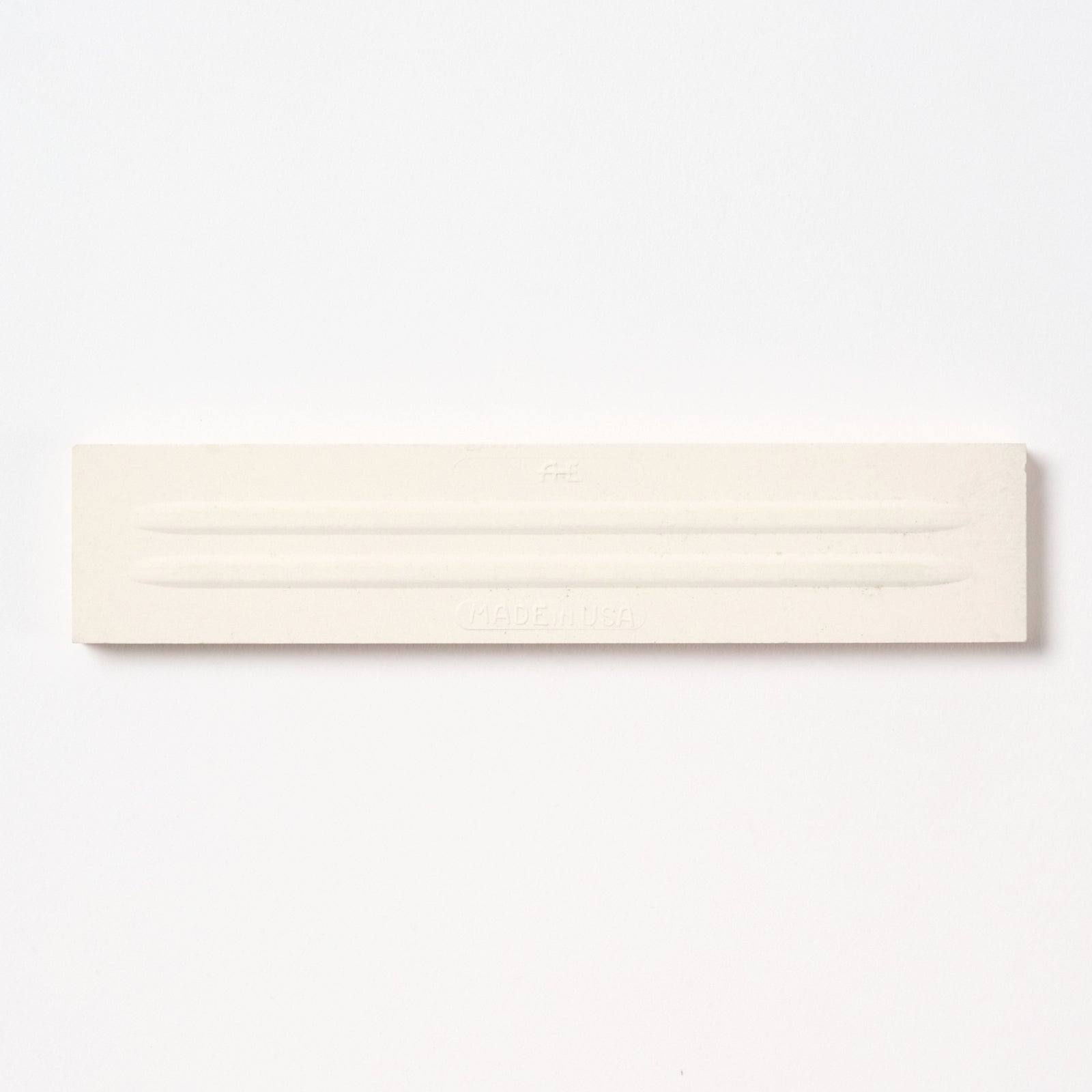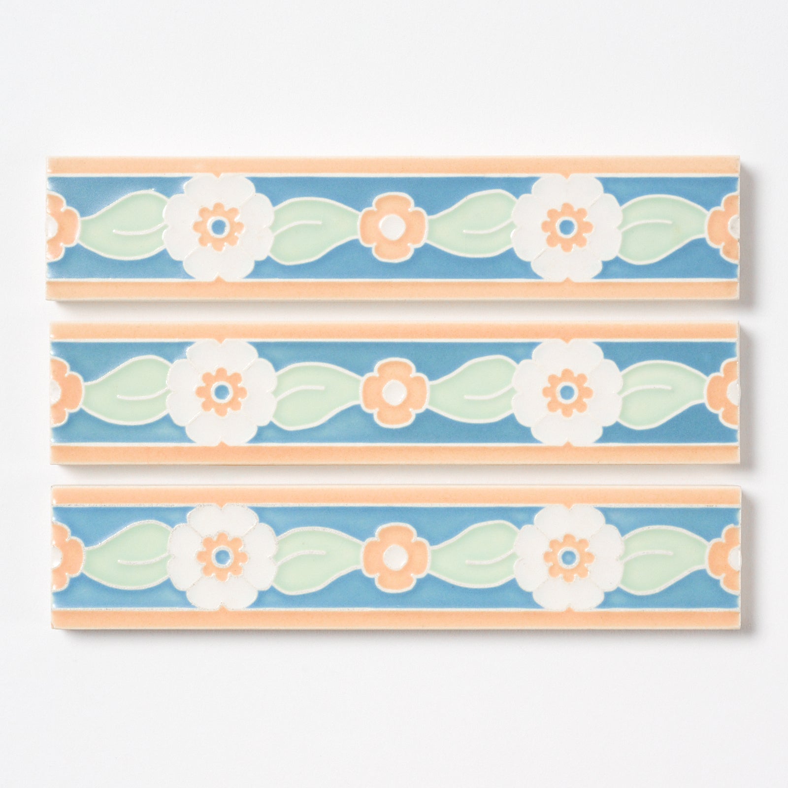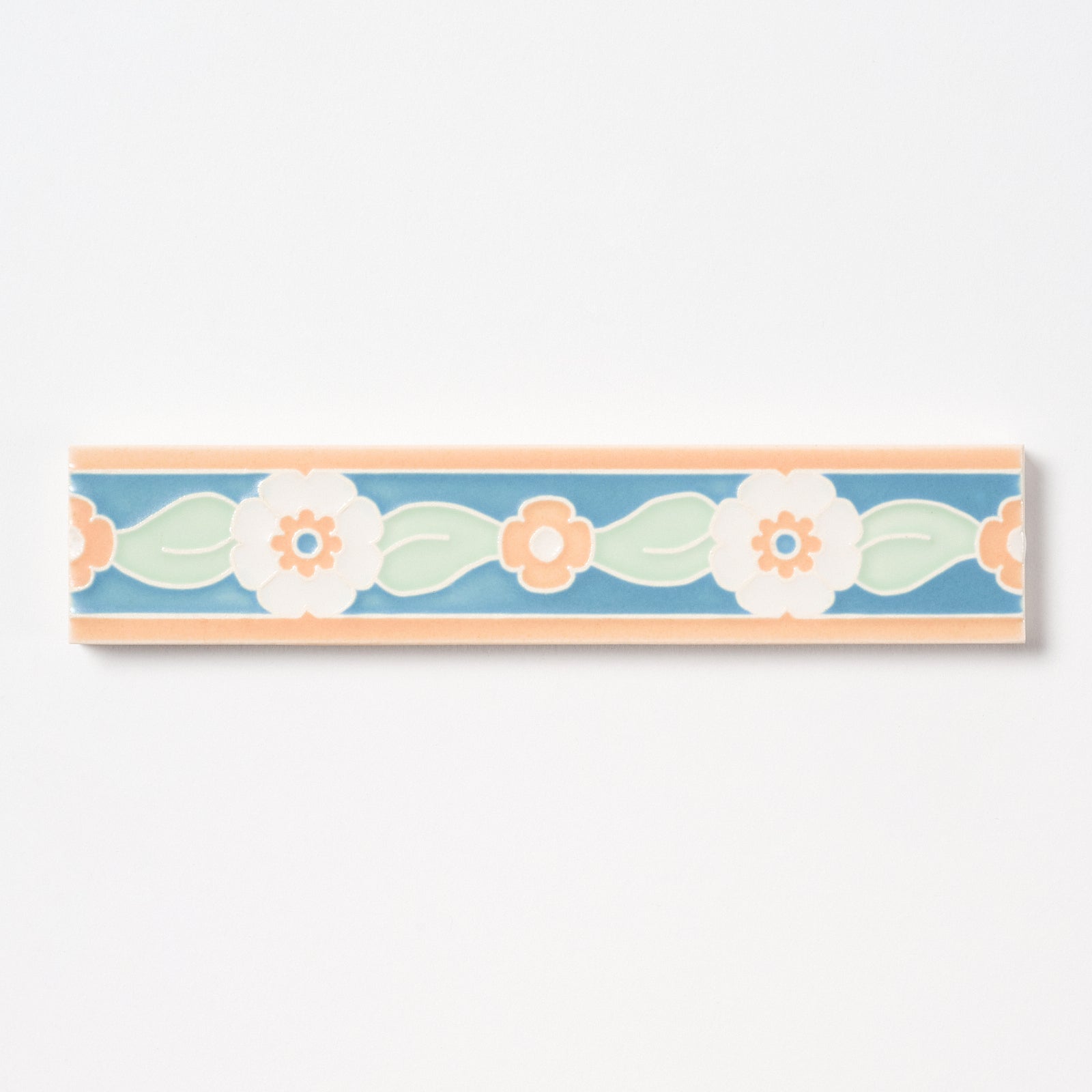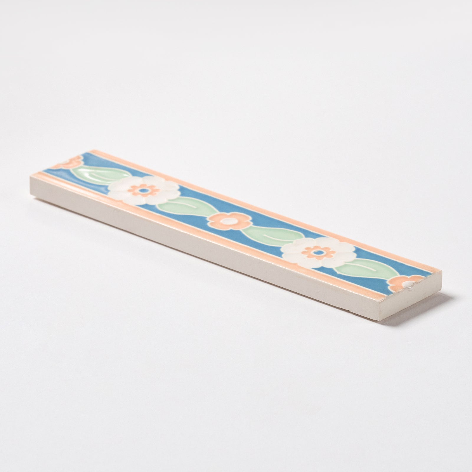This iconic, historic 1920s wide trim tile has a peach, green, blue and white colored floral pattern. Each tile is 1.25” wide x 6” long, 5/16” thick. Manufactured in the USA by American Encaustic Tiling Company. The tile is still in its original box.
