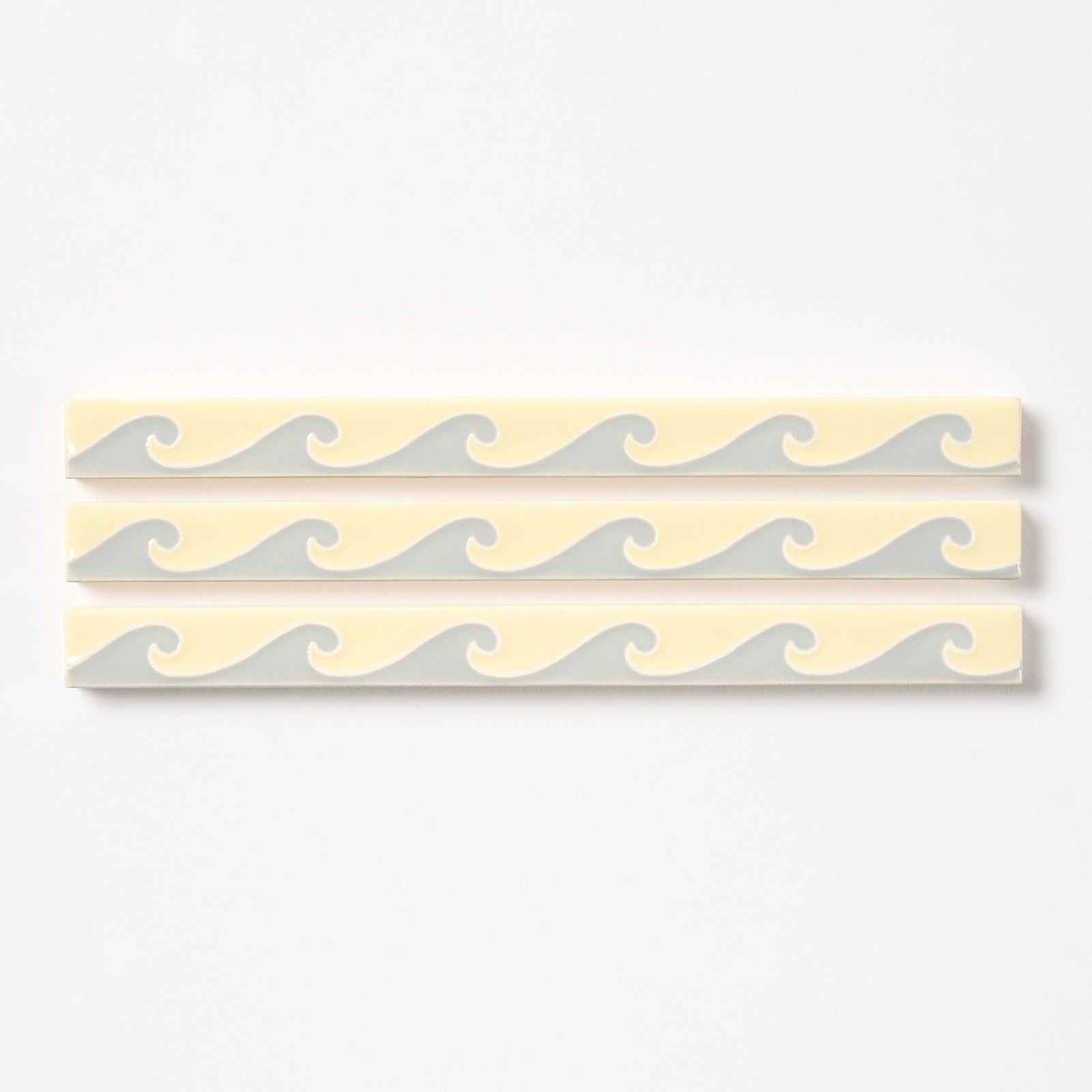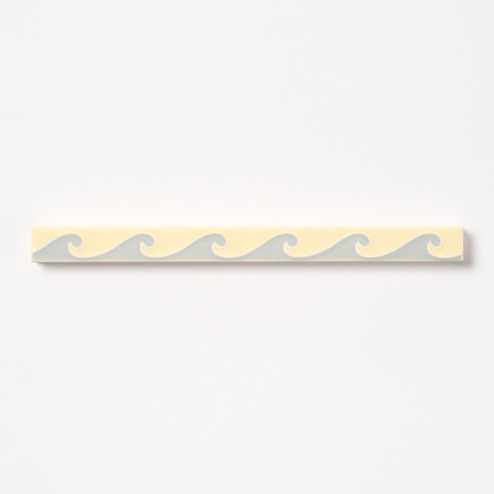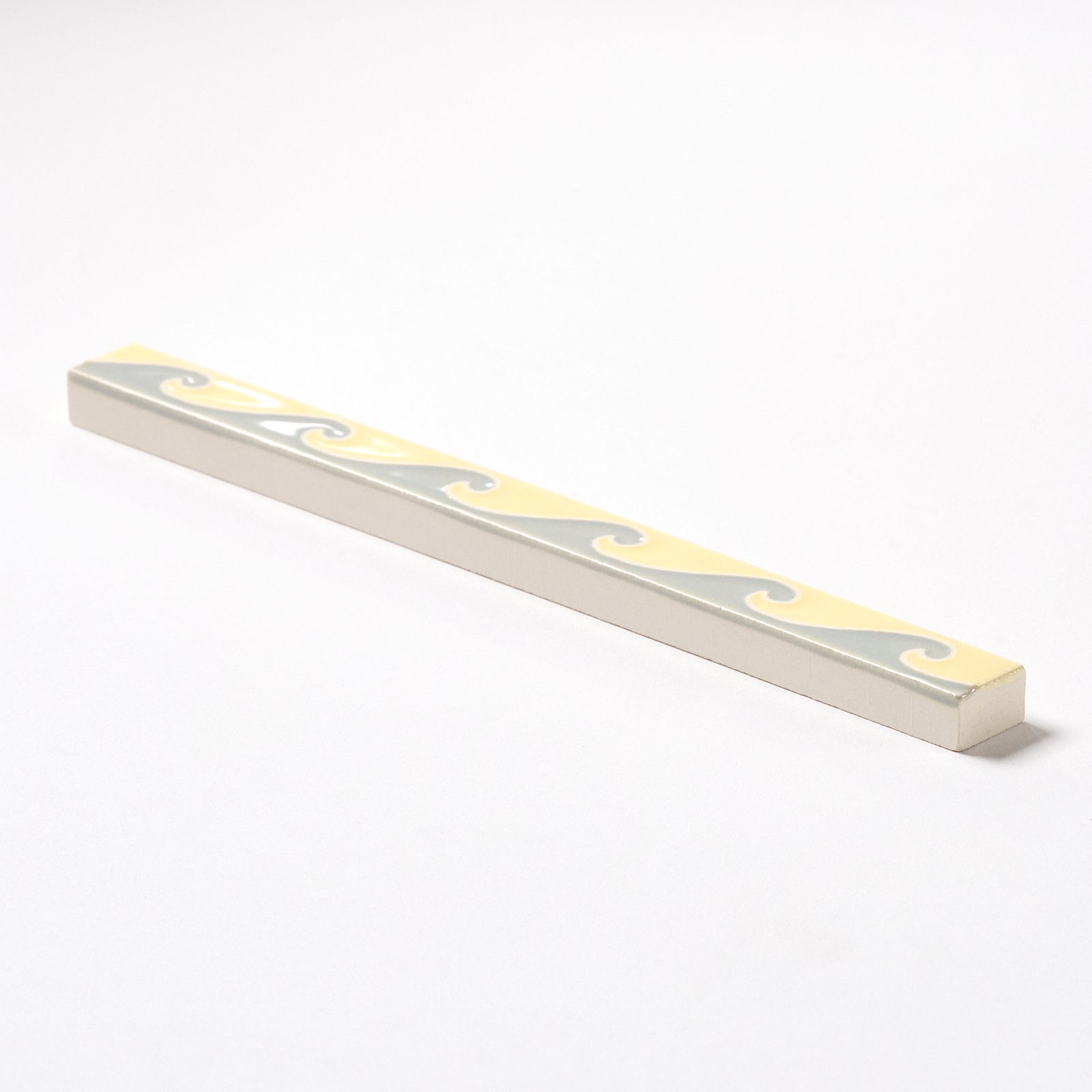 This iconic, historic 1920s trim tile has a yellow and gray colored wave pattern. Each tile is 1/2” wide x 6.25” long, 5/16” thick. Manufactured in the USA by American Encaustic Tiling Company. The tile is still in its original box.