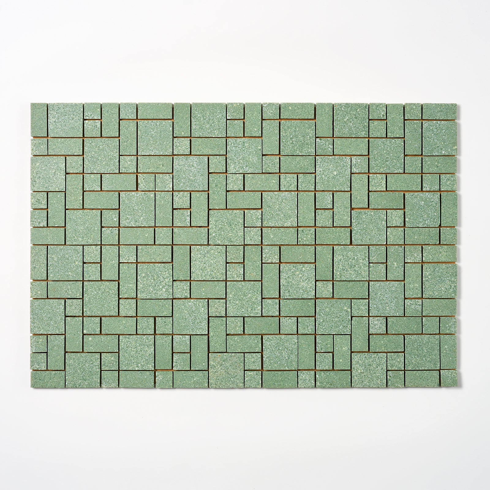 This incredible late 1950s/ early 1960s unglazed floor tile is green in color. Each sheet is 13" x 19.5" x 1/4" thick. Manufacturer is unknown. Pattern is Block Random.