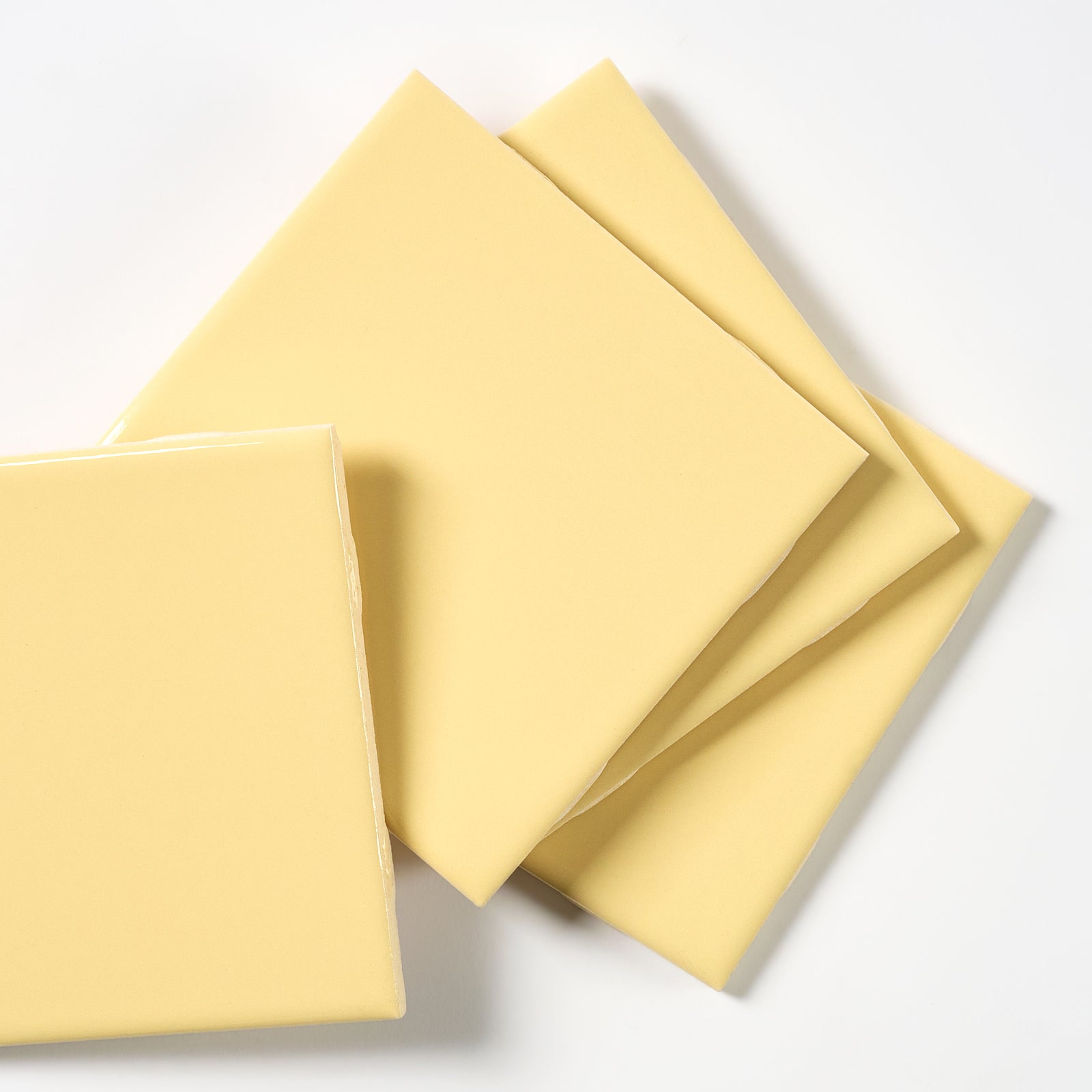Classic glossy yellow wall tile from the 1960s. Matched to the Mid State sample board, the color name is Autumn Yellow. Each tile is 4 5/16” x 4 5/16”, 1/4” thick, manufactured in the USA in the 1960s by Mid State Tile.