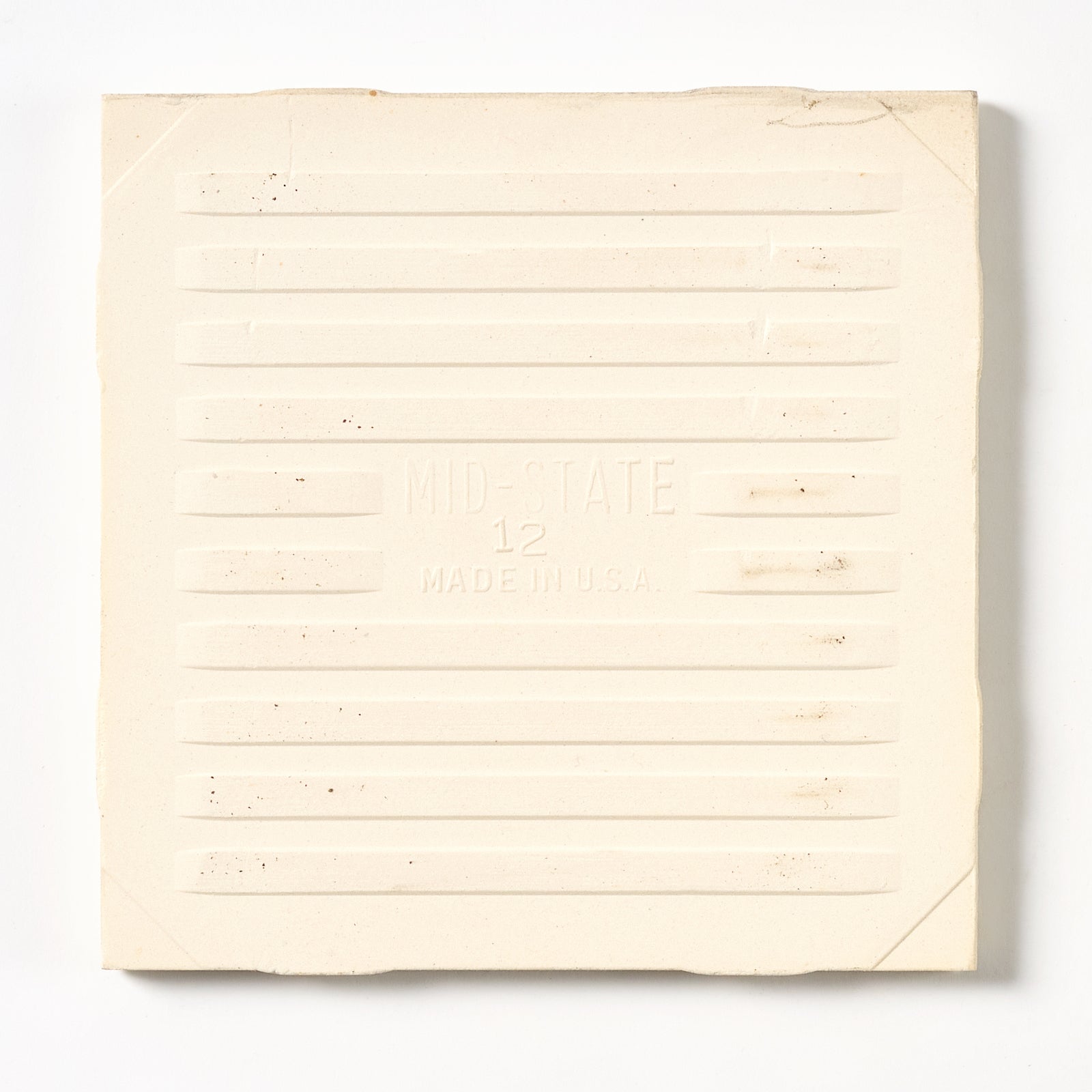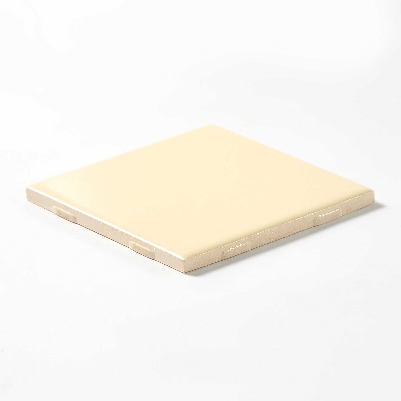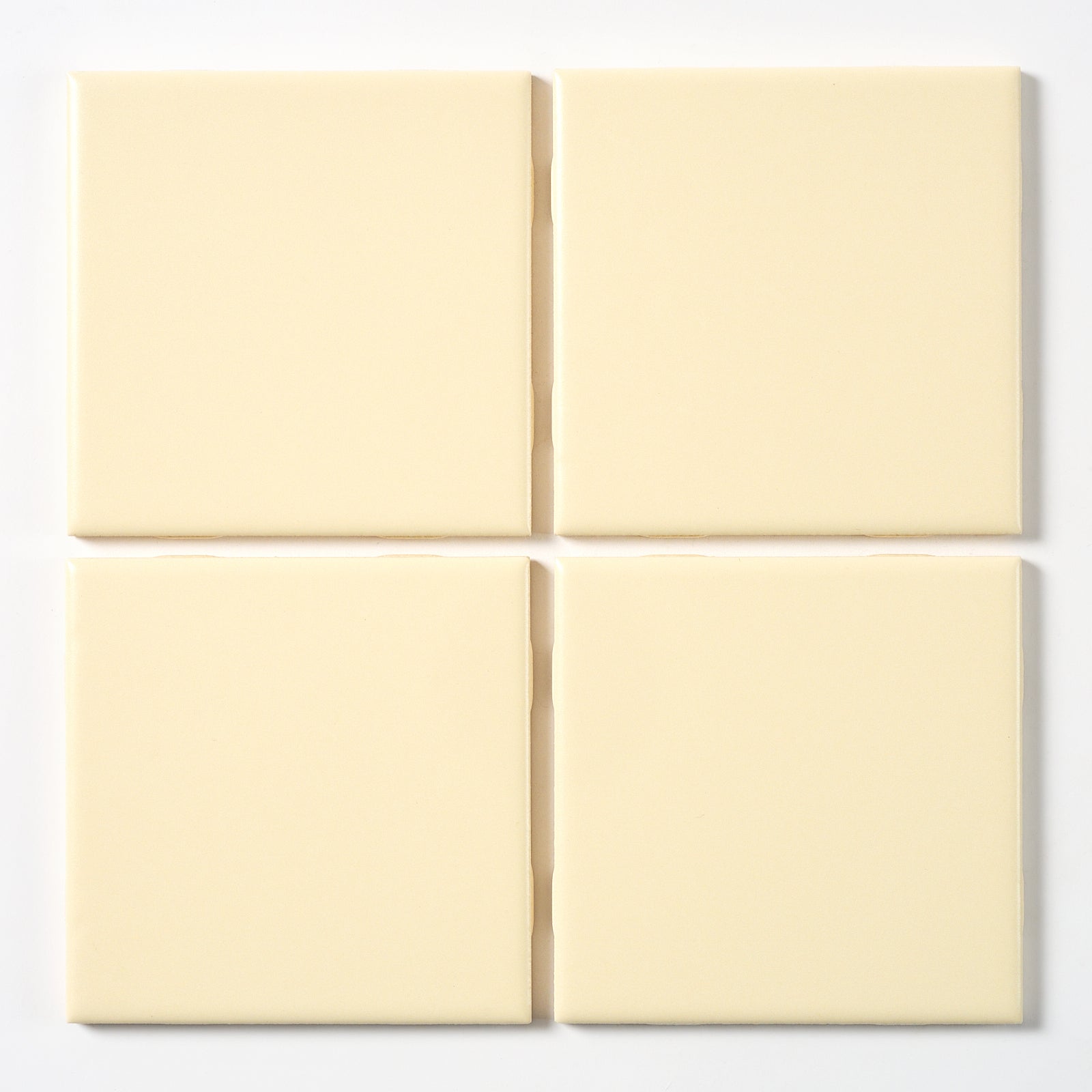 Classic matte ivory wall tile from the 1960s. The exact color name is unknown. Each tile is 4 5/16” x 4 5/16”, 1/4” thick, manufactured in the USA in the 1960s by Mid State Tile.