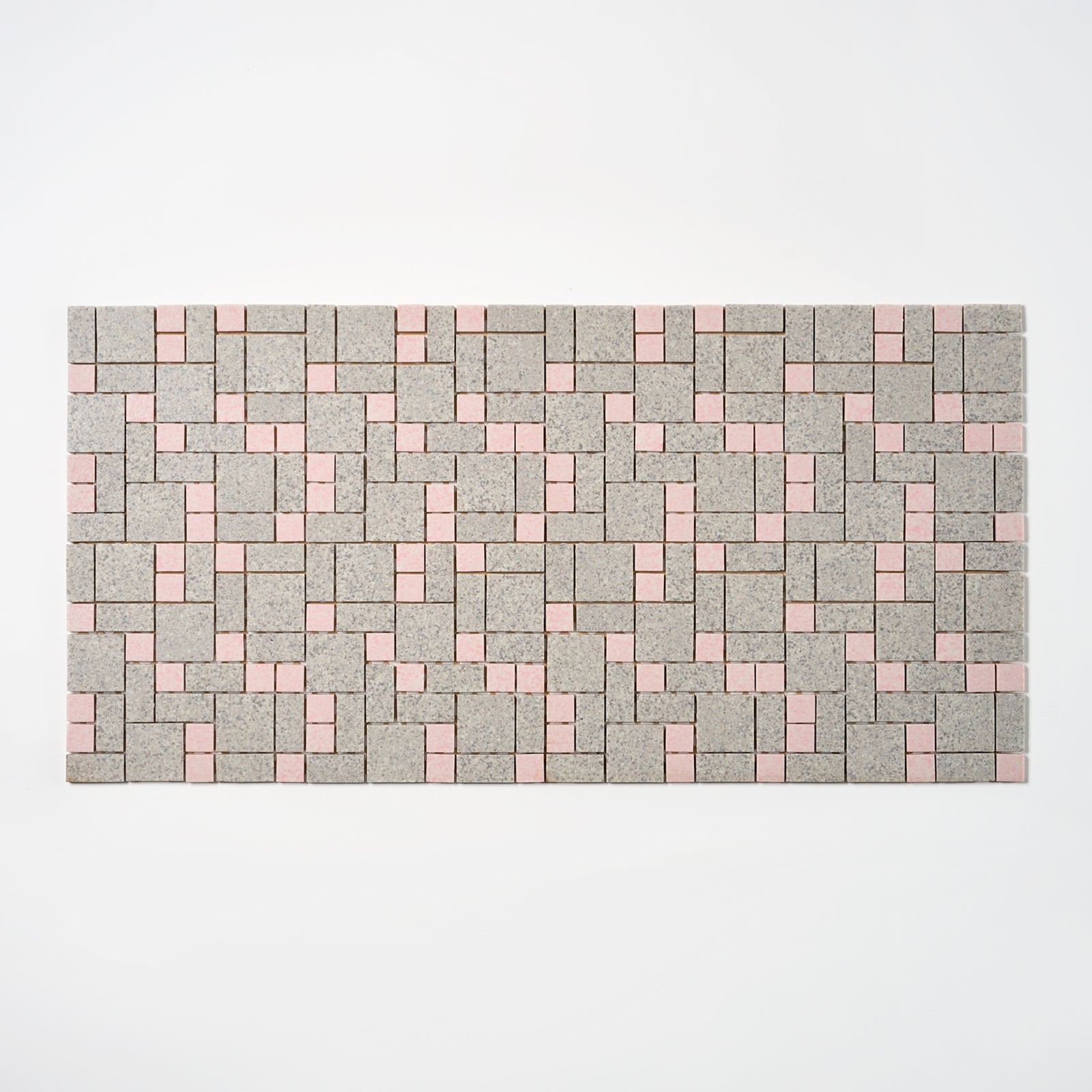 This is a pink and gray random floor tile, each sheet is 13” x 26”, 1/4” thick, manufactured in the USA by American Olean in the 1970s.