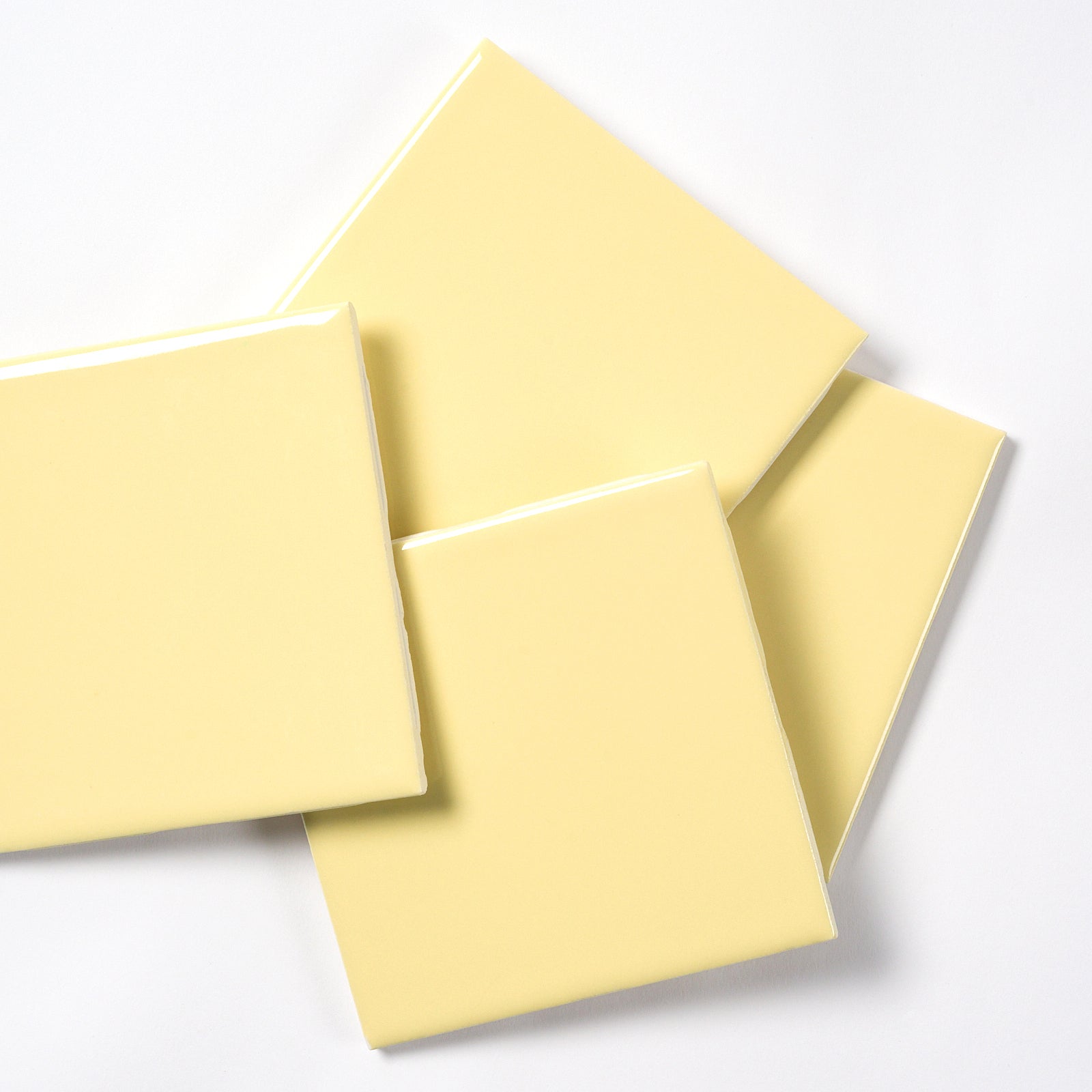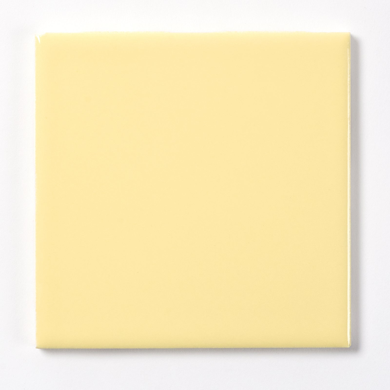 This glossy ceramic wall tile is called Mancru Yellow, color 46, shade 555. Each tile is 4 3/8” X 4 3/8” , 1/4” thick. Manufactured in the USA in the 1970s by FLORIDA TILE.