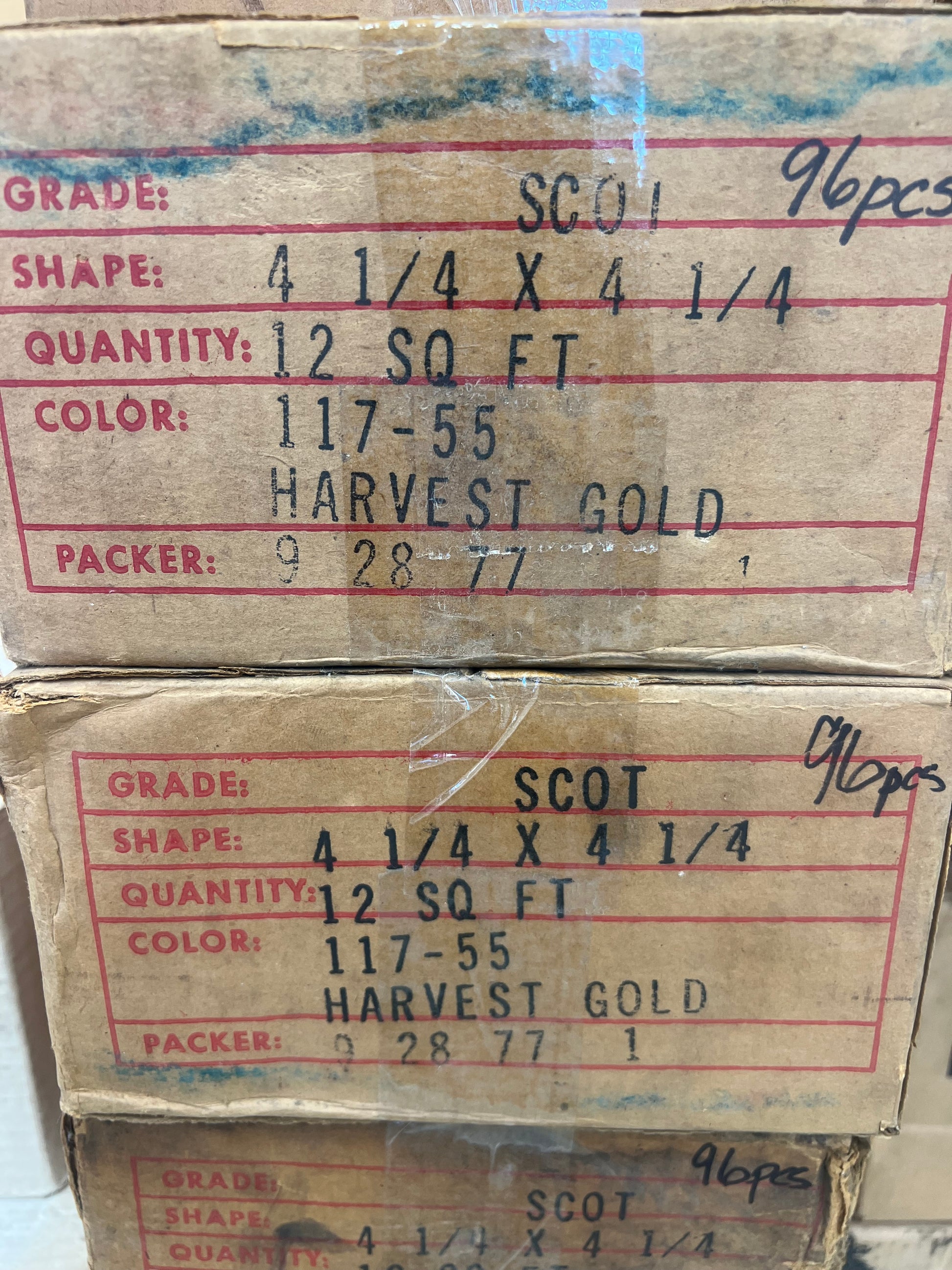 Classic Harvest Gold wall tile from the 1970s. Color number is 117-55. Each tile is 4 3/8” x 4 3/8”, 5/16” thick, manufactured in the USA in the 1970s by Mid State Tile. Boxes are dated 9.28.77.