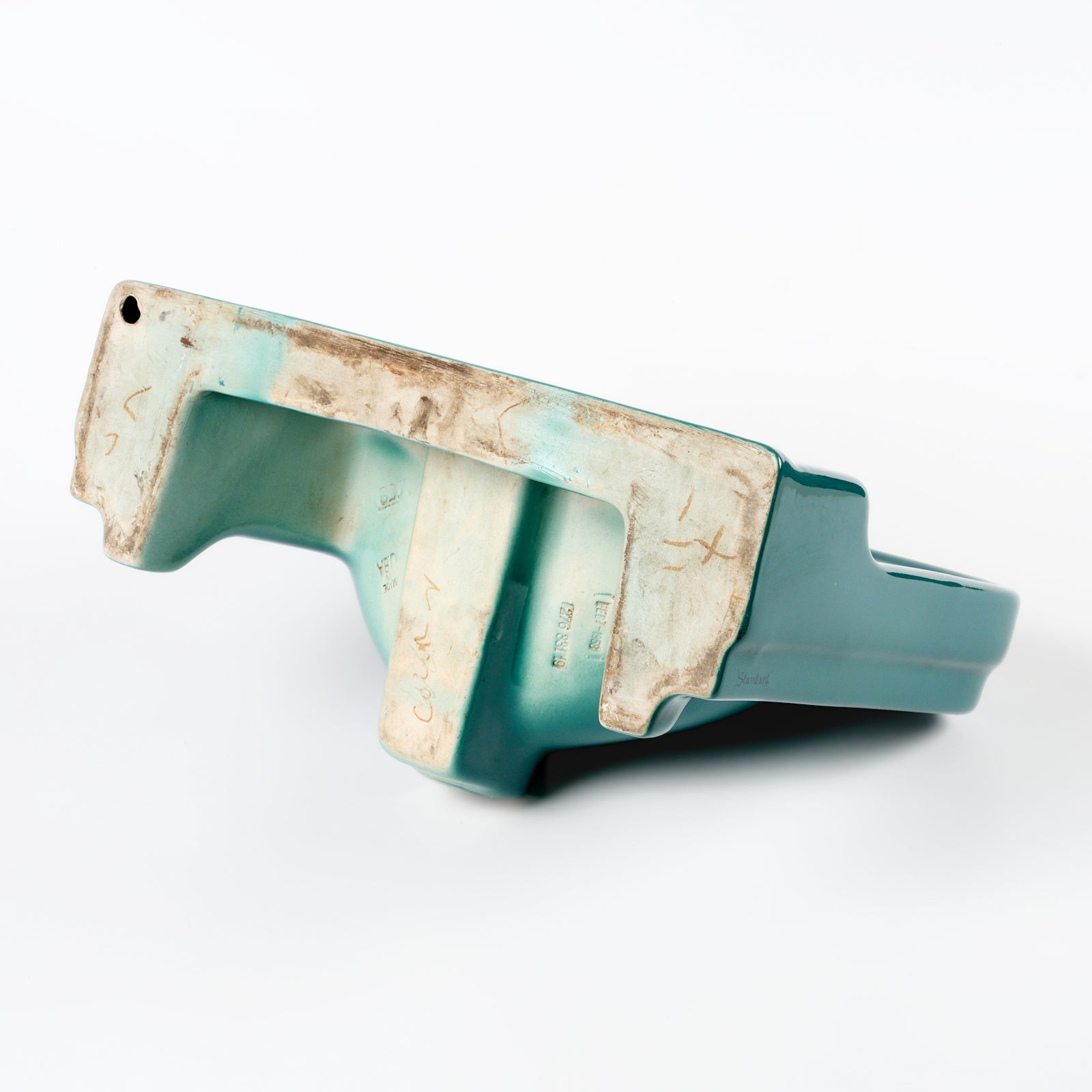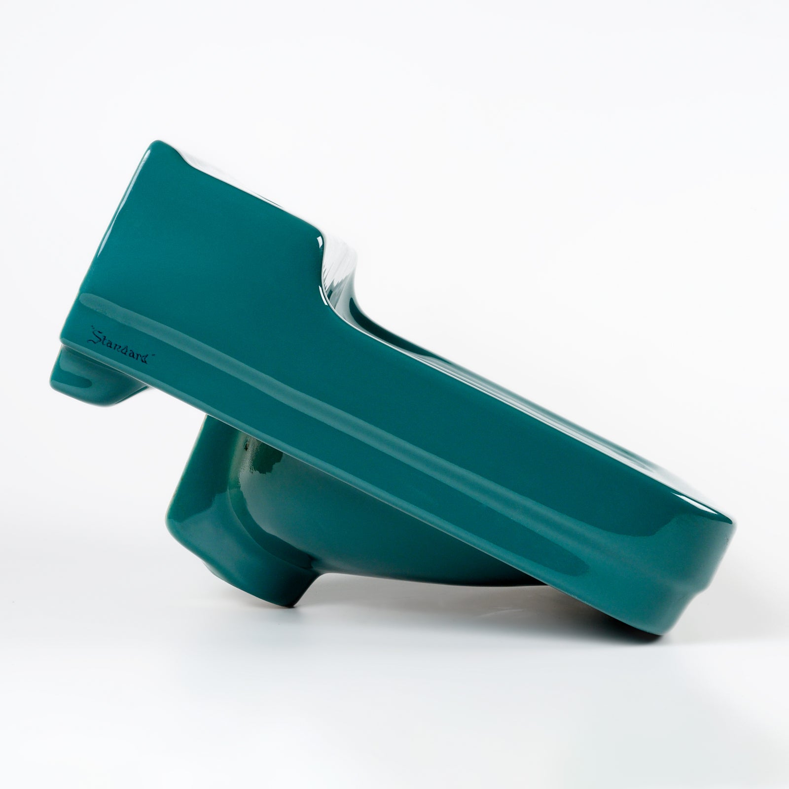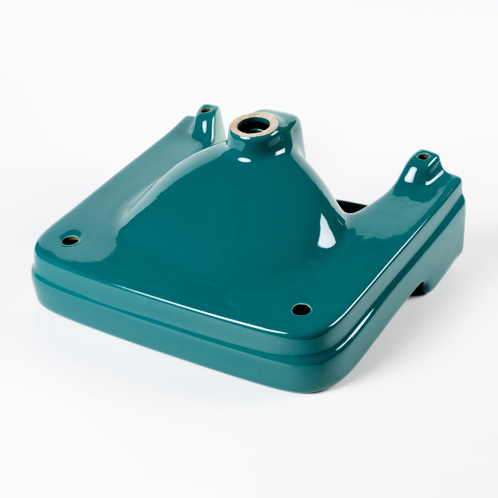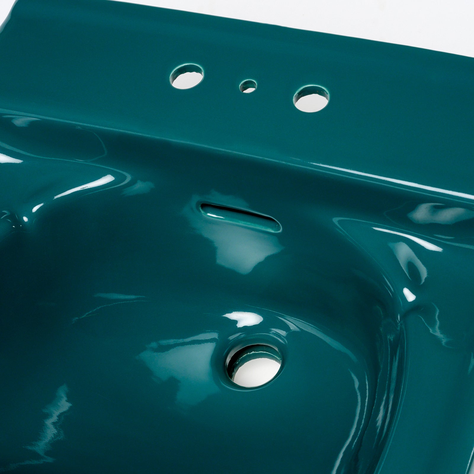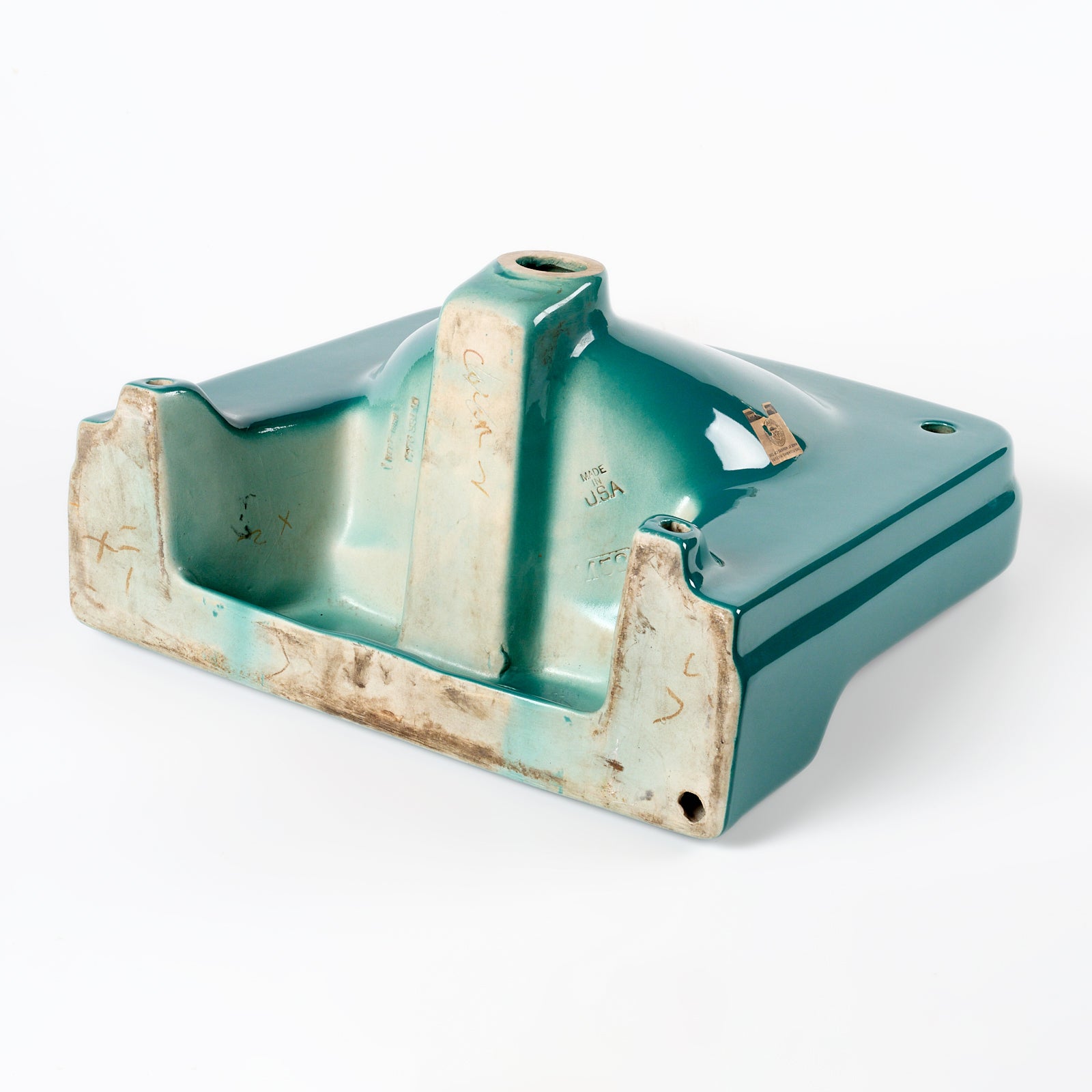 This vitreous china wall hung sink is teal in color. This sink is 19" x 17” with 4" centers. Manufactured by American Standard in the USA in the 1970s.
