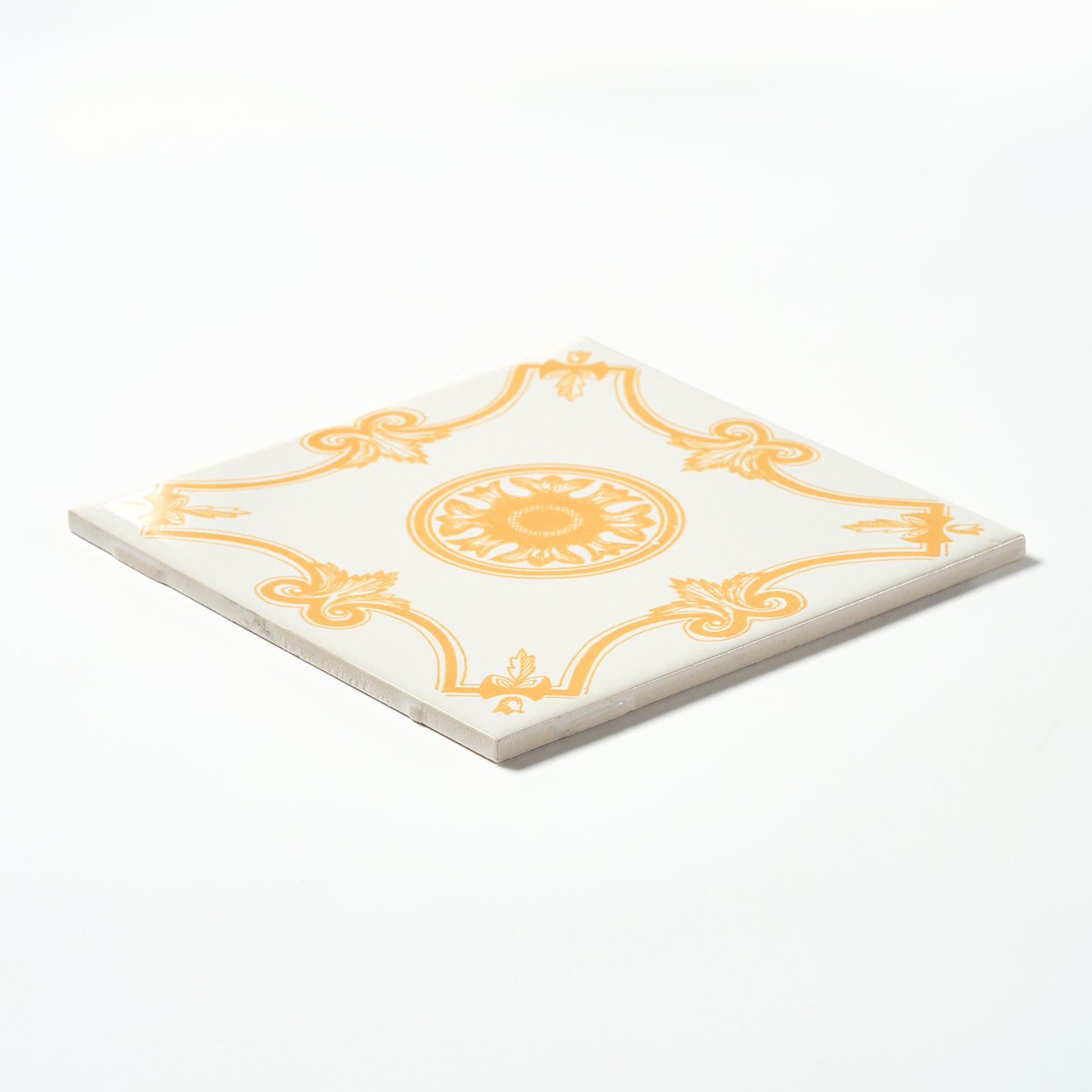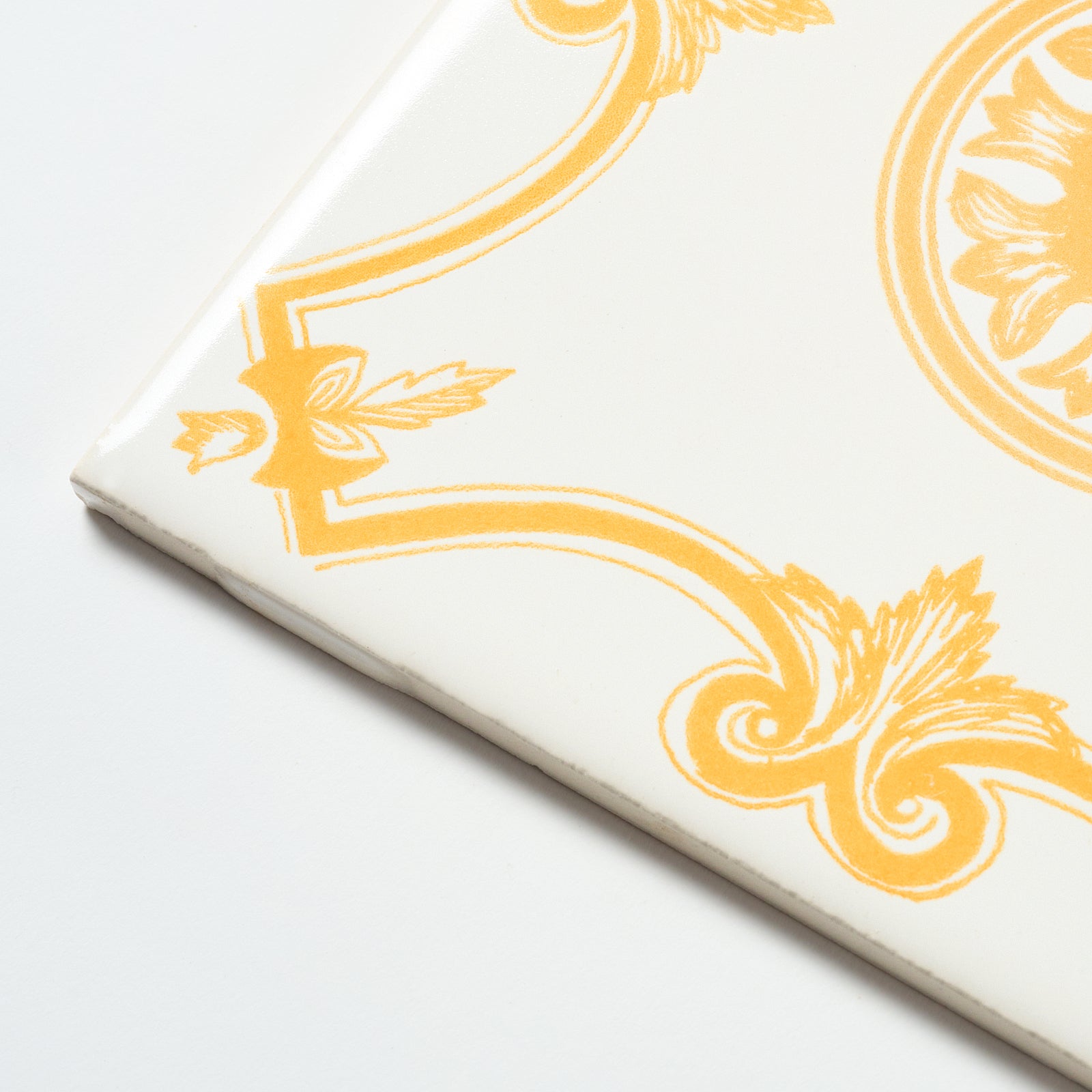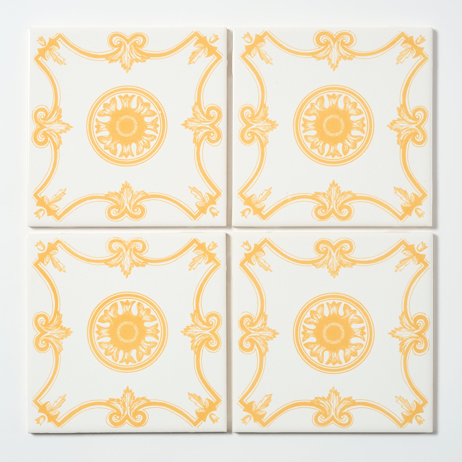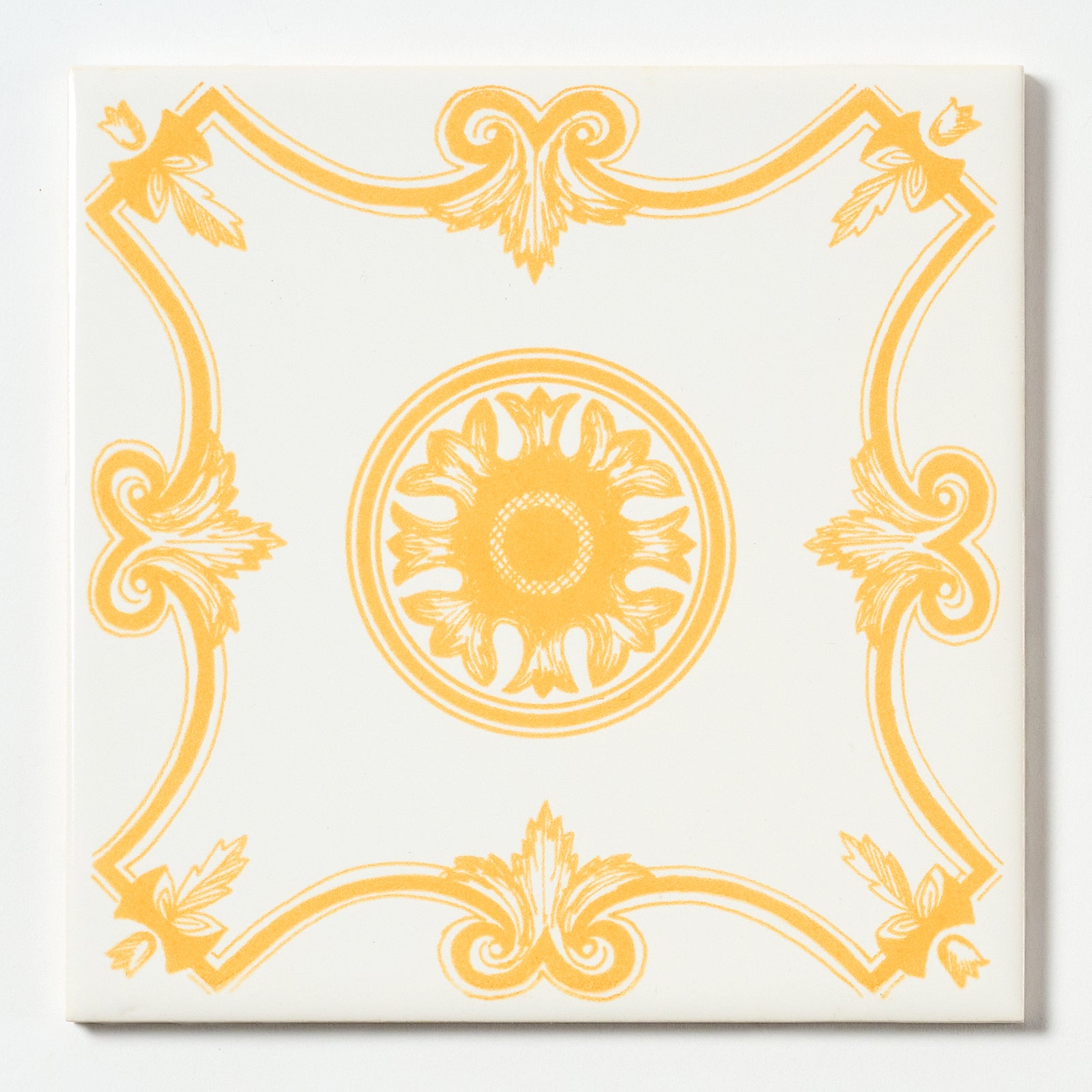This fine quality porcelain wall tile has a background color of white with a vintage yellow pattern named KM 2 Royale/ Marigold from the Mayfair Series, each tile is 6” x 6”, 3/16” thick, manufactured in England by H. R. Johnson in the 1970s.