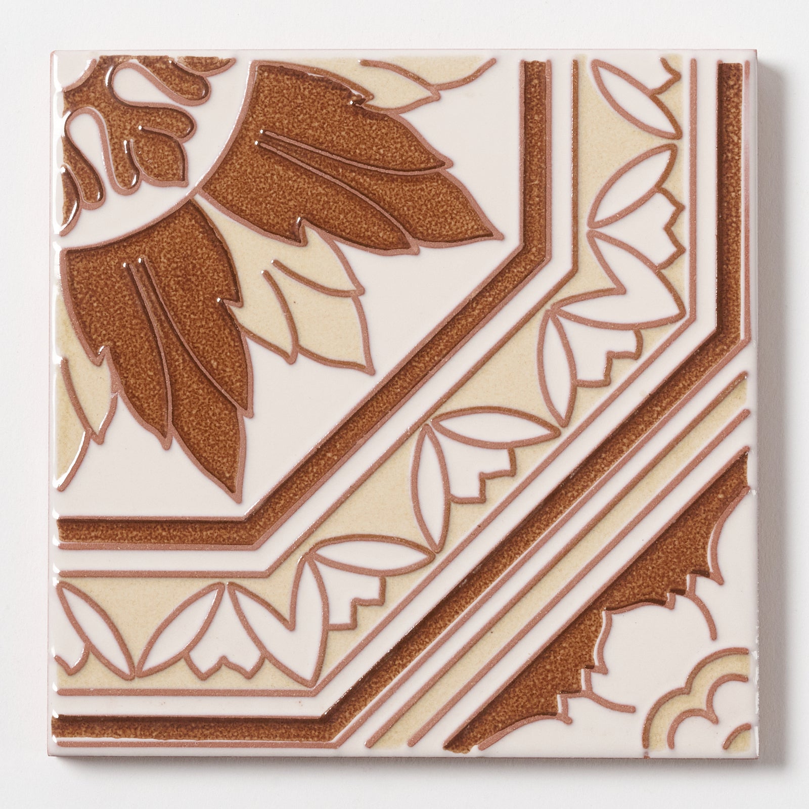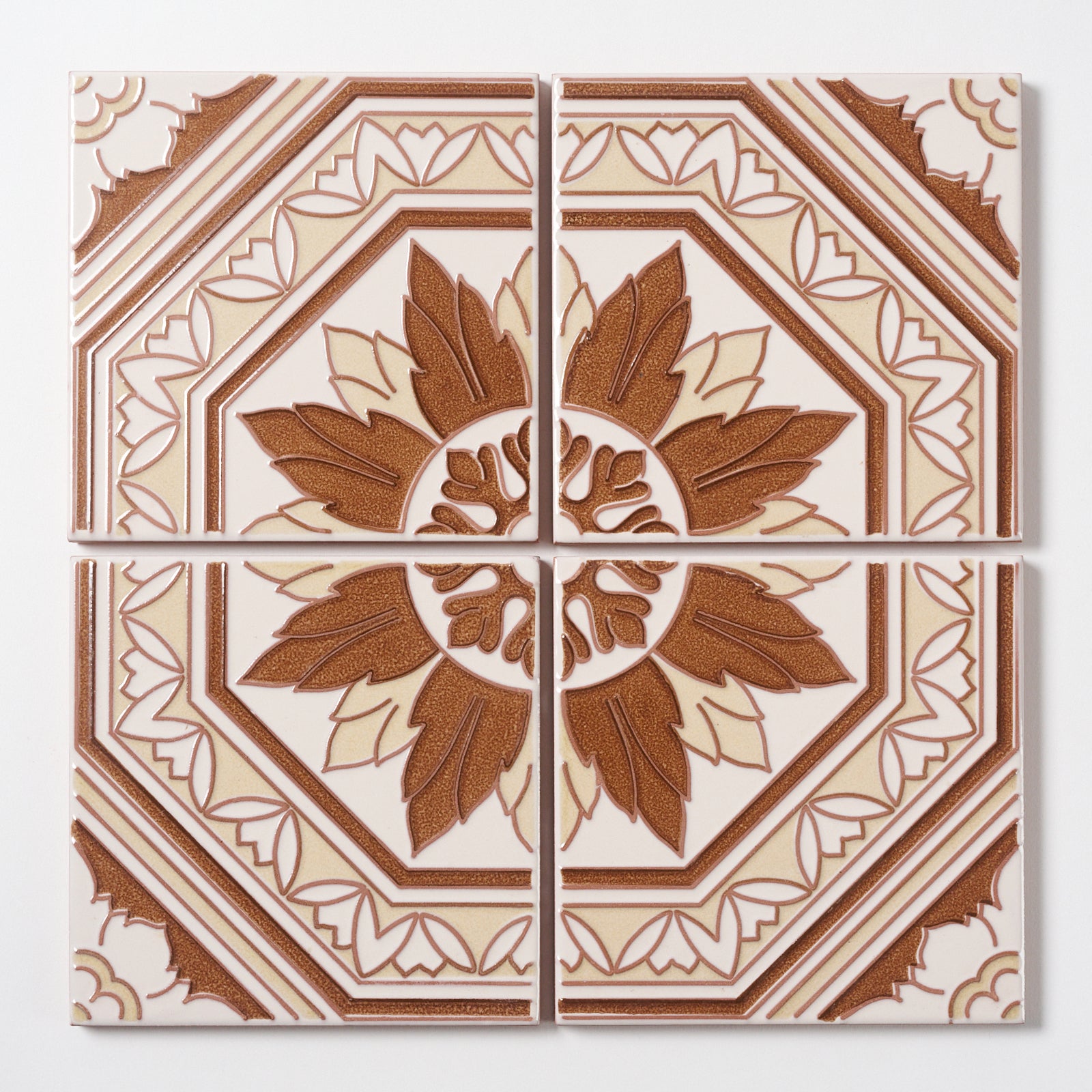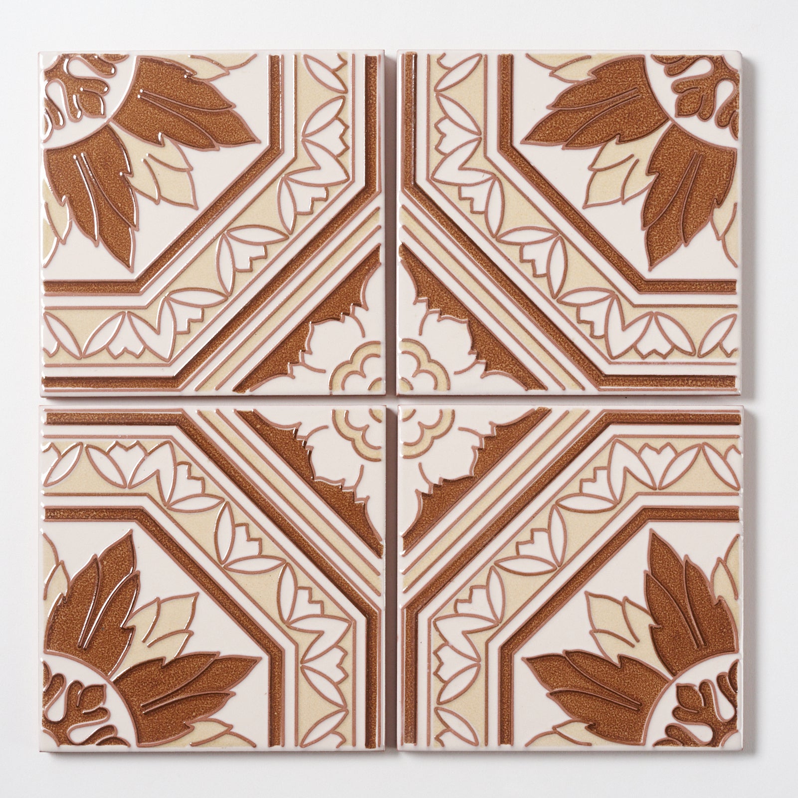 This high quality wall tile is a floral raised relief pattern. It is brown with beige accents in color, each tile is 6” x 6”, 5/16” thick, manufactured in Italy in the 1970s.