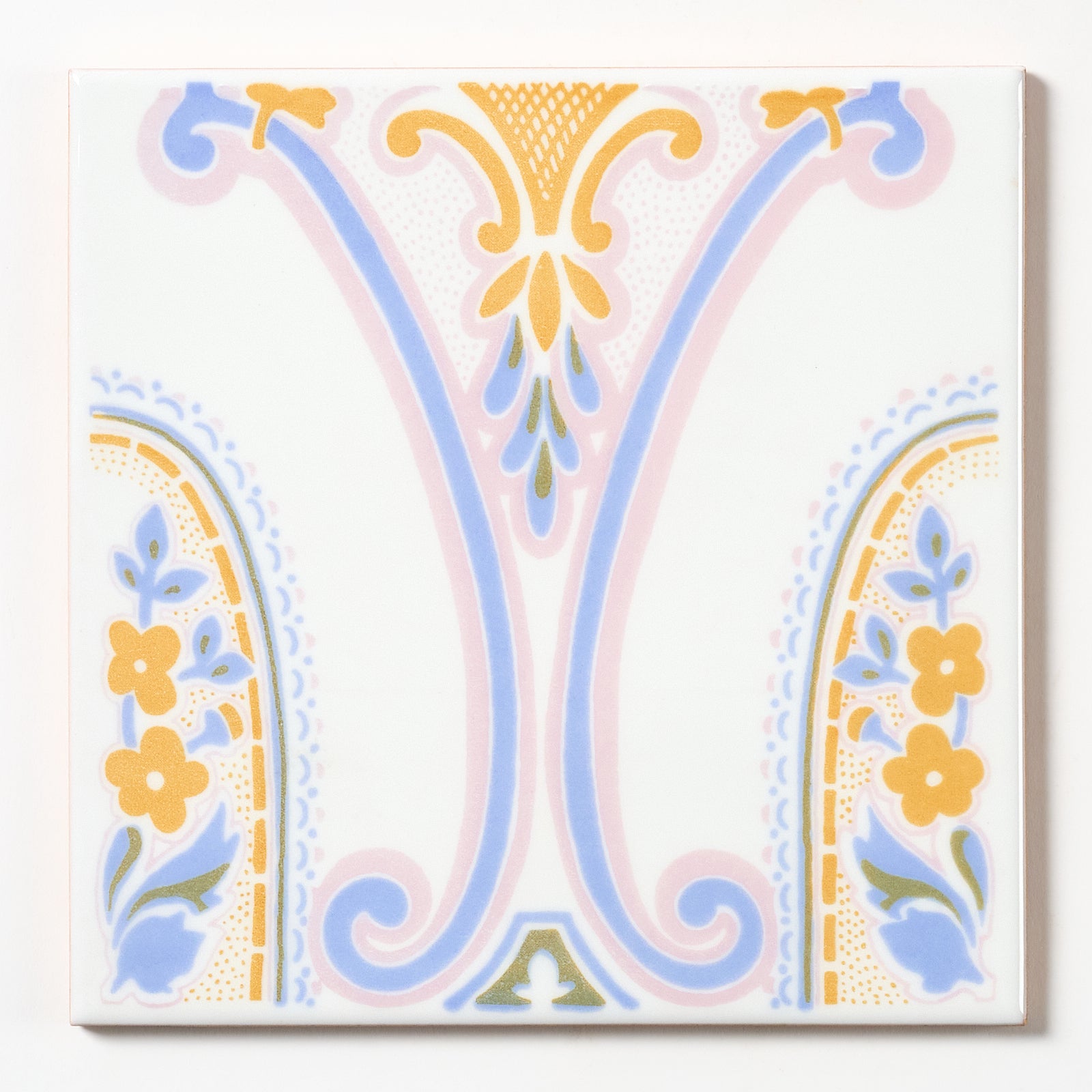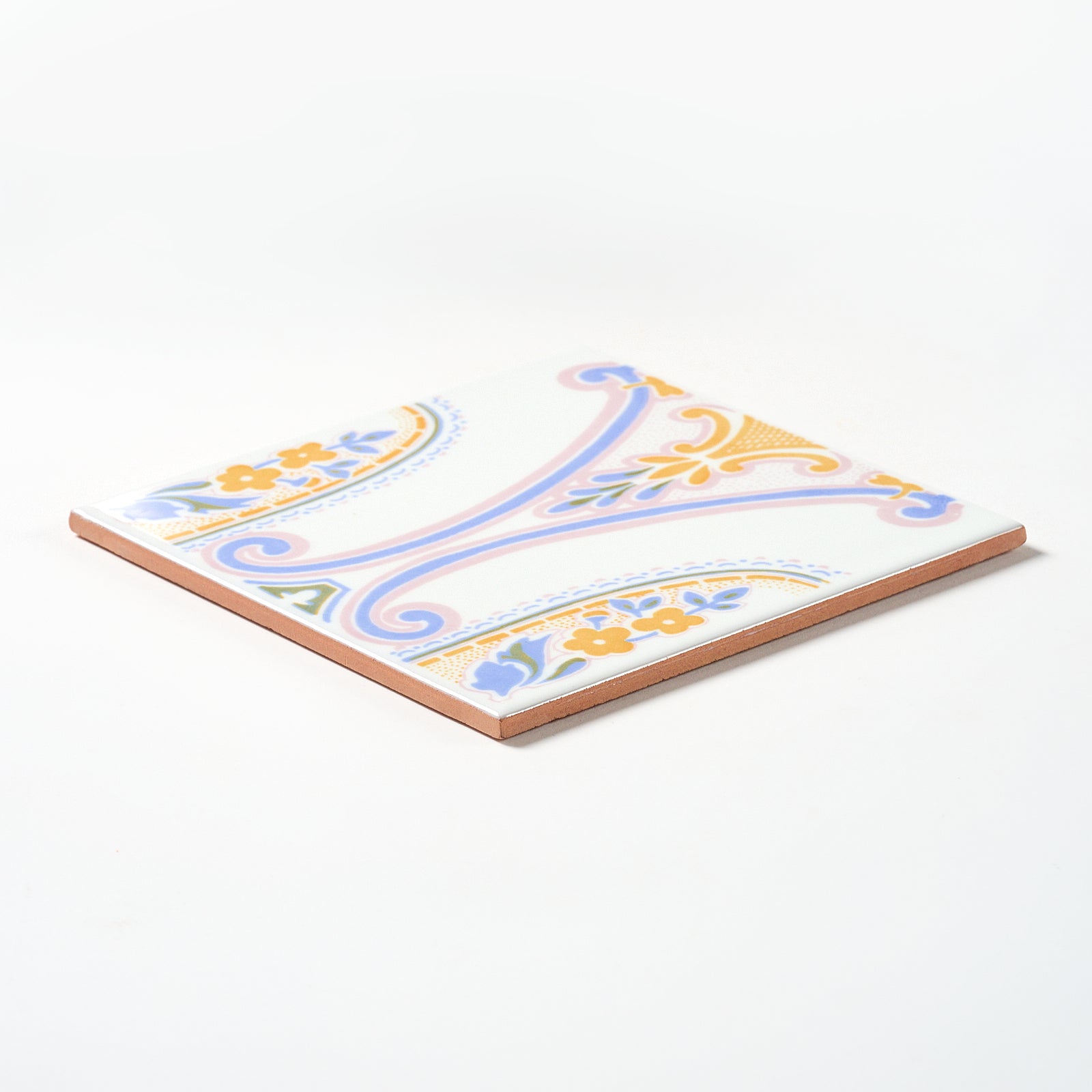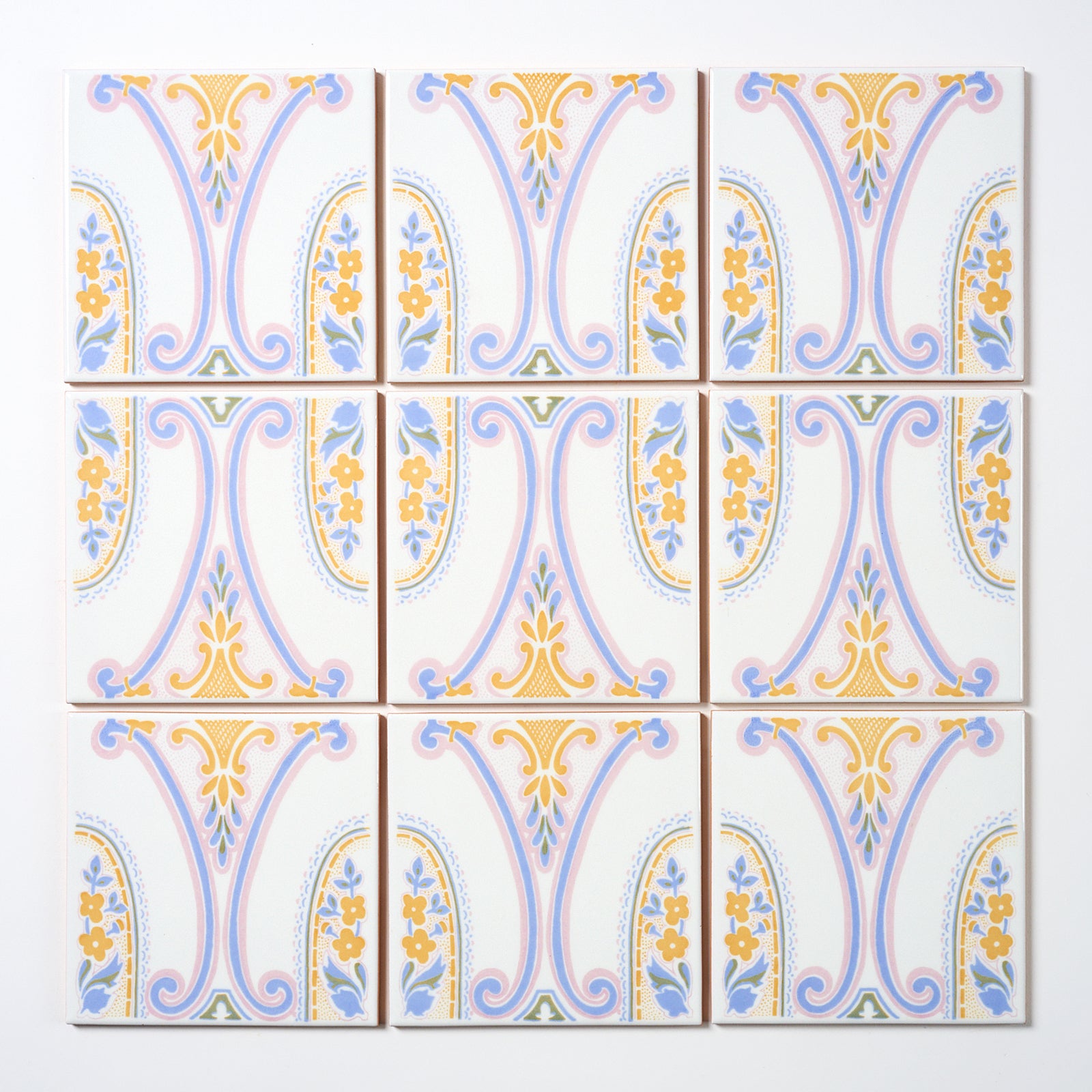 This glazed clay wall tile has a background color of white with a beautiful rococo revival pattern in periwinkle, yellow and pink, each tile is 6” x 6”, 3/16” thick, manufactured in Italy by Ragno Ceramiche in the 1970s.
