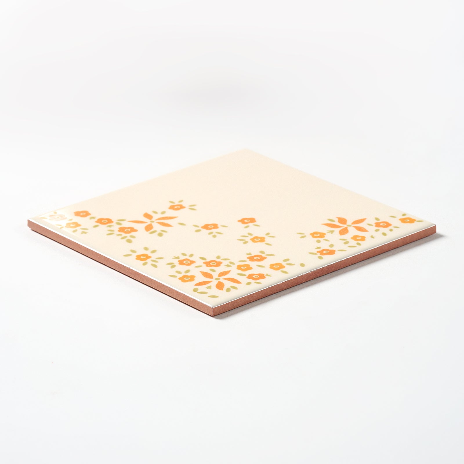 This glazed clay wall tile has a background color of ivory with a delicate orange floral pattern, each tile is 6” x 6”, 3/16” thick, manufactured in Italy by Ragno Ceramiche in the 1970s.