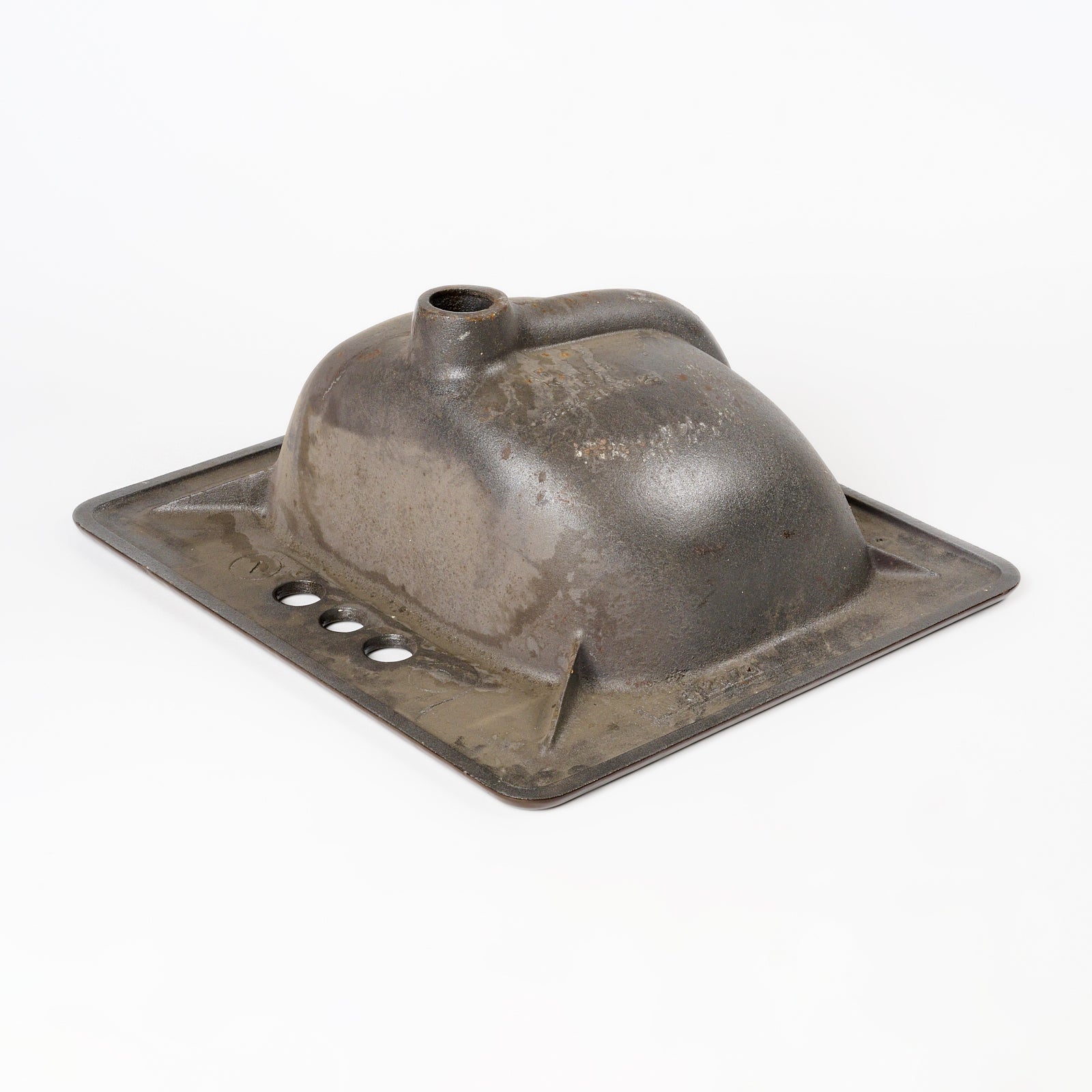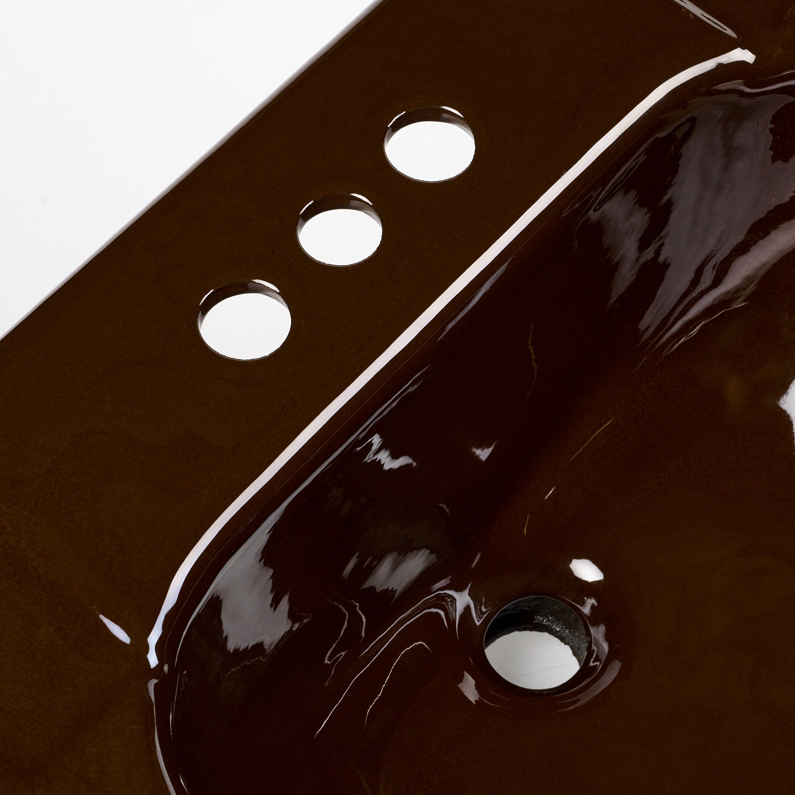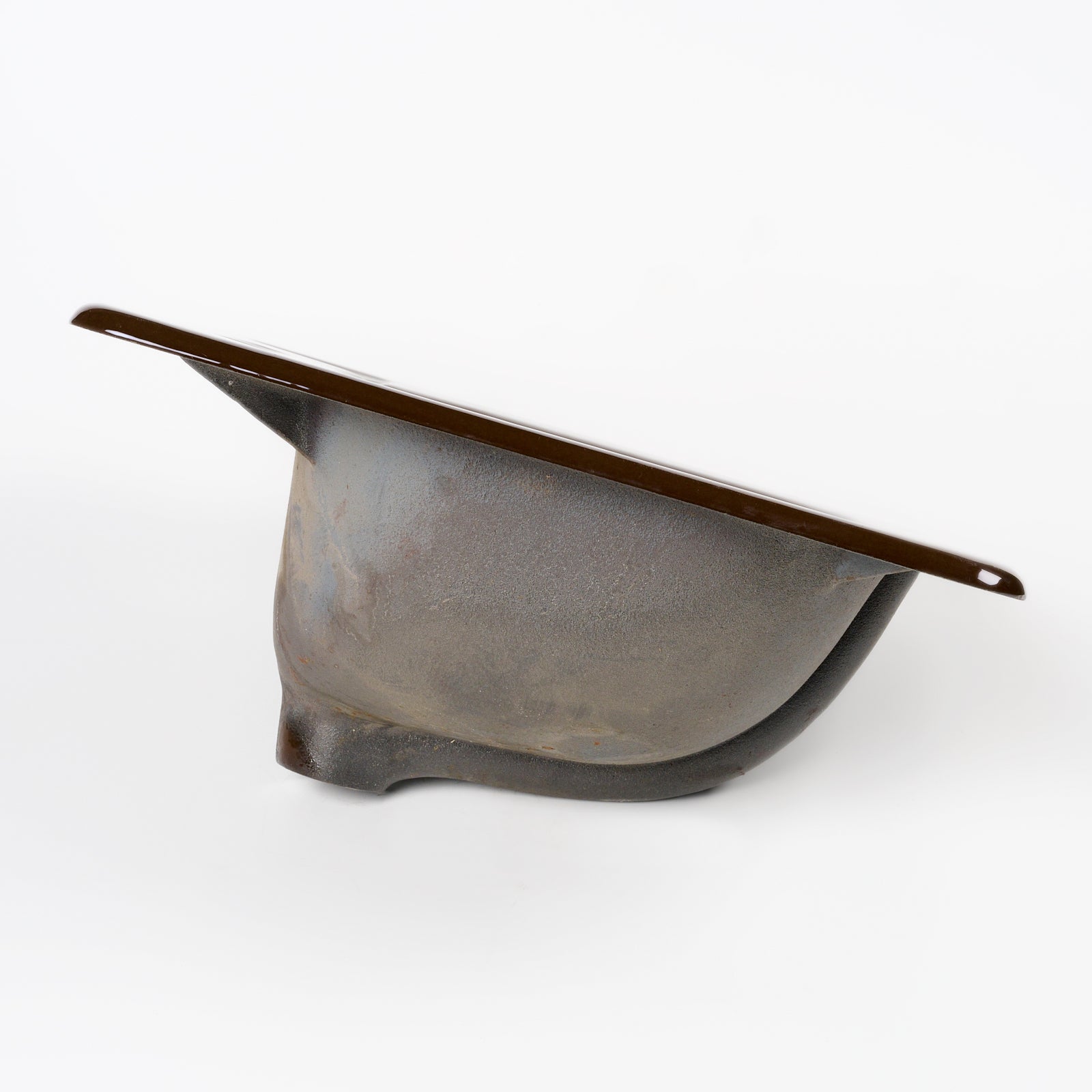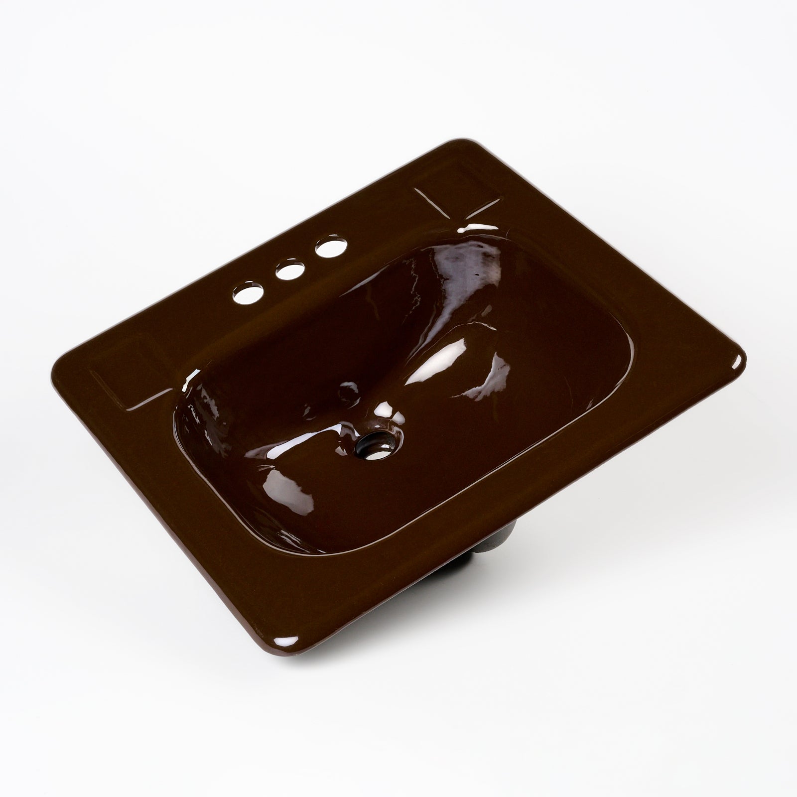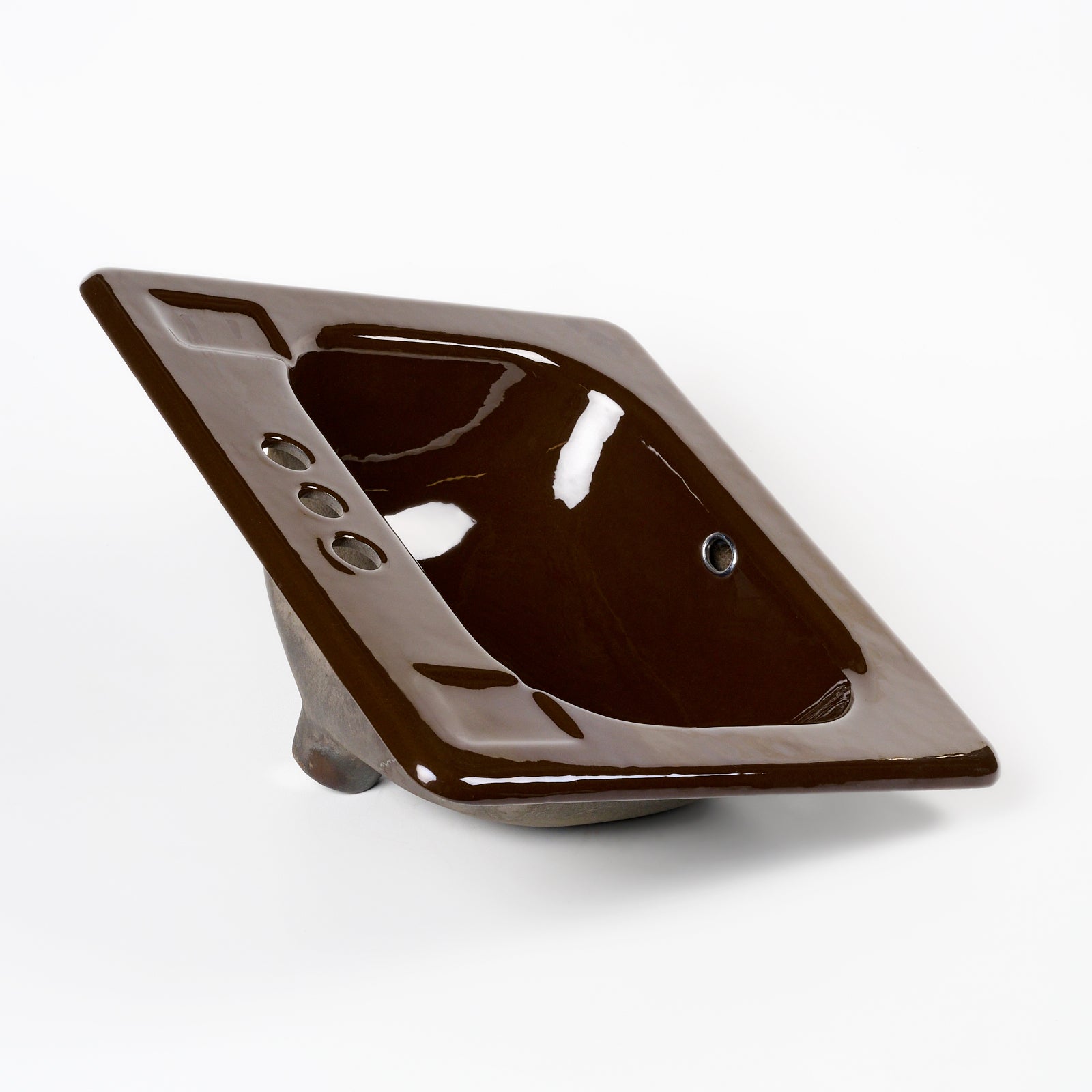 This porcelain enameled cast iron self rimming sink is a style called Tahoe with the color name Espresso. This sink is 21" x 19” with 4" centers. Manufactured in the USA by Kohler in the 1970s.