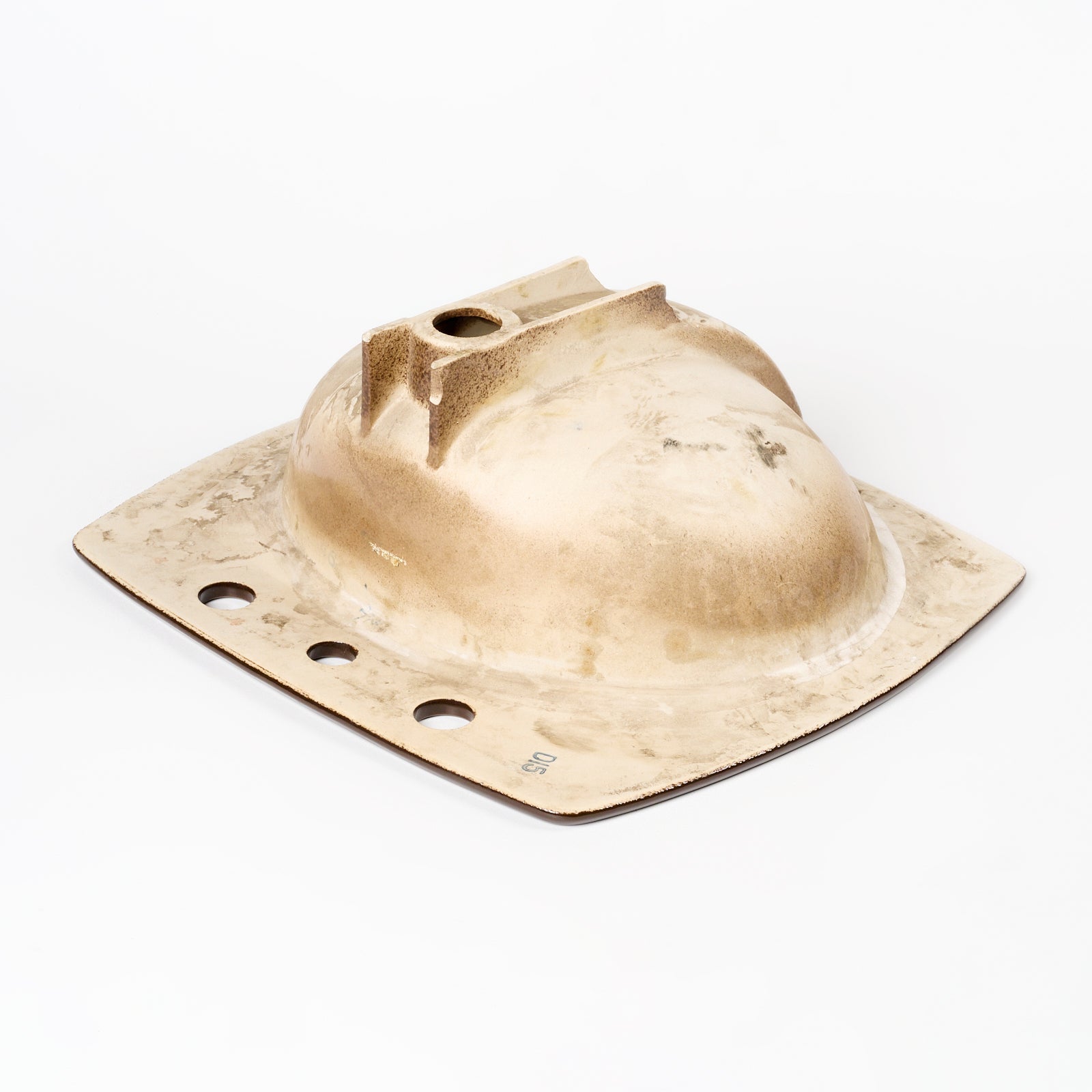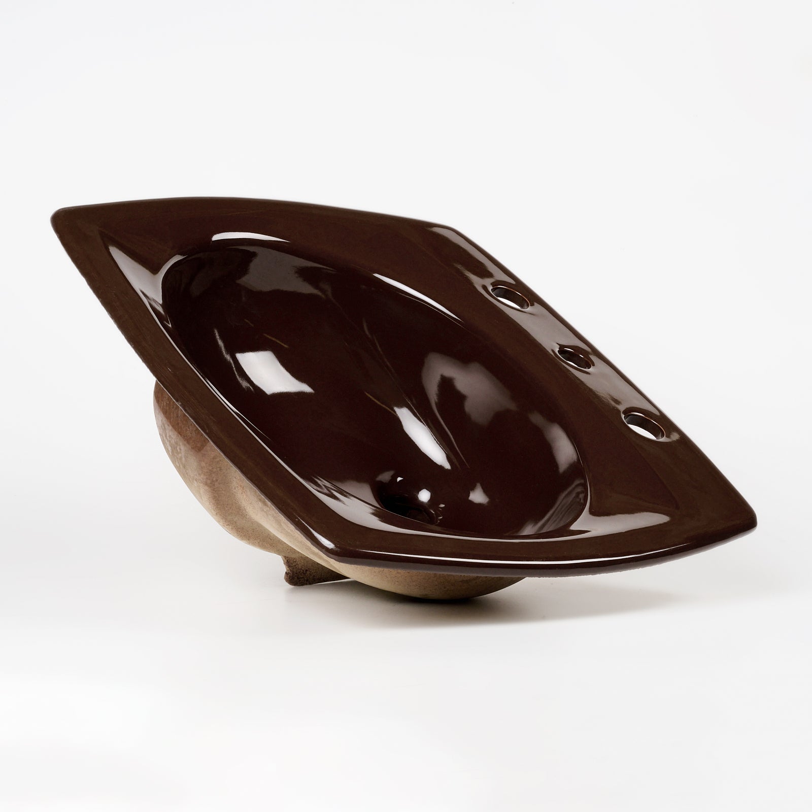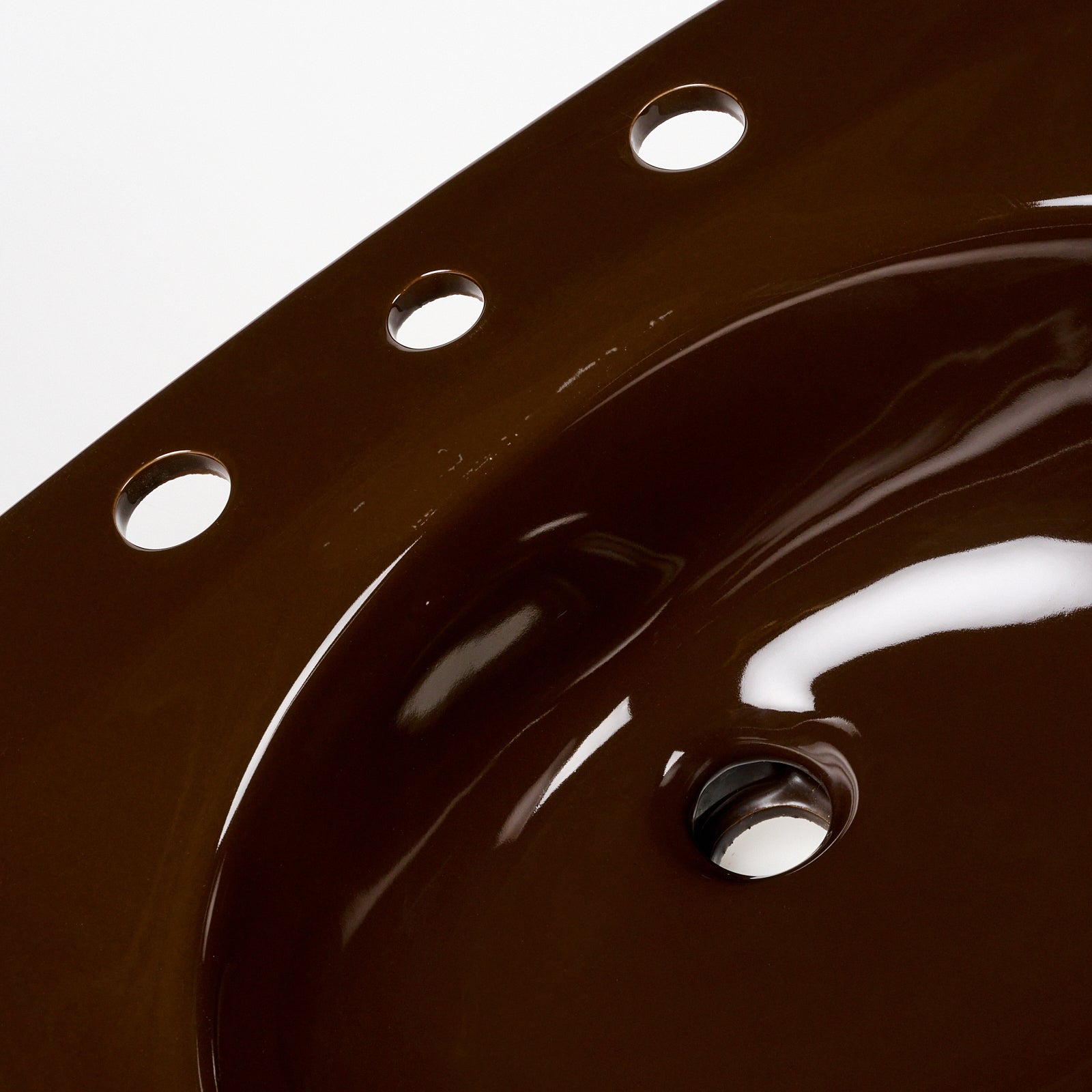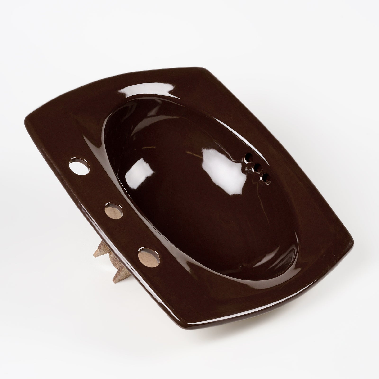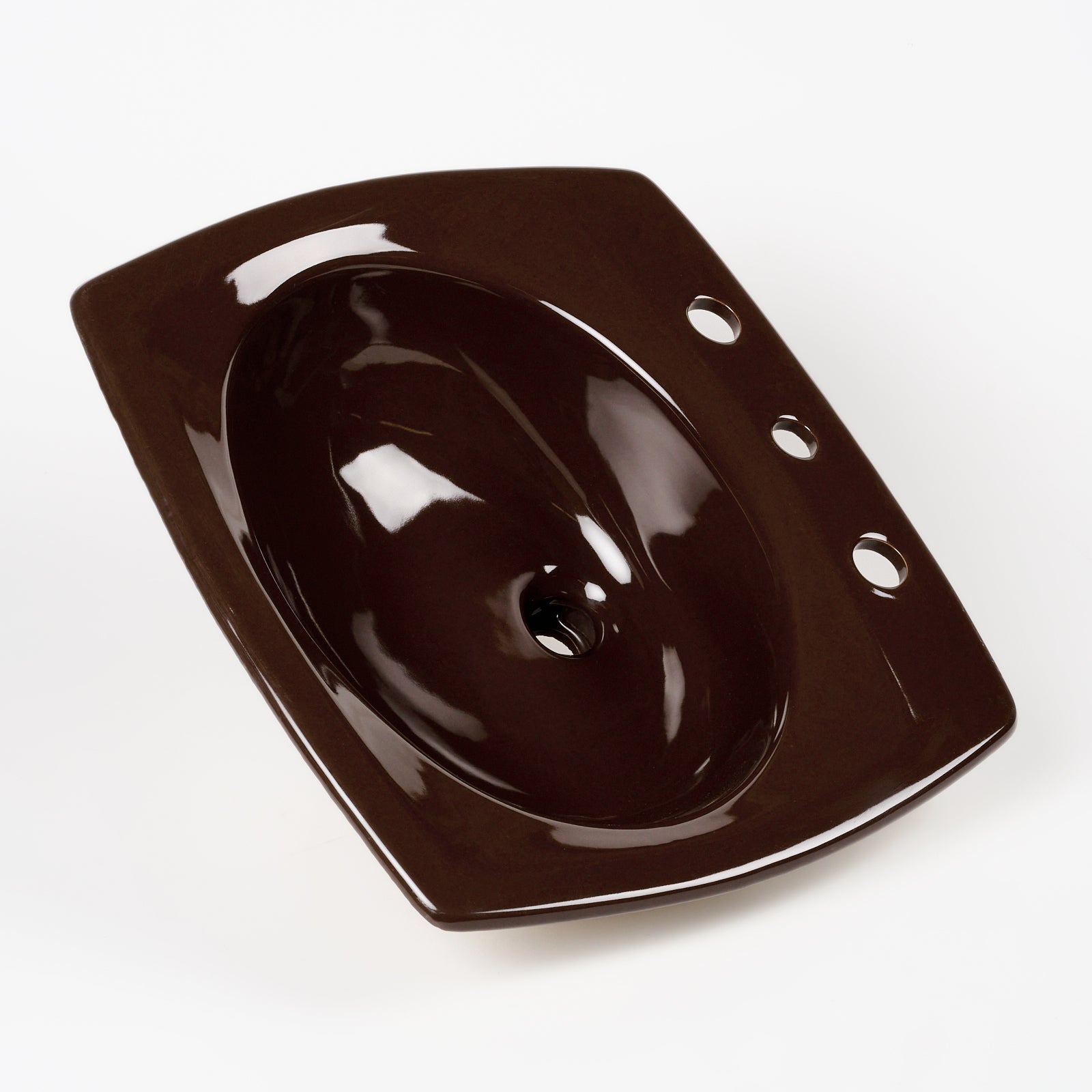 This vitreous china self rimming sink is a style called Rondelle with the color name Espresso. This sink is 21" x 19” with 8" centers. Manufactured in the USA by Kohler in the 1970s.