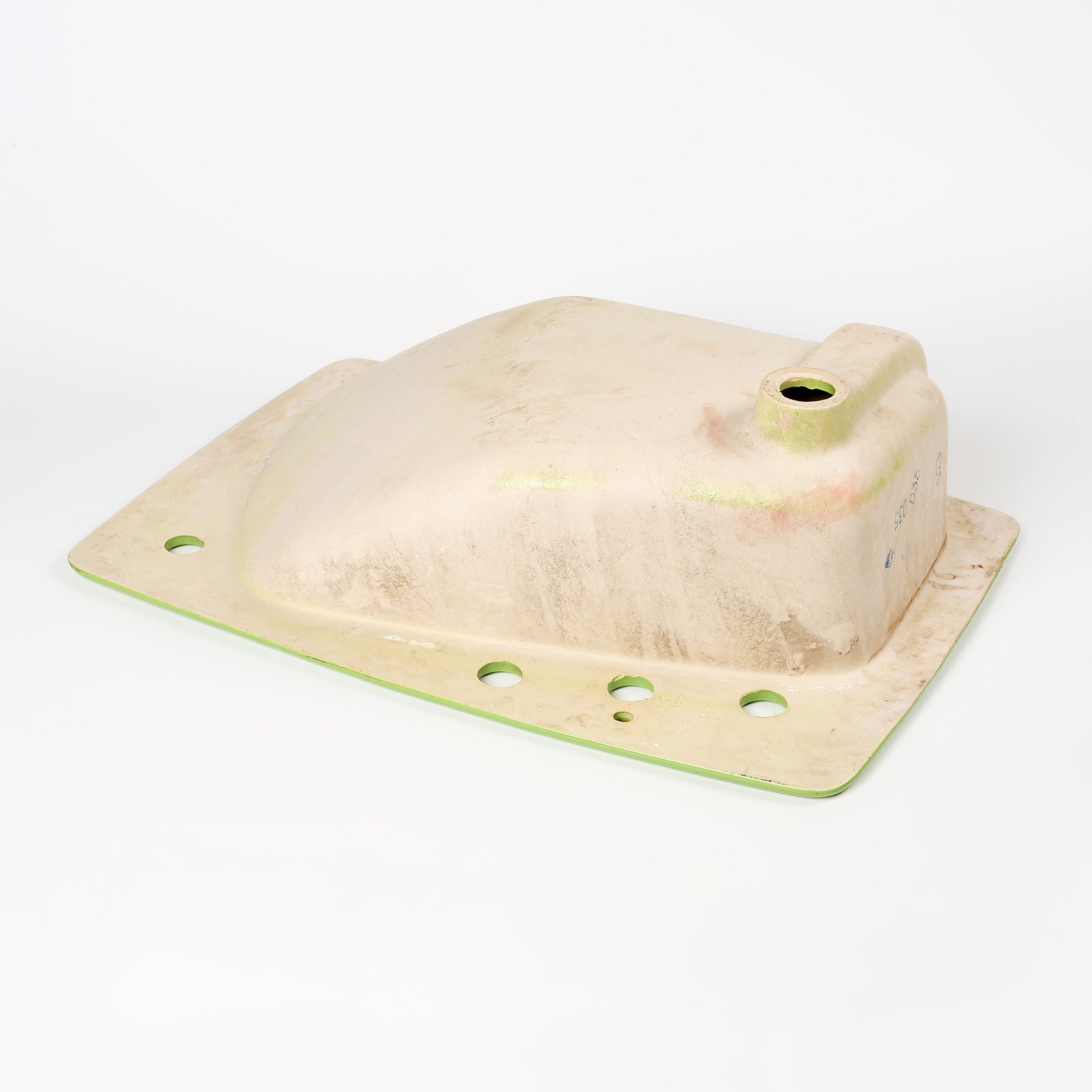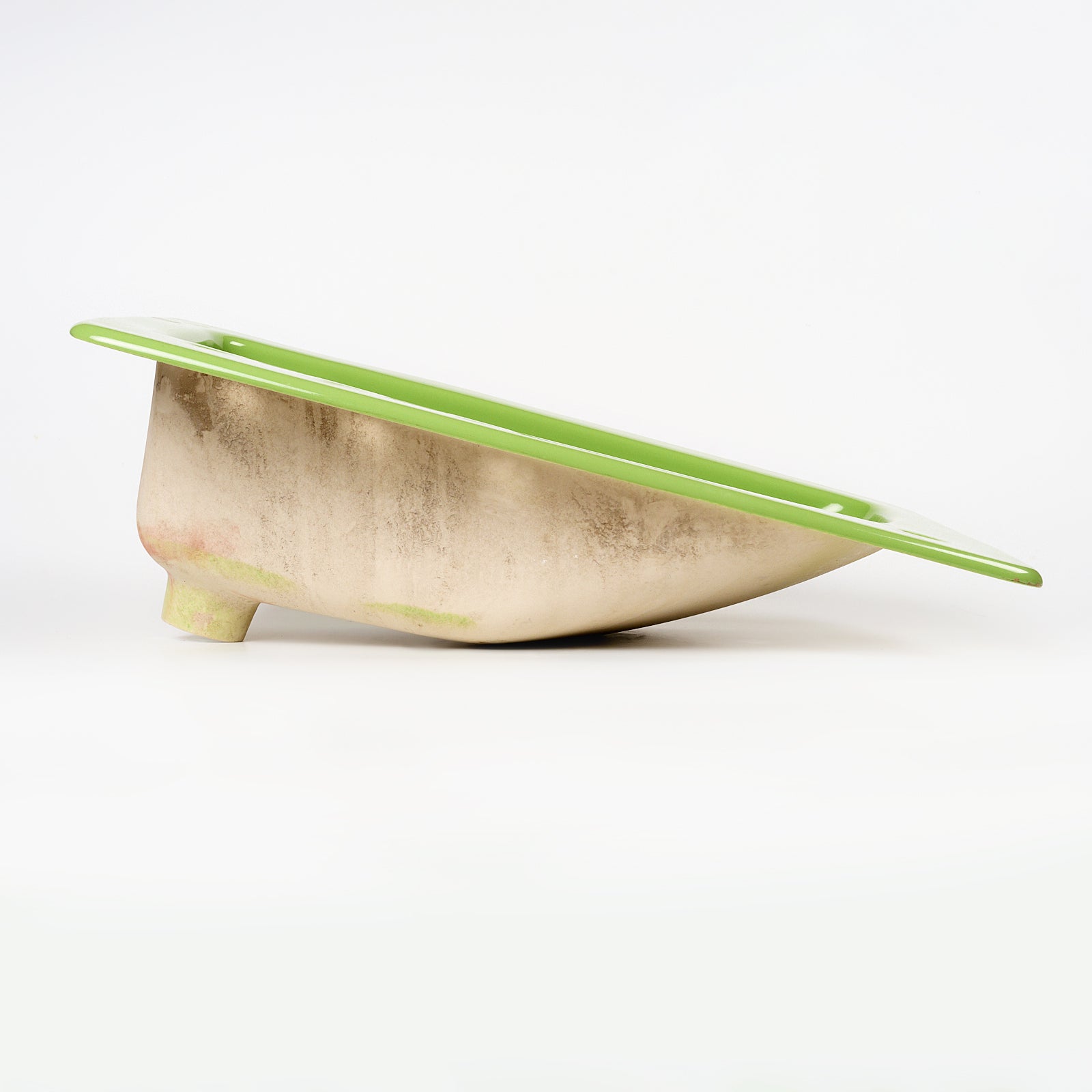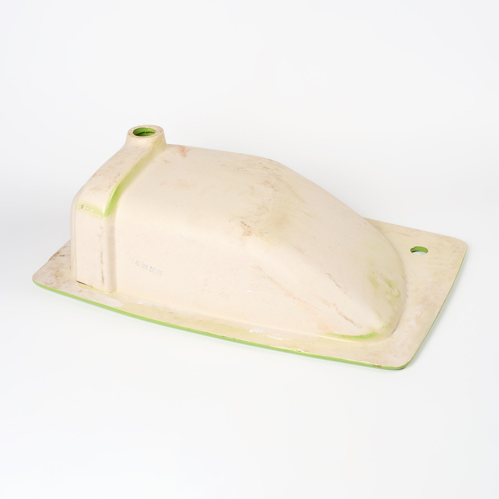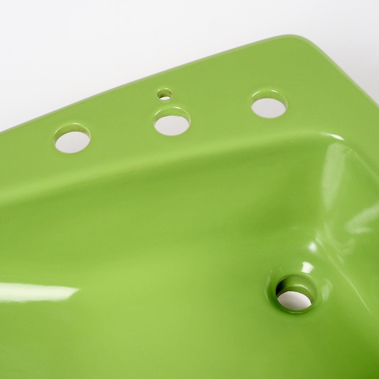 This vitreous china self rimming sink is a style called Lady Vanity with the color name Fresh Green. This sink is 28" x 19” with 8" centers. Manufactured in the USA by Kohler in the 1970s.
