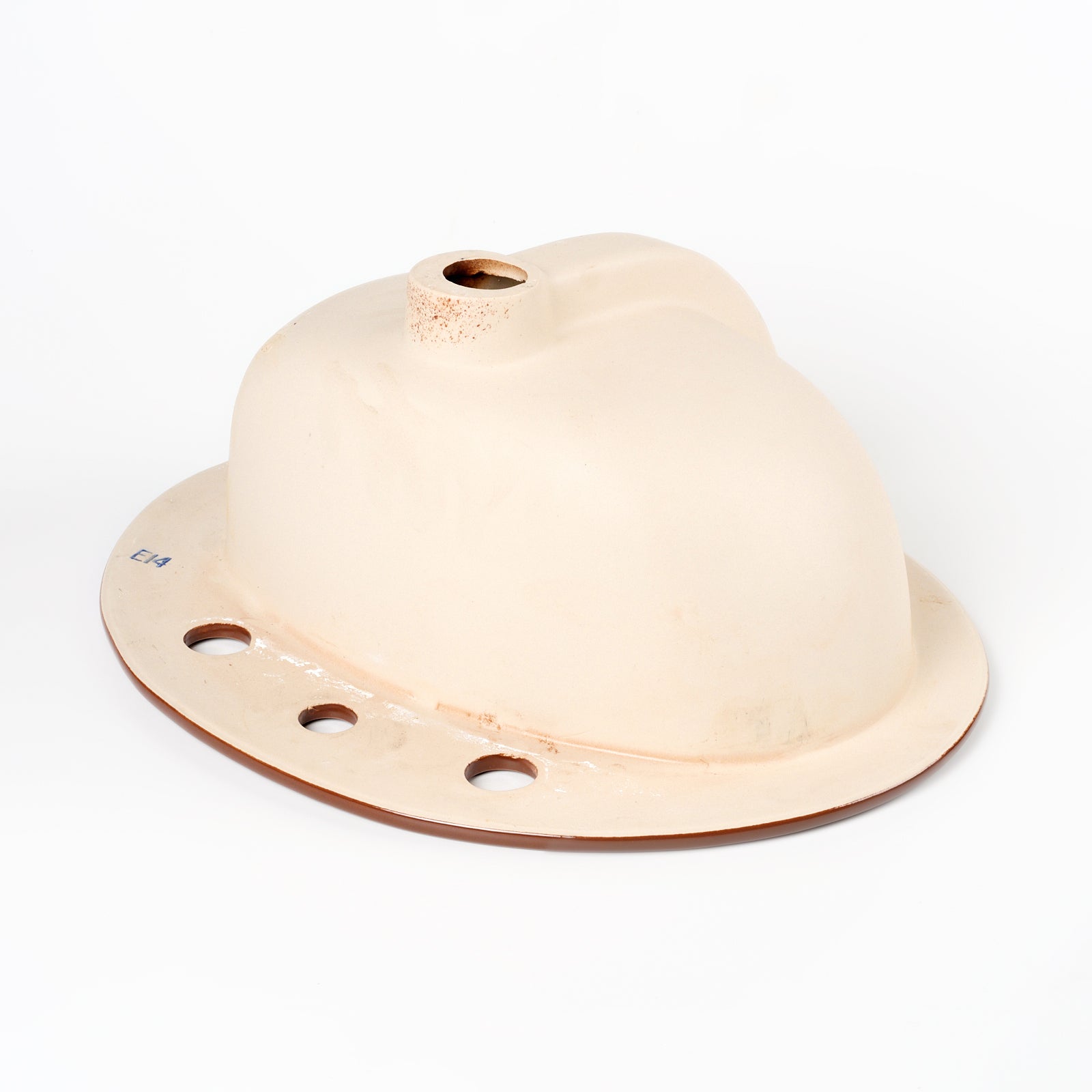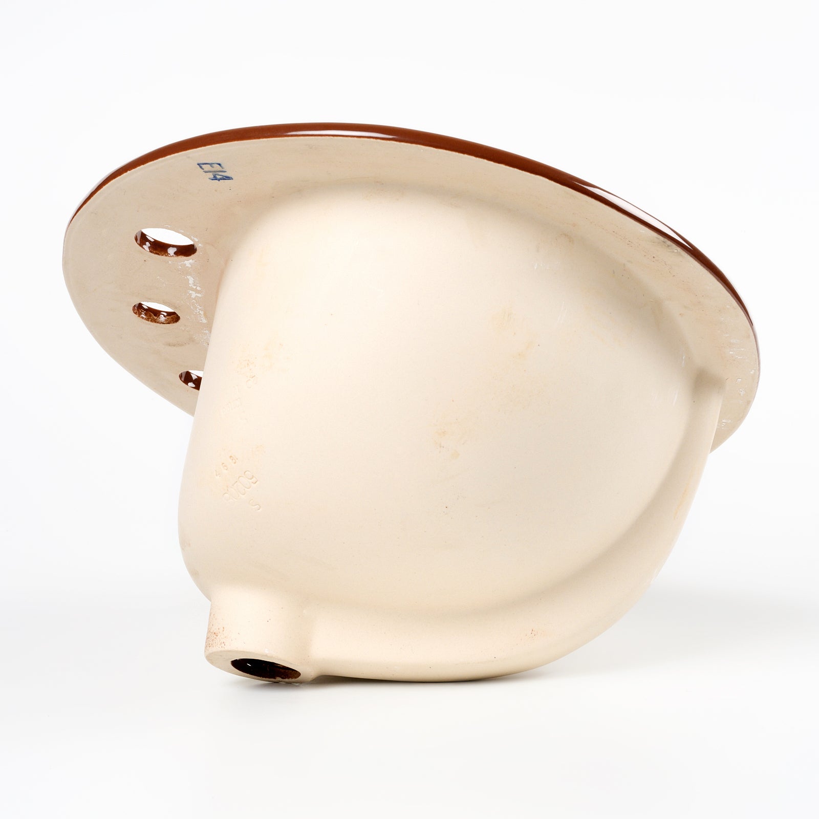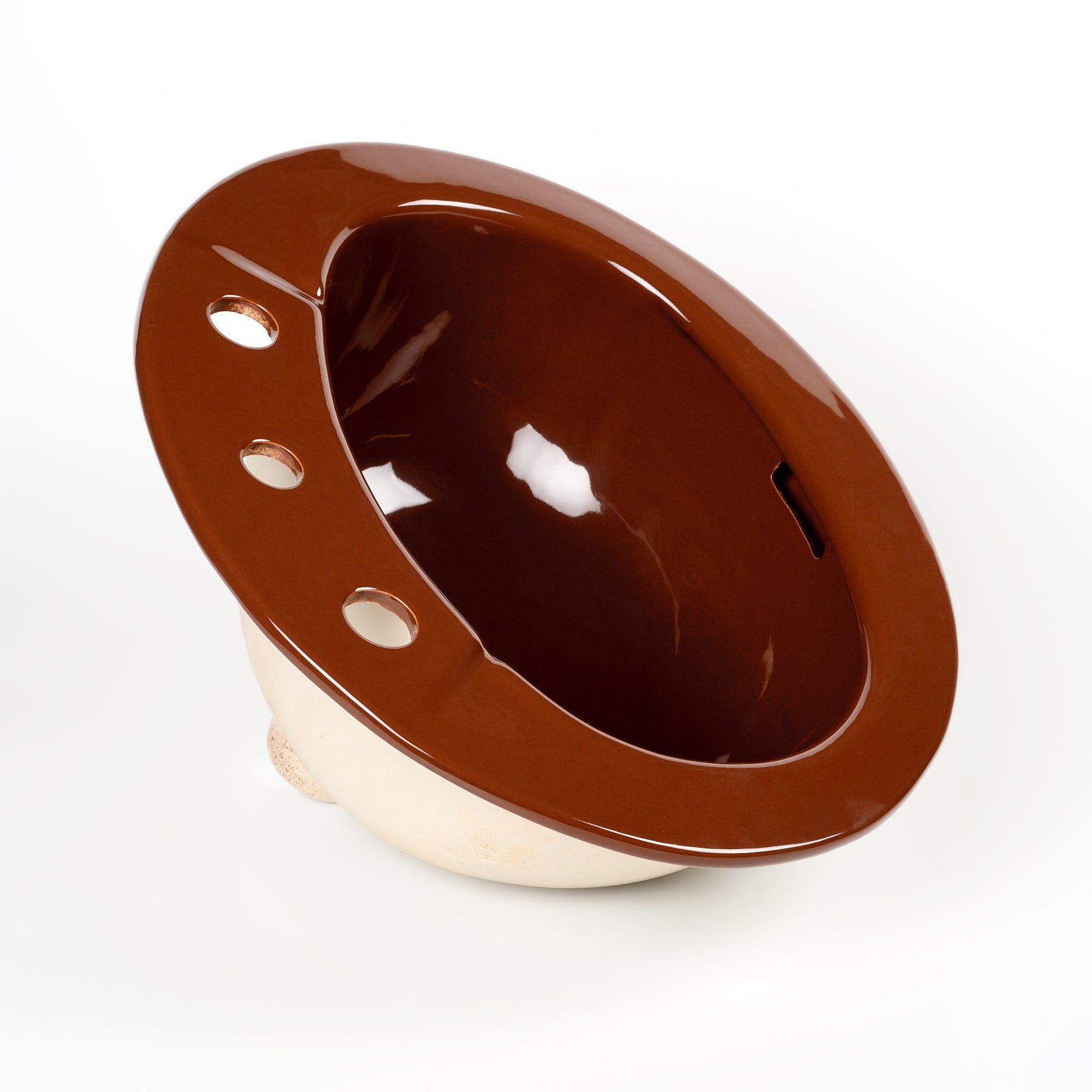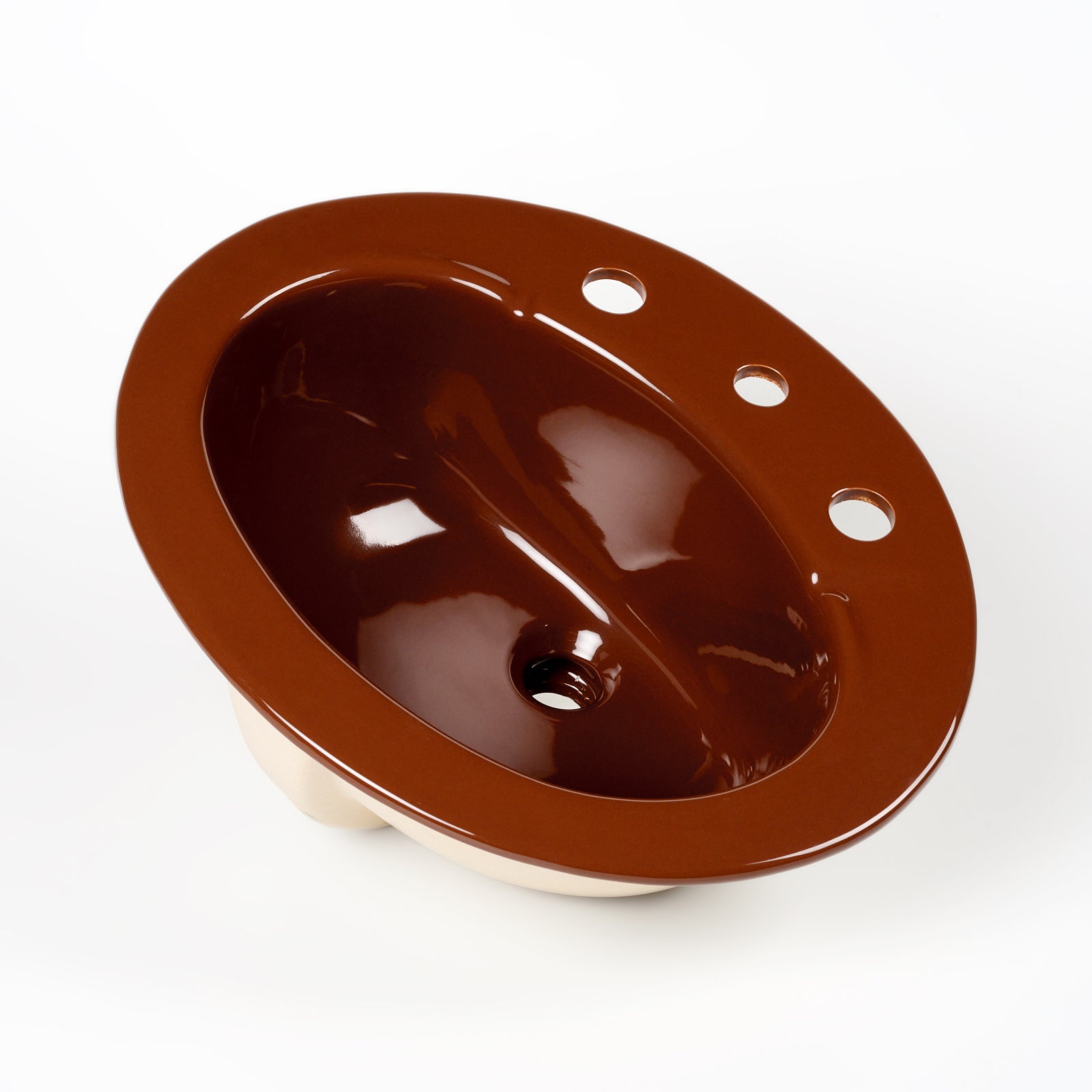 This vitreous china self rimming sink is a style called Pennington with the color name Swiss Chocolate. This sink is 20" x 17” with 8" centers. Manufactured in the USA by Kohler in the 1970s.