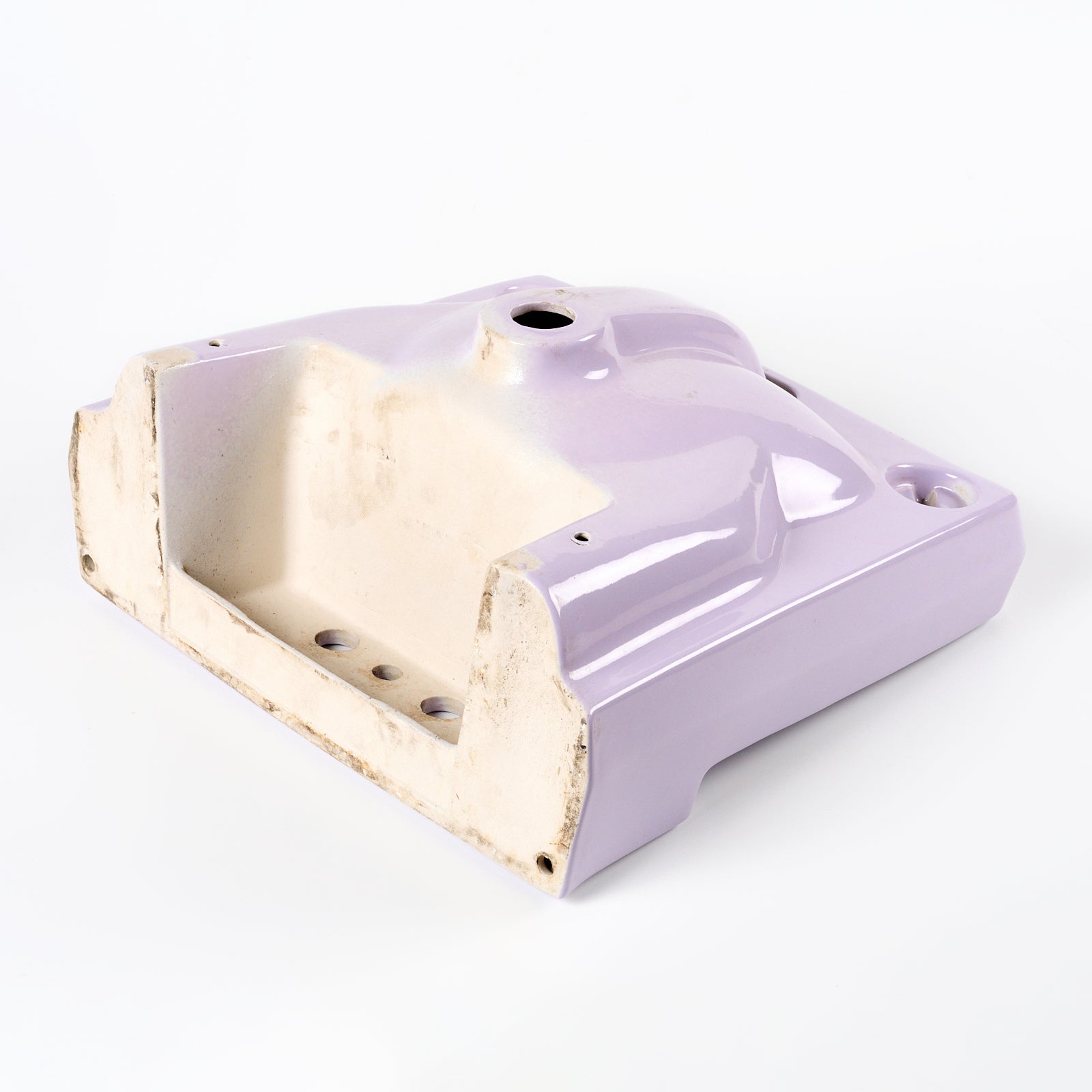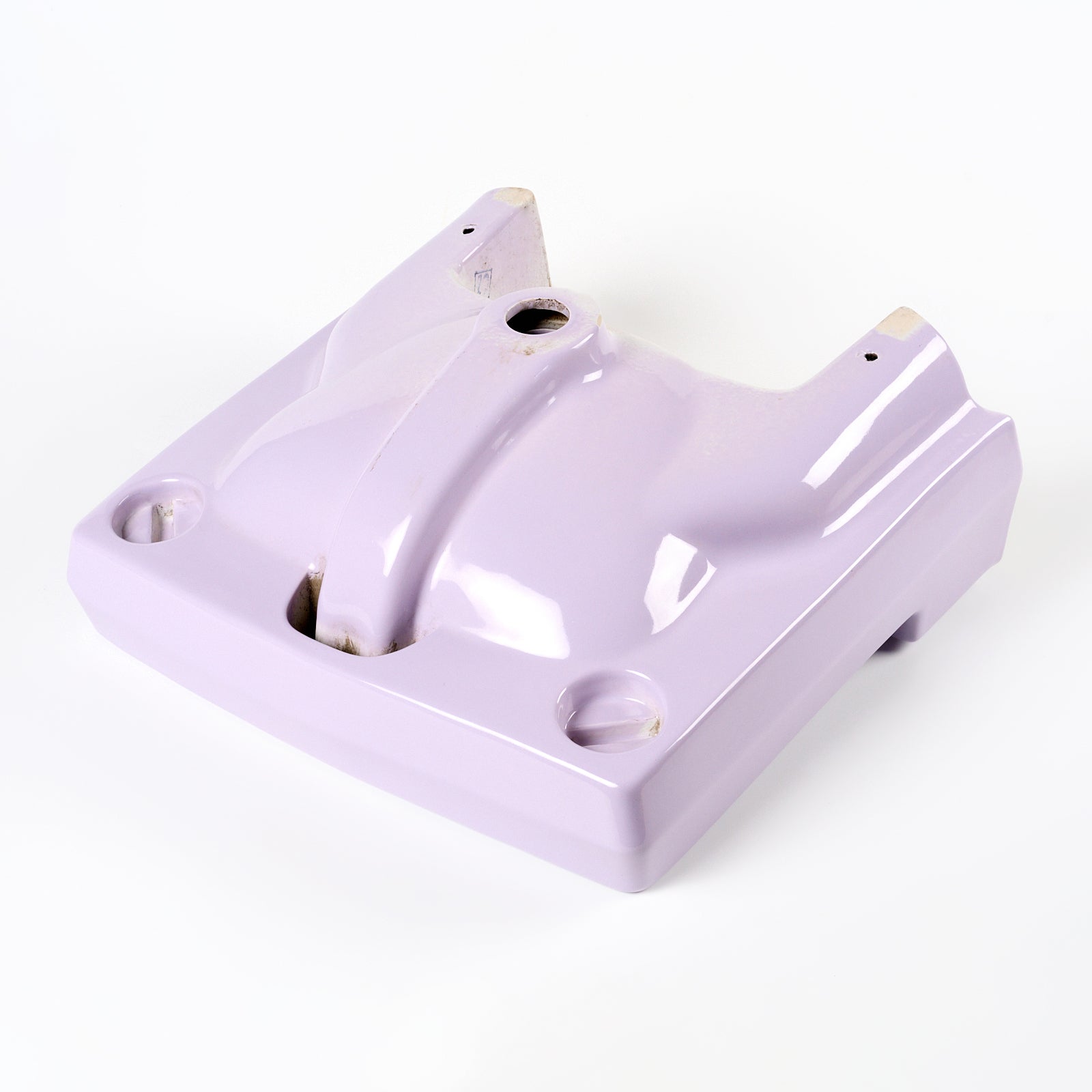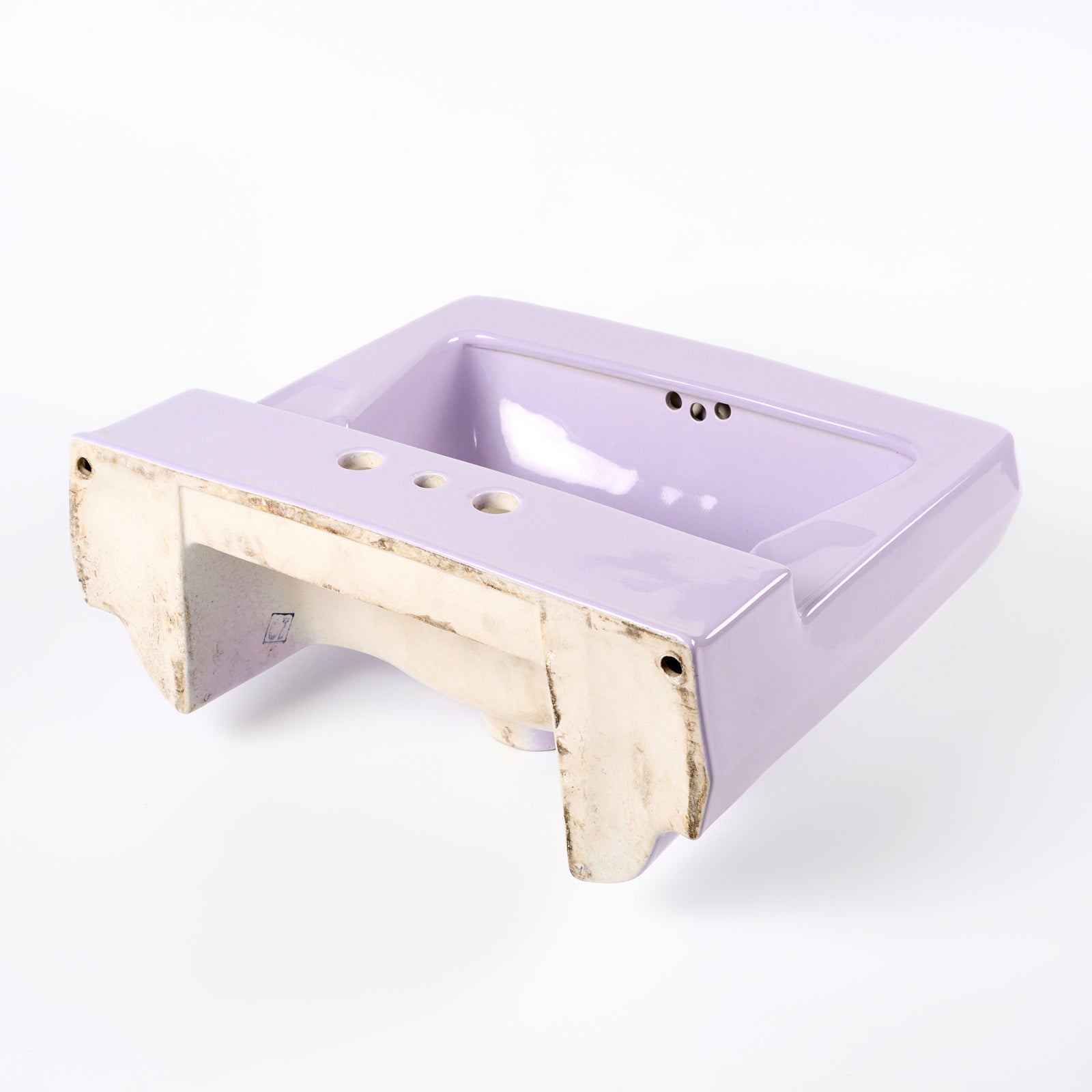 This vitreous china wall hung sink is lavender in color. This sink is 18.5" x 17” with 4" centers. Manufactured in the USA in the 1970s.
