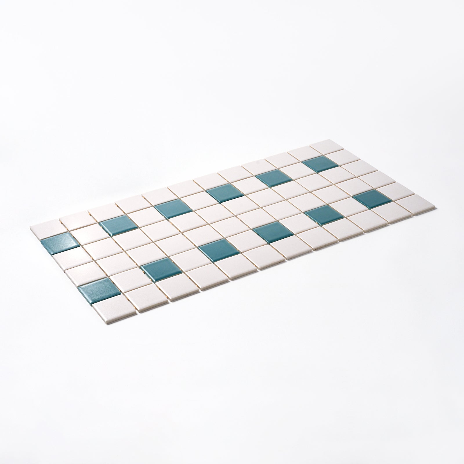 This matte pale grey and teal floor or wall tile is from a warehouse of leftovers from Atlantic City casino installations, each sheet is 12” x 24”, 3/16” thick, manufactured in the USA by American Olean in the 1990s.