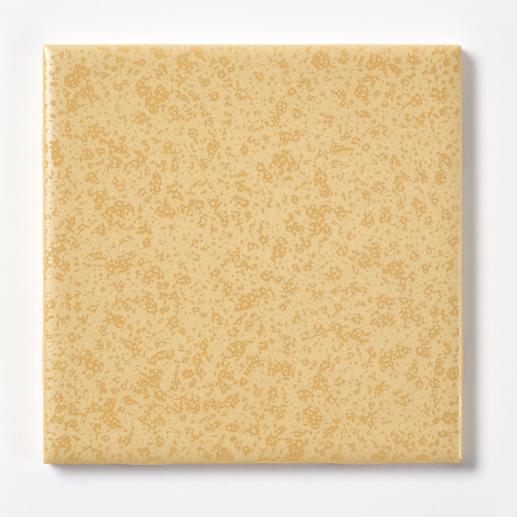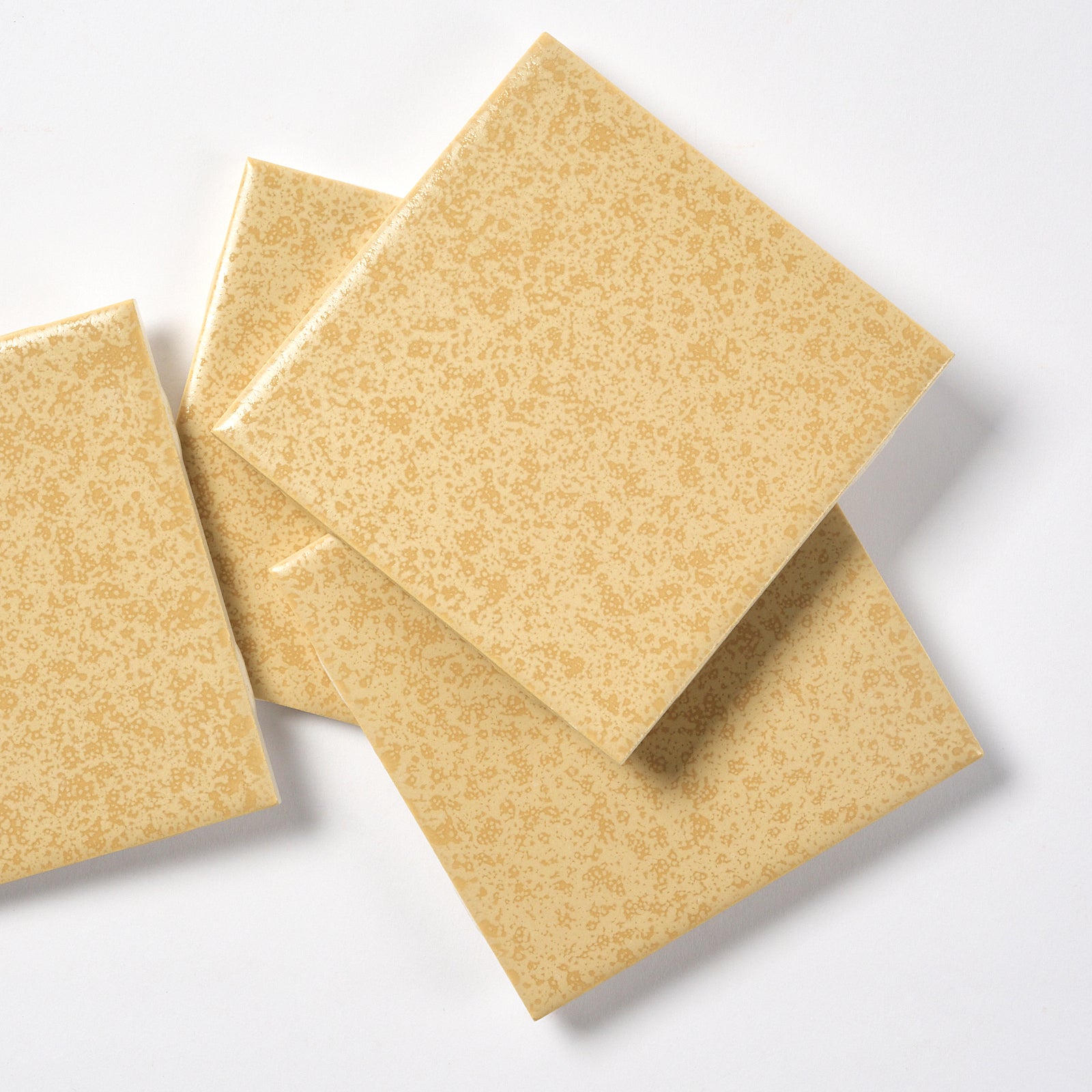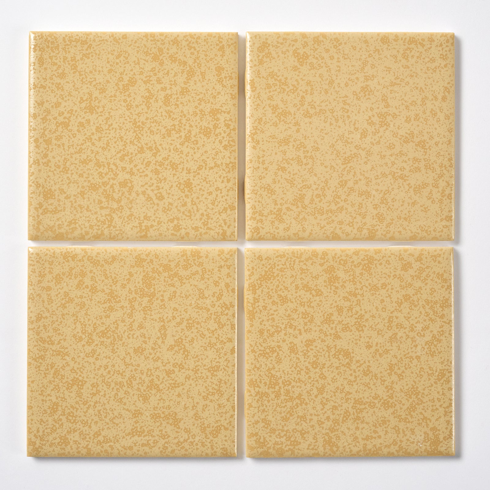 This matte glazed ceramic wall tile is a tan golden color. Each tile is 4.25” X 4.25”, 1/4” thick. Manufactured in the USA in the 1980s by American Olean.