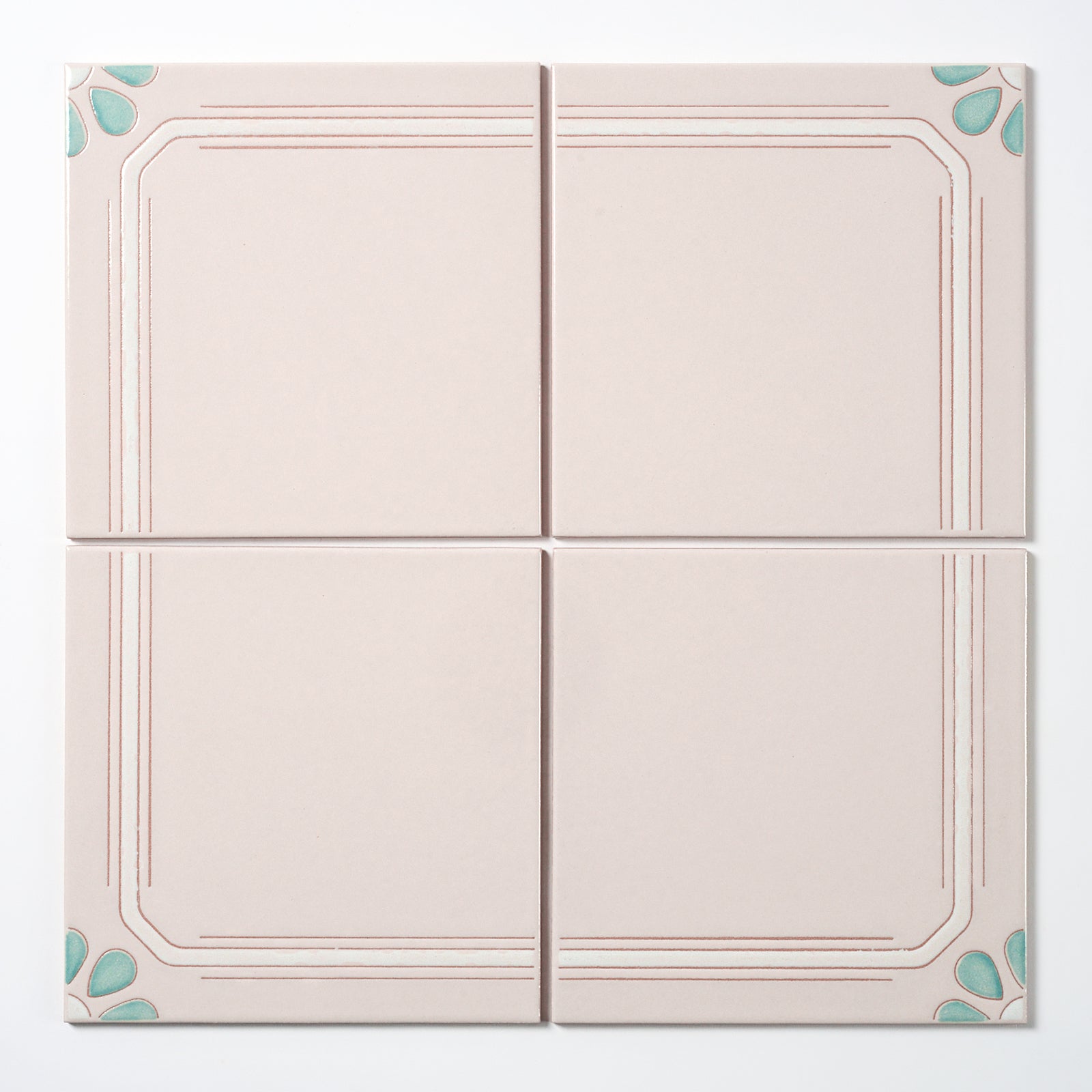 This is a vintage floral floor tile with a striped border pattern. The colors are ivory, teal and white and the tile is named Connecticut. Manufactured in Italy in the late 1980s by Ceramiche Piemme. Each piece is approximately 8" x 8", 3/16" thick.