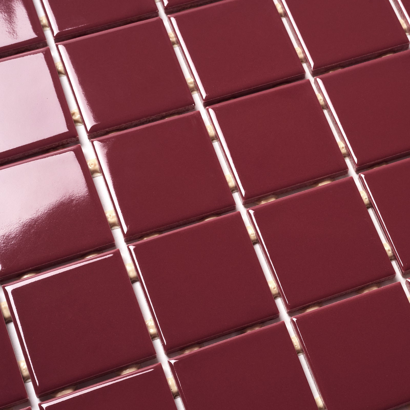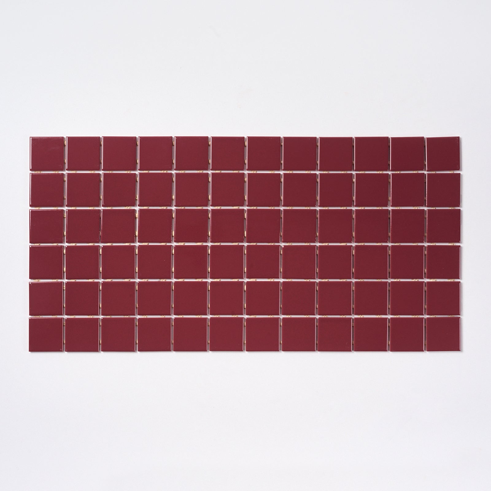 This burgundy glossy floor or wall tile is from a warehouse of leftovers from Atlantic City casino installations, each sheet of tile is 12” x 24”, 3/16” thick, manufactured in the USA by Daltile in the 1990s.