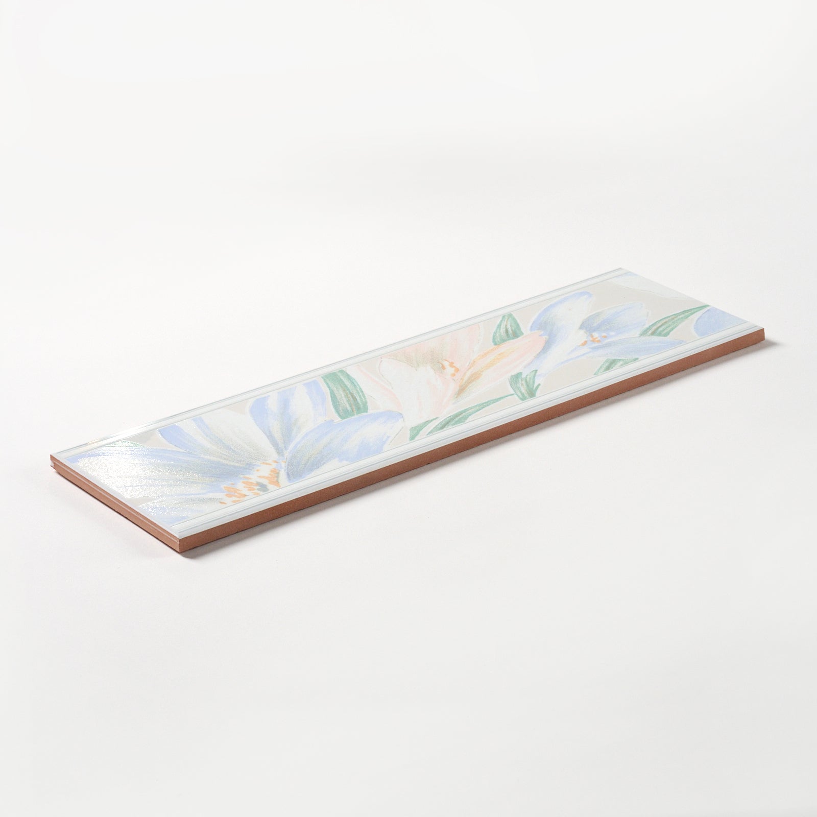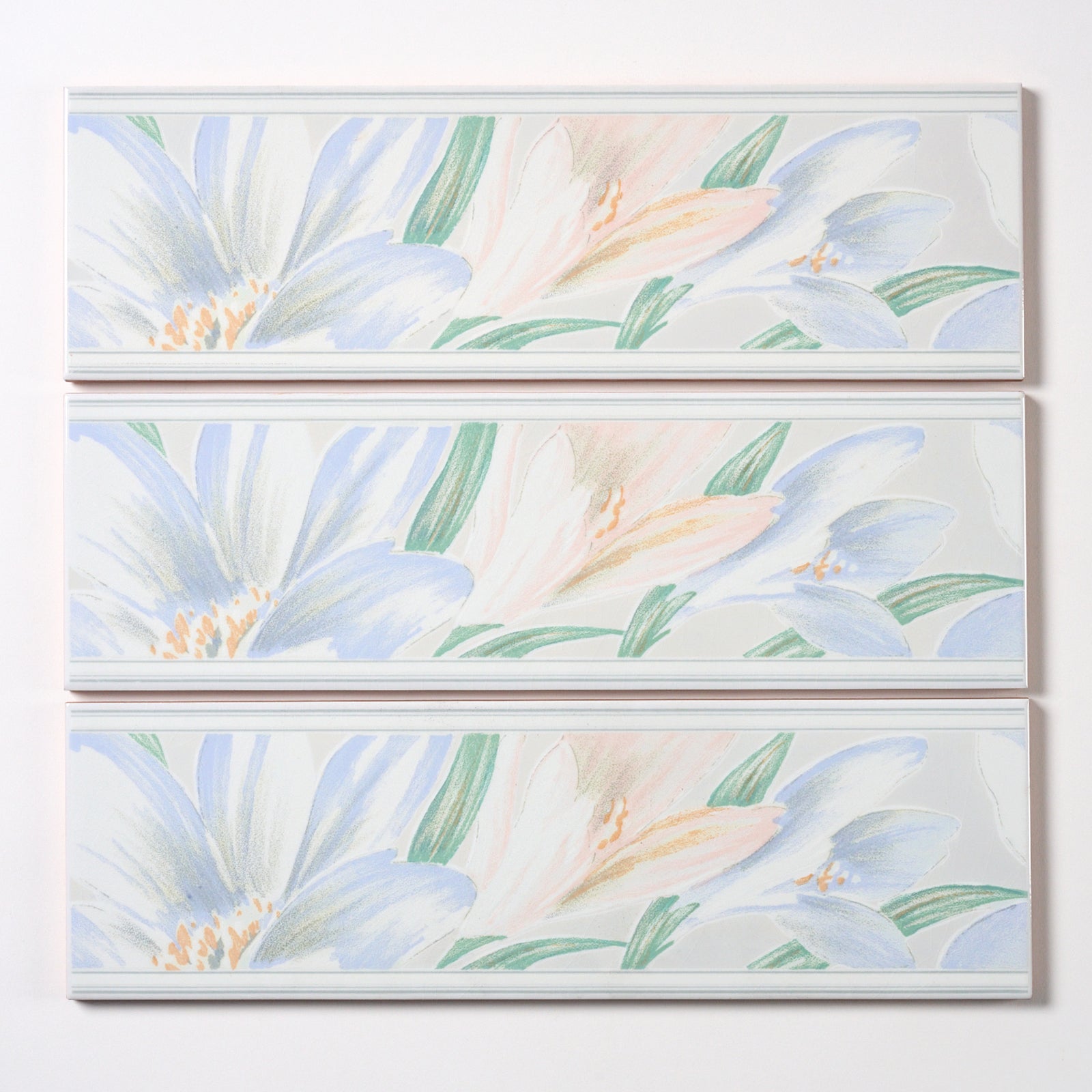 This high quality, large porcelain listello wall tile has a pastel floral pattern with colors of green, pink, and blue. Each tile is 5” x 15 7/8”, 5/16" thick, manufactured in Italy in the 1980s.