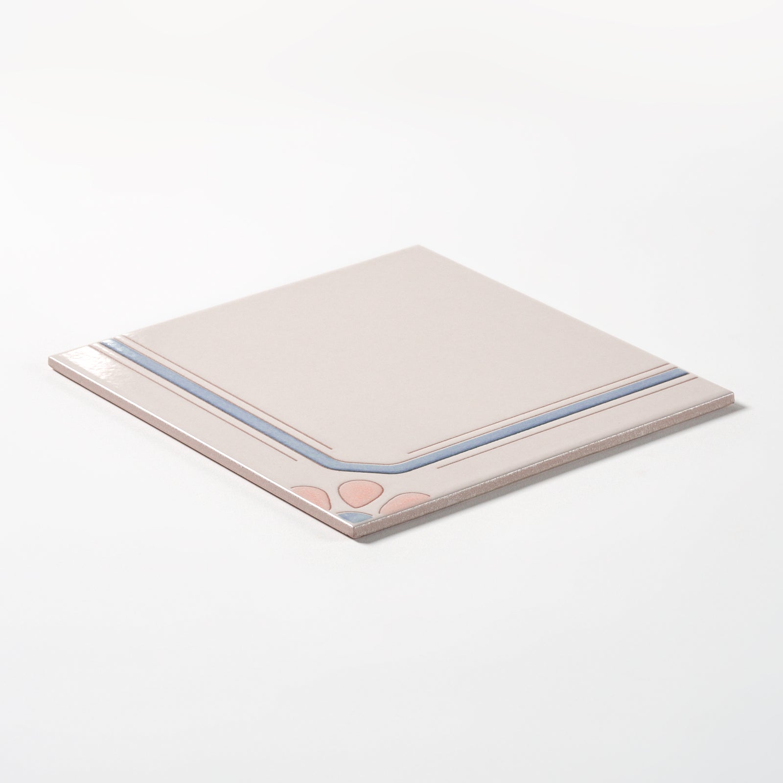 This is a vintage floral floor tile with a striped border pattern. The colors are ivory, pink and blue and the tile is named Massachusetts. Manufactured in Italy in the late 1980s by Ceramiche Piemme. Each piece is approximately 8" x 8", 3/16" thick.