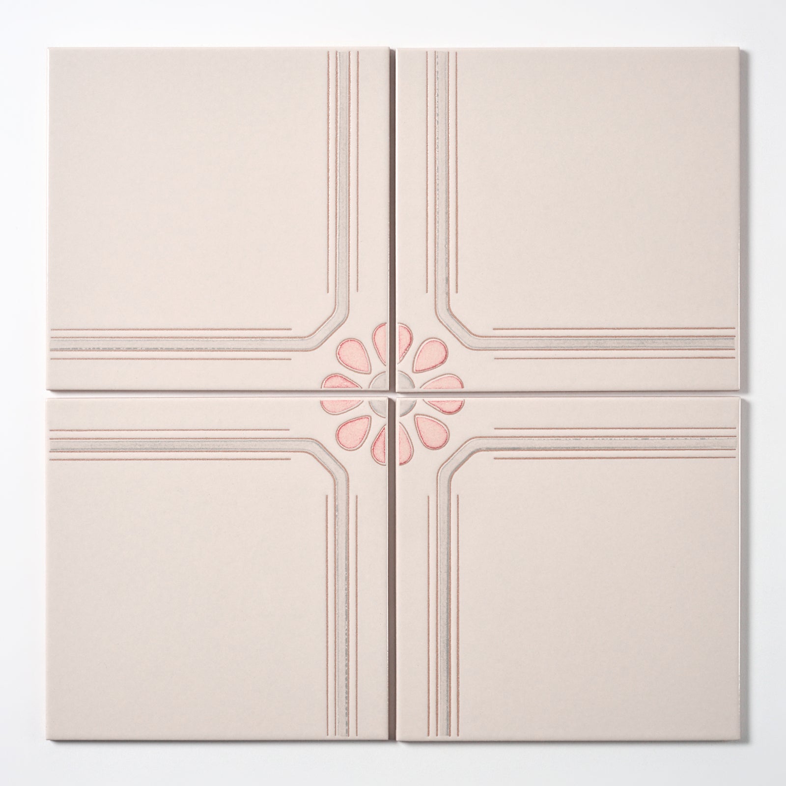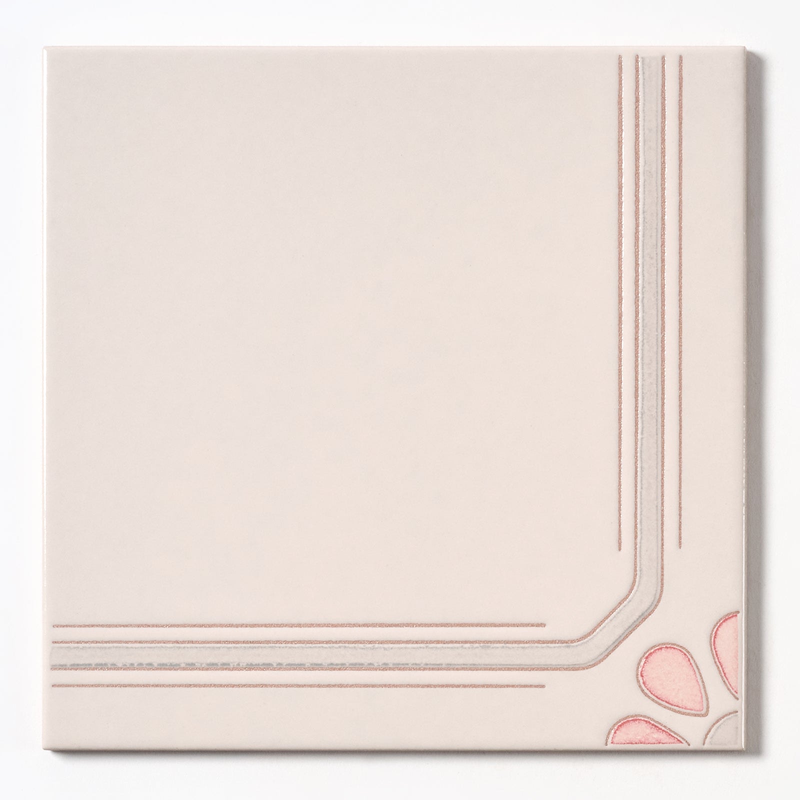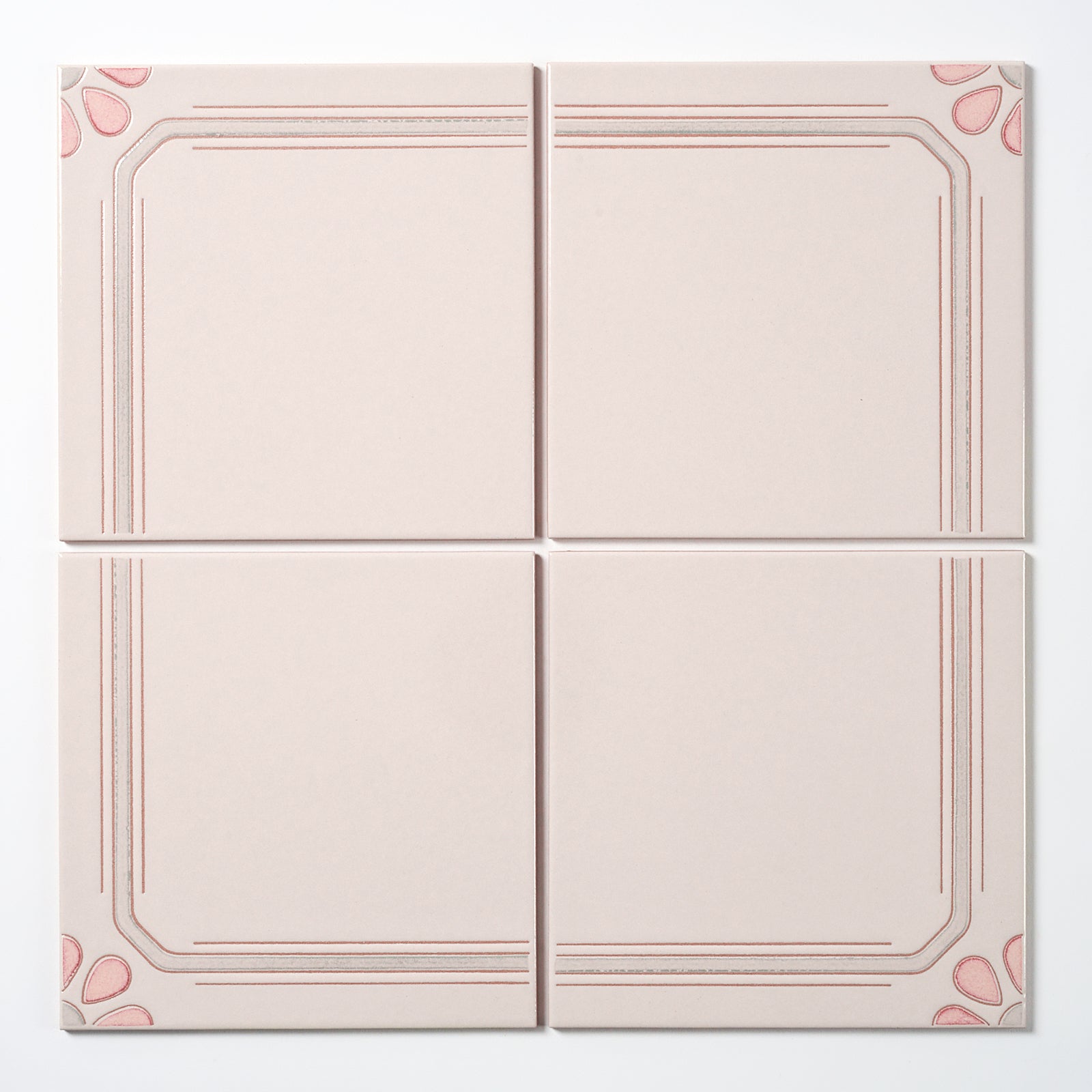 This is a vintage floral floor tile with a striped border pattern. The colors are ivory, gray and pink and the tile is named Rhode Island. Manufactured in Italy in the late 1980s by Ceramiche Piemme. Each piece is approximately 8" x 8", 3/16" thick.