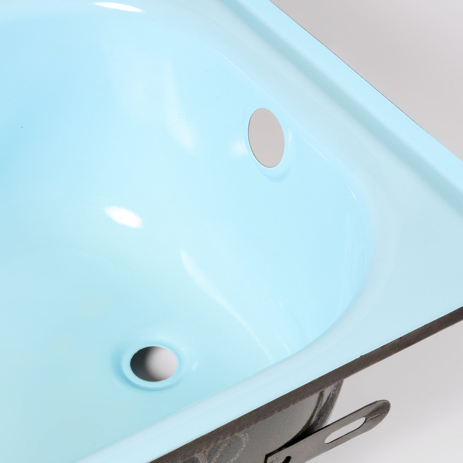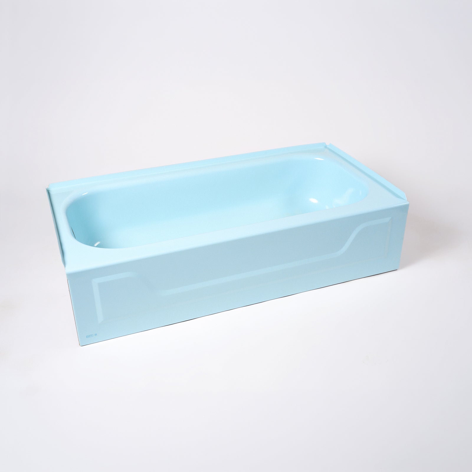 This right-hand drain 60" porcelain enameled steel bathtub is called Dresden Blue in color. Each bathtub is 60” x 30” x 15”. Manufactured in the USA by Bootz Manufacturing in the 1980s.