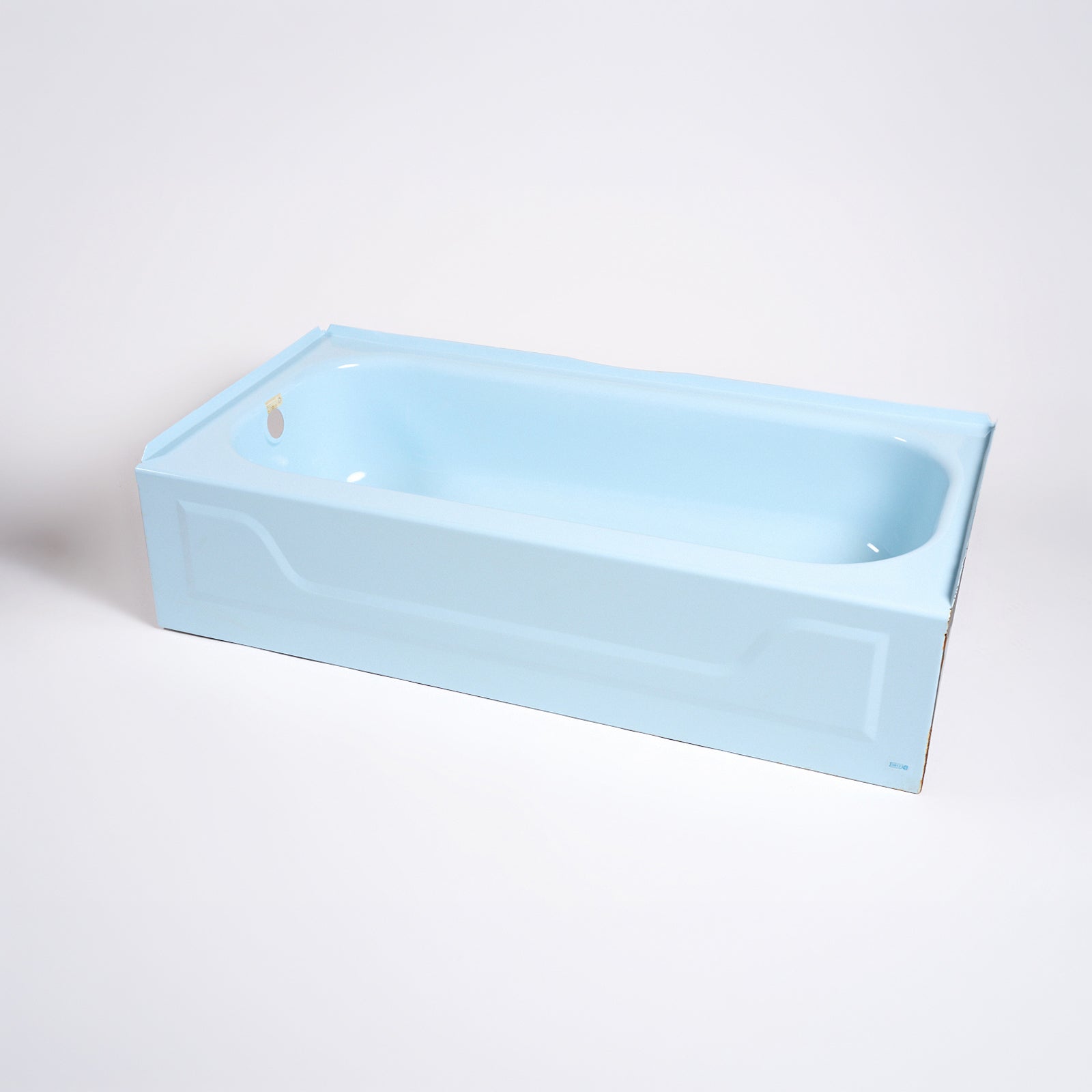 This left-hand drain 60" porcelain enameled steel bathtub is powder blue in color. Each bathtub is 60” x 30” x 15”. Manufactured in the USA by Bootz Manufacturing in the 1980s.