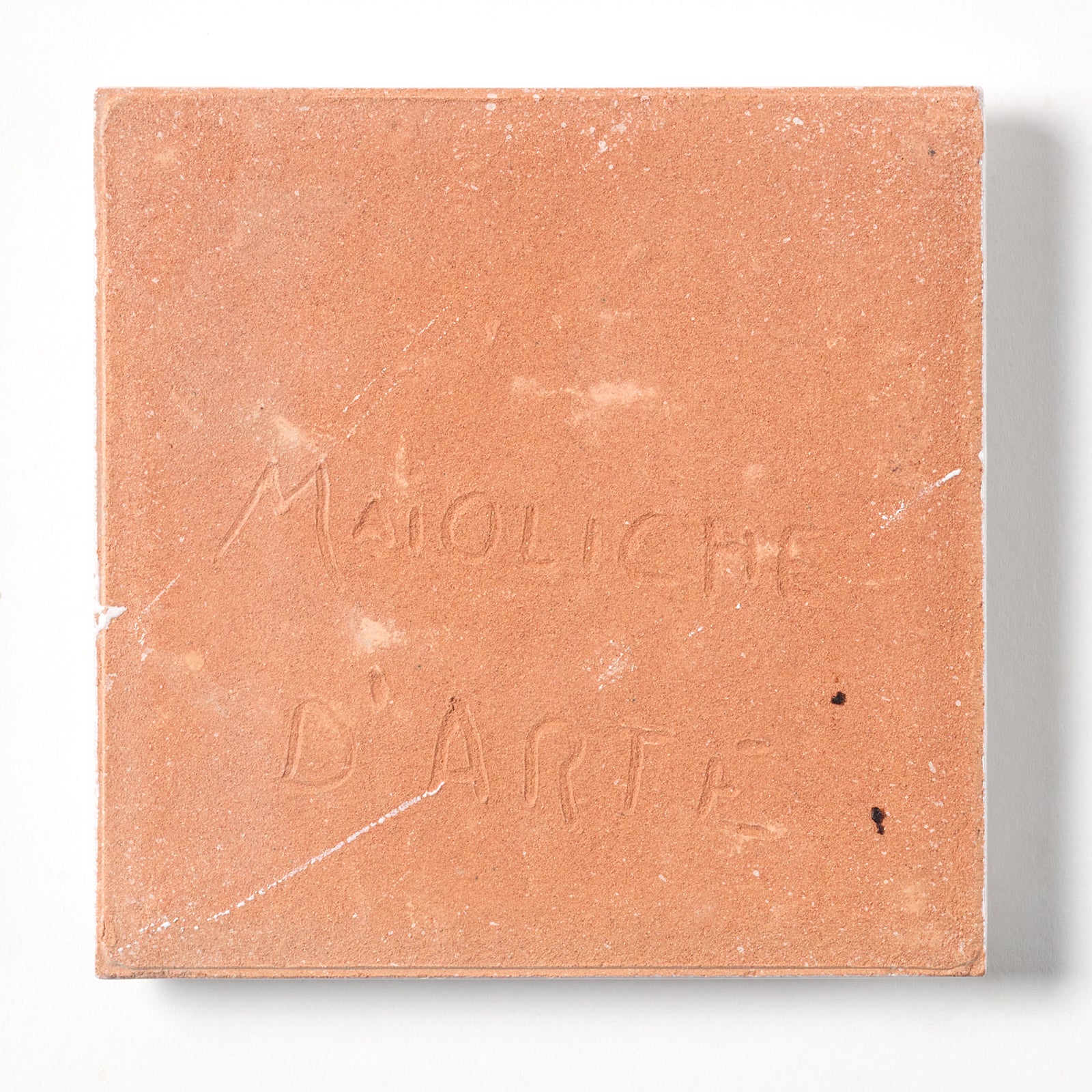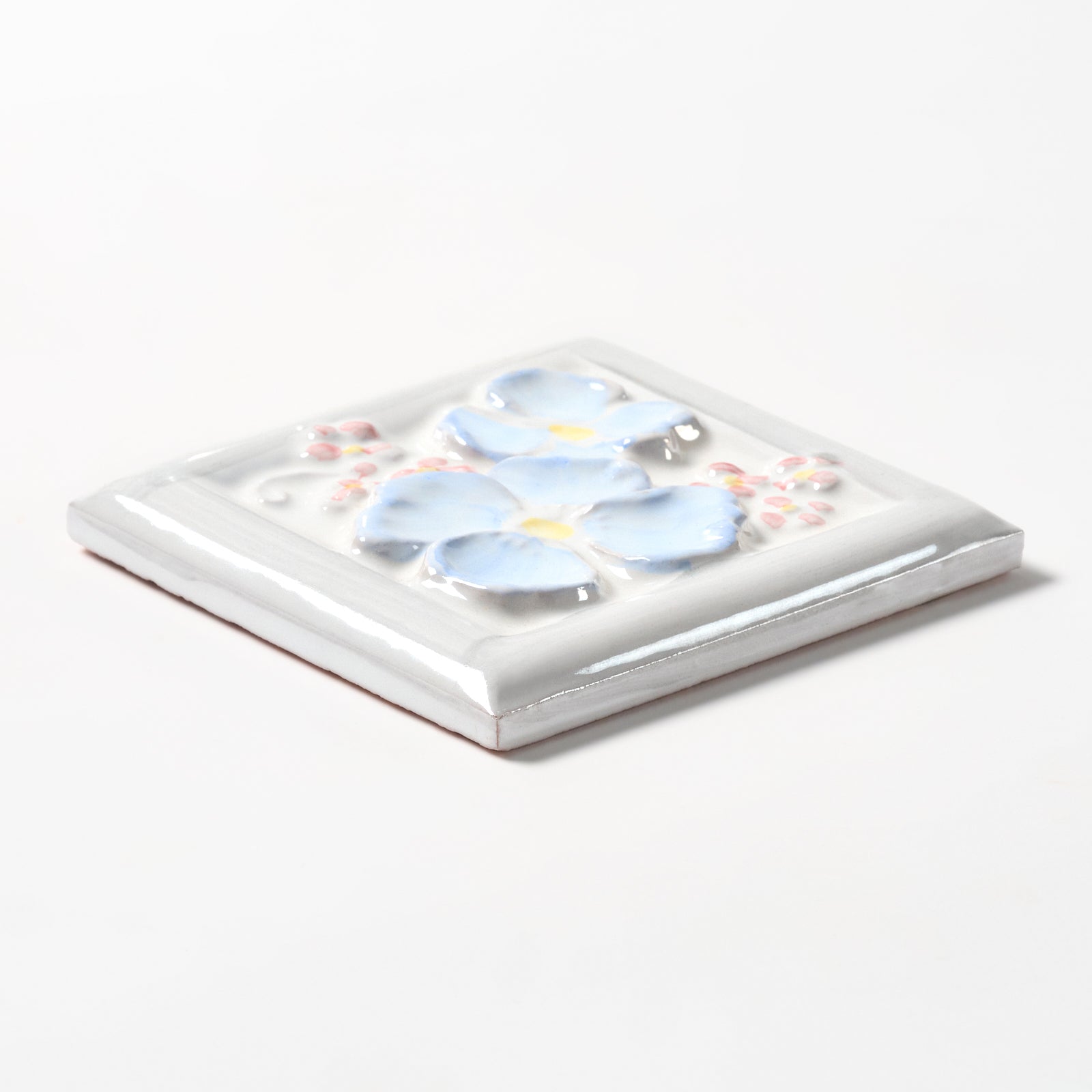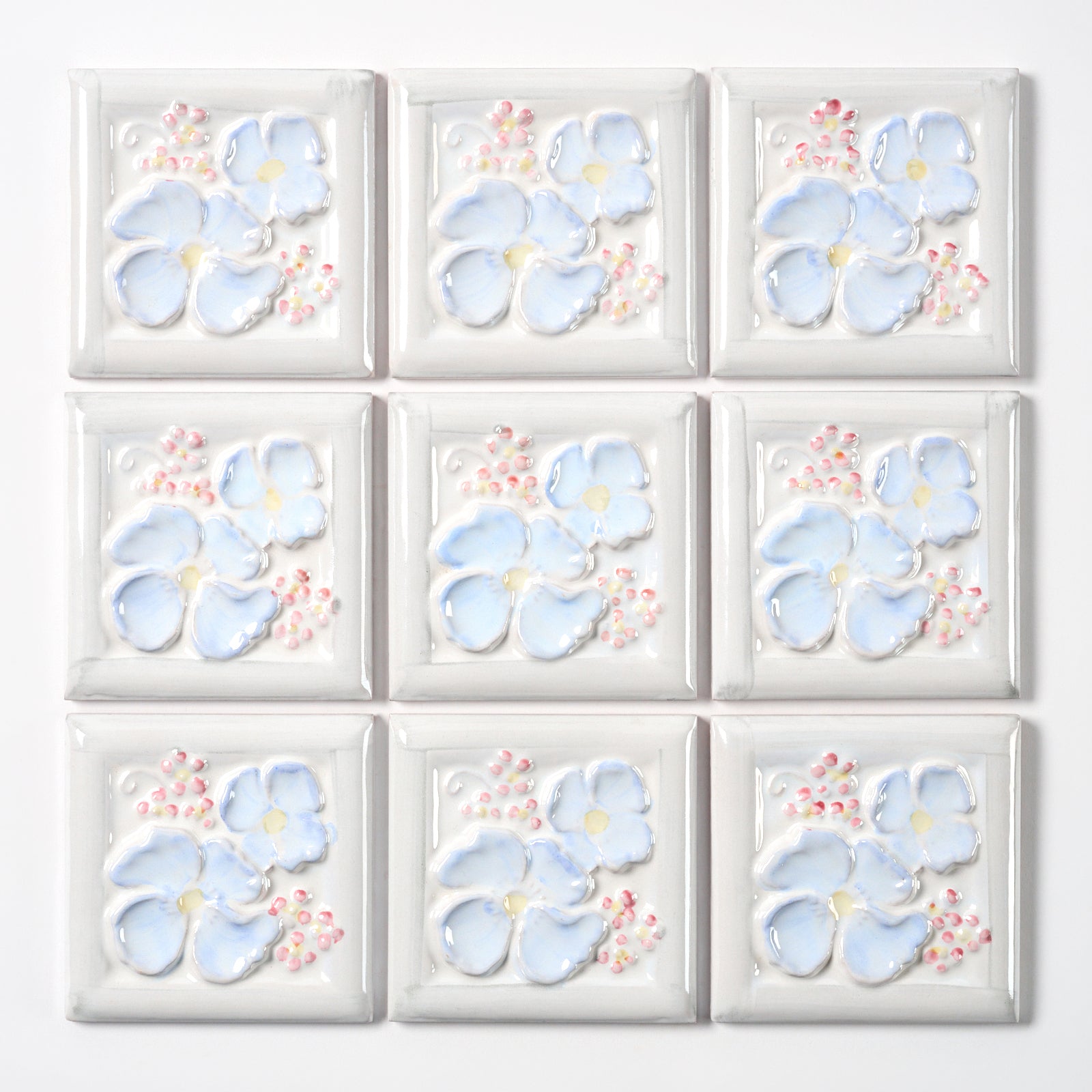 This glazed, high relief, terracotta wall tile has a beautiful blue, yellow and pink (on a white background) raised floral pattern, each tile is approximately 4” x 4”, 1/2” thick, manufactured in Italy in the 1980s.