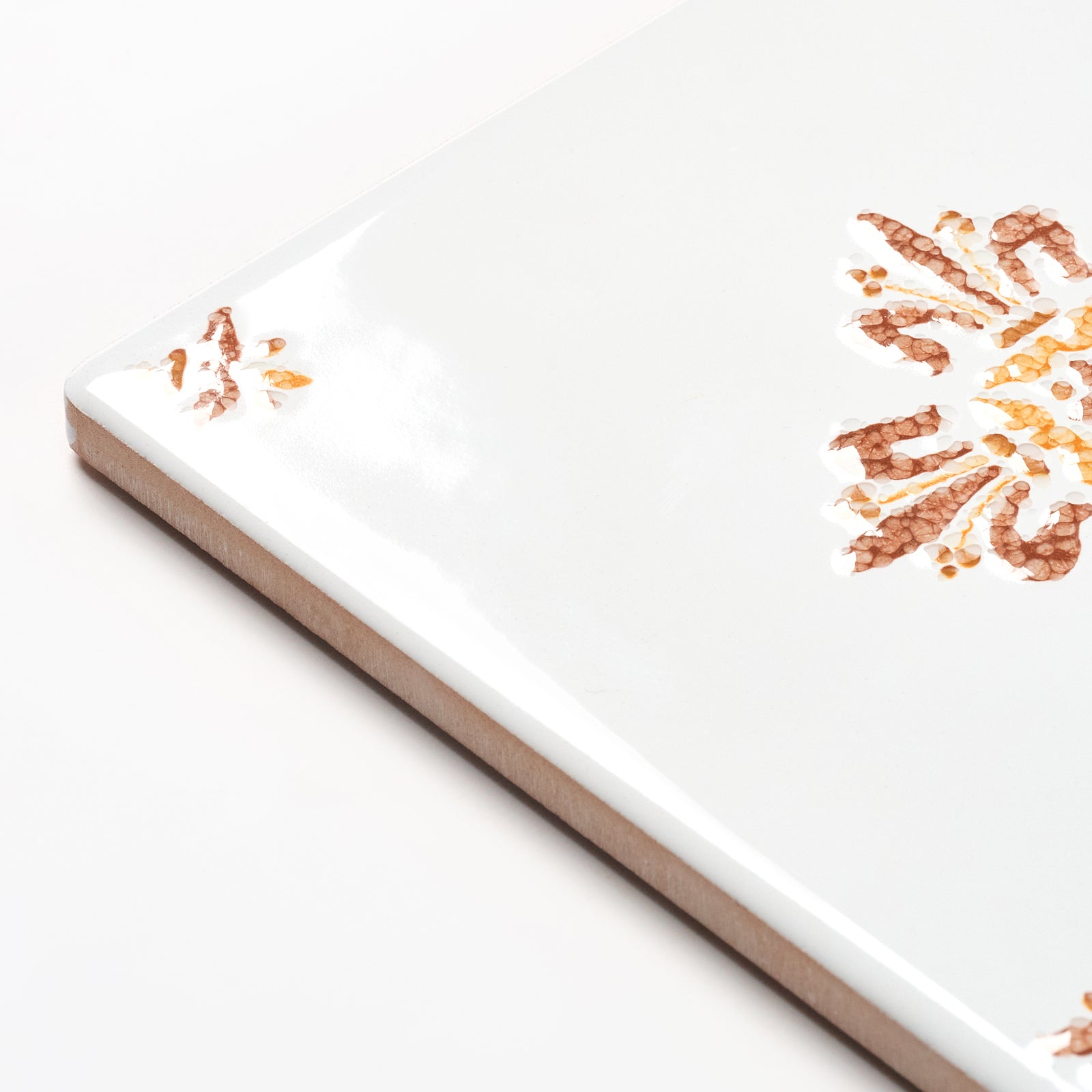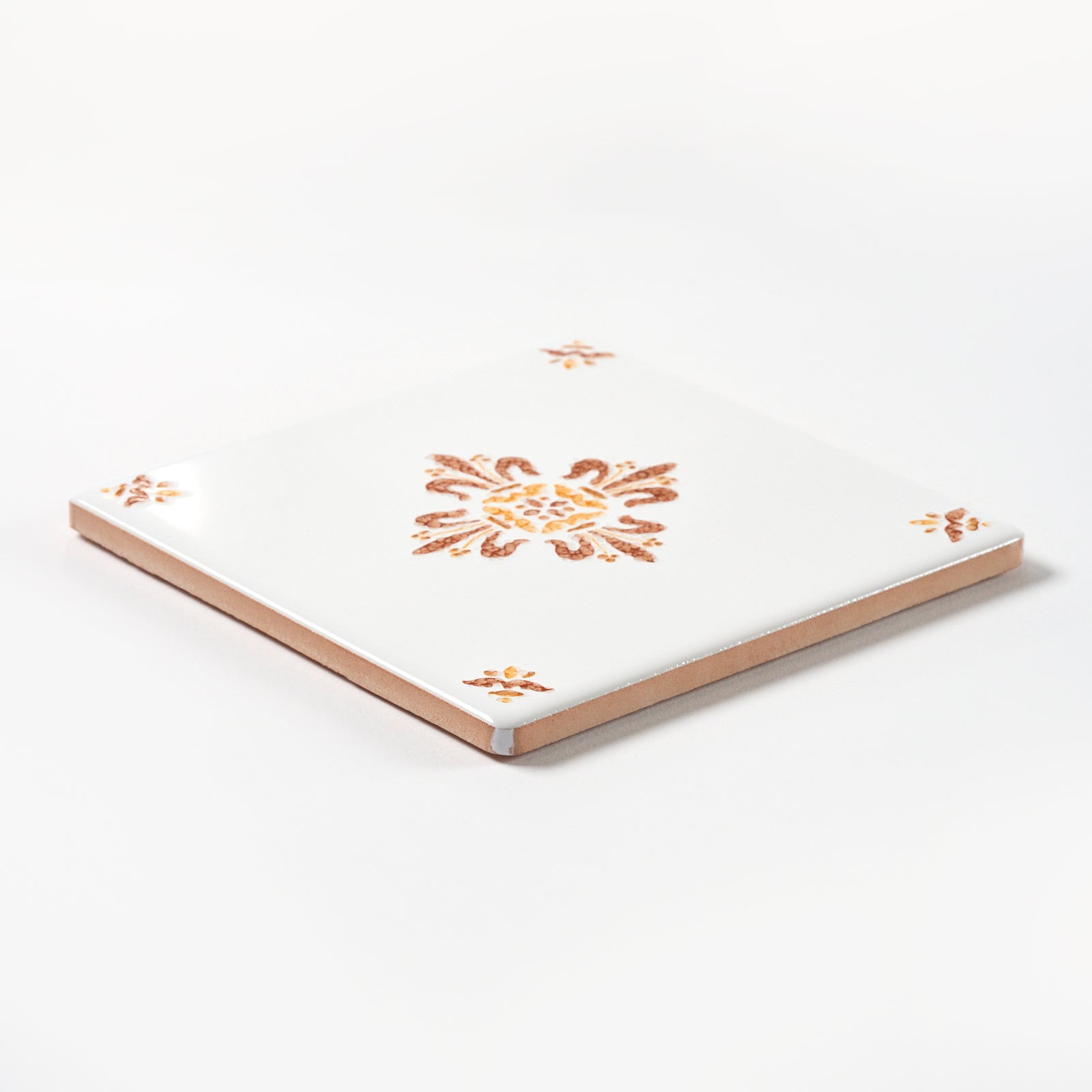 This glazed clay wall tile has a beautiful brown and yellow raised floral pattern, each tile is 6” x 6”, 5/16” thick, manufactured in Italy by Ceramica la Perla in the late 1980s.