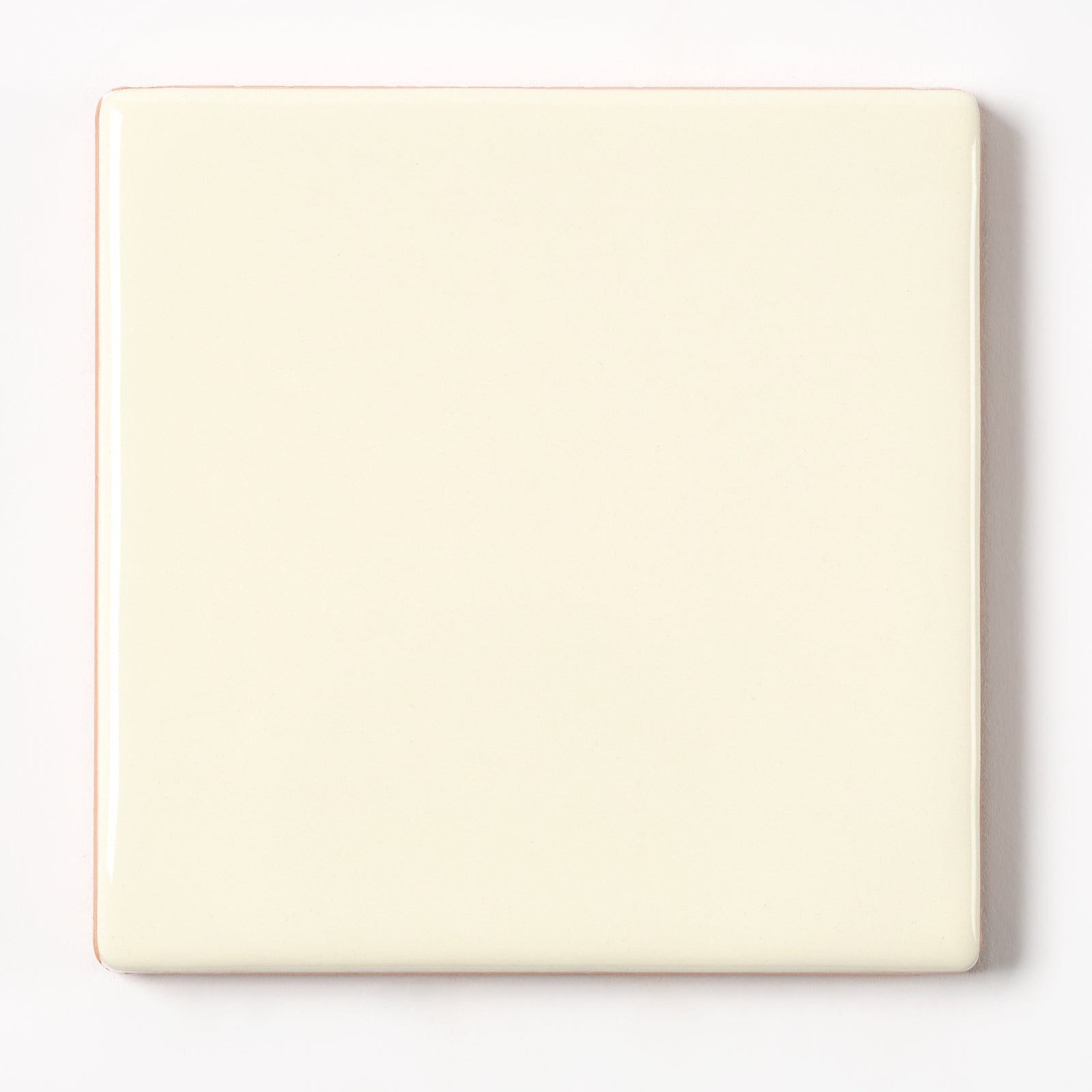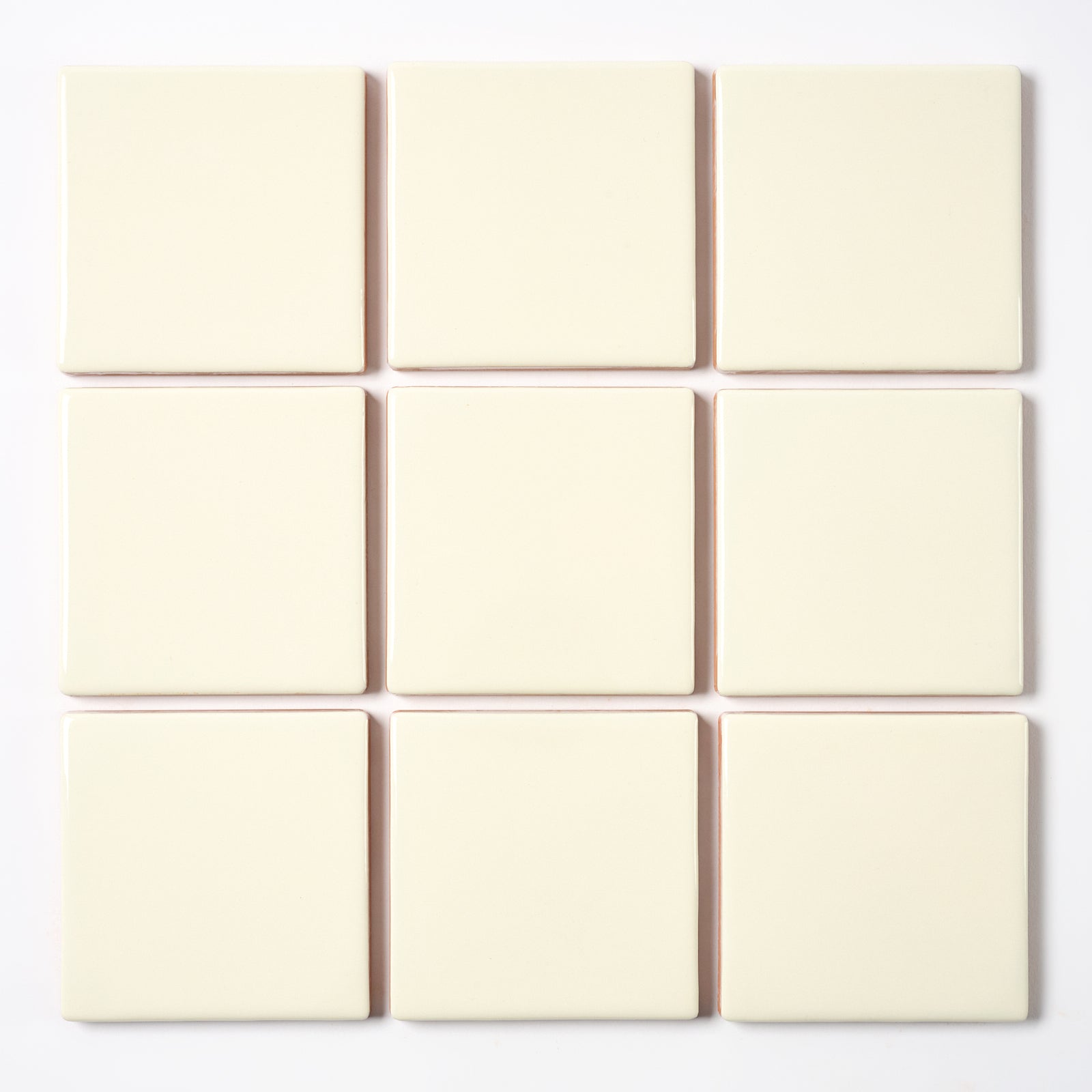 This clay wall tile has a beautiful glossy ivory colored surface with soft corners. Each tile is approximately 4” x 4”, 1/4” thick, manufactured in Italy in the 1980s.