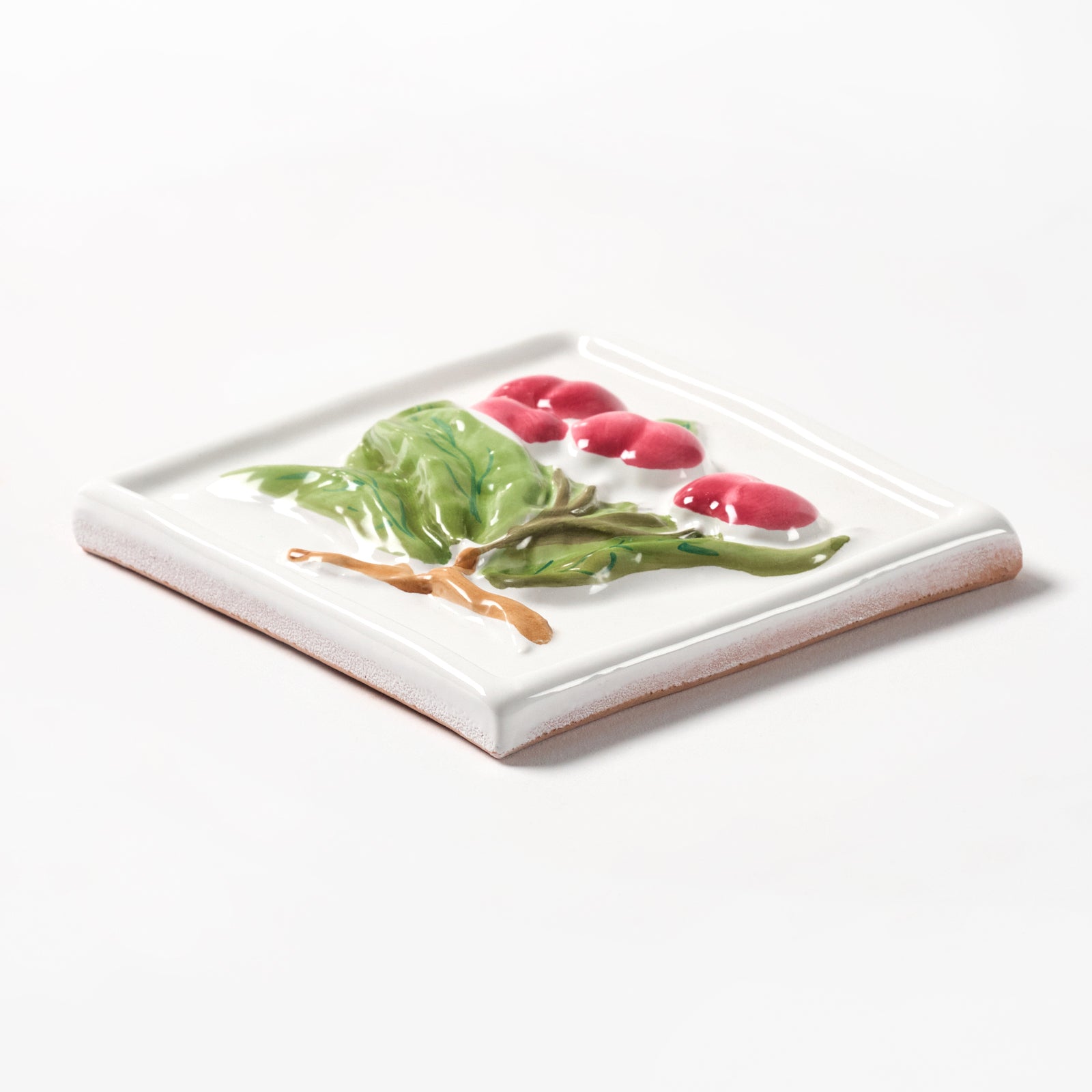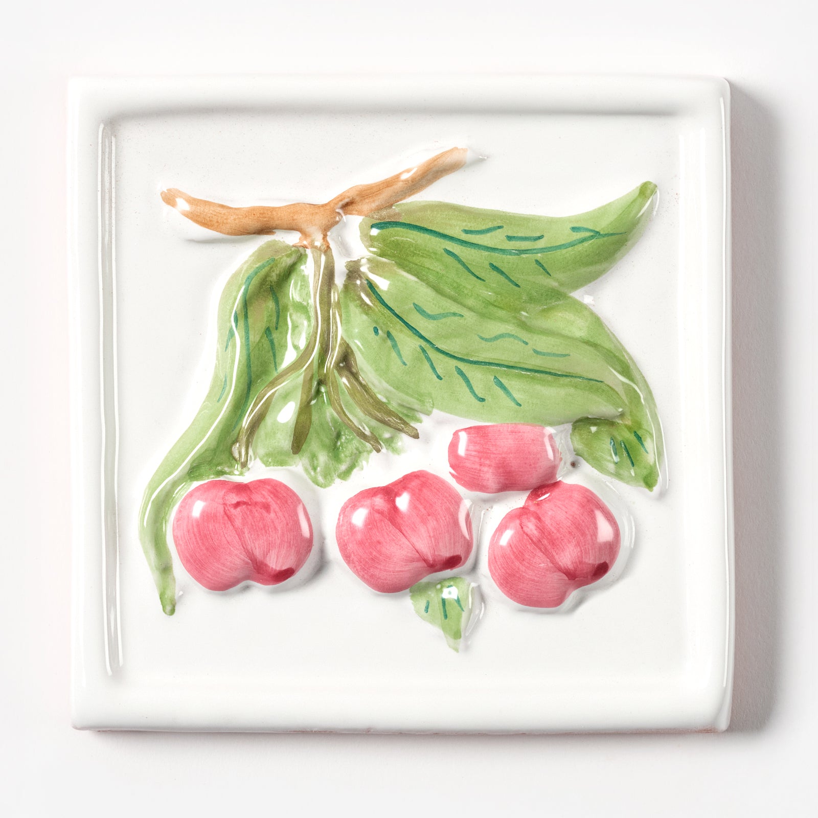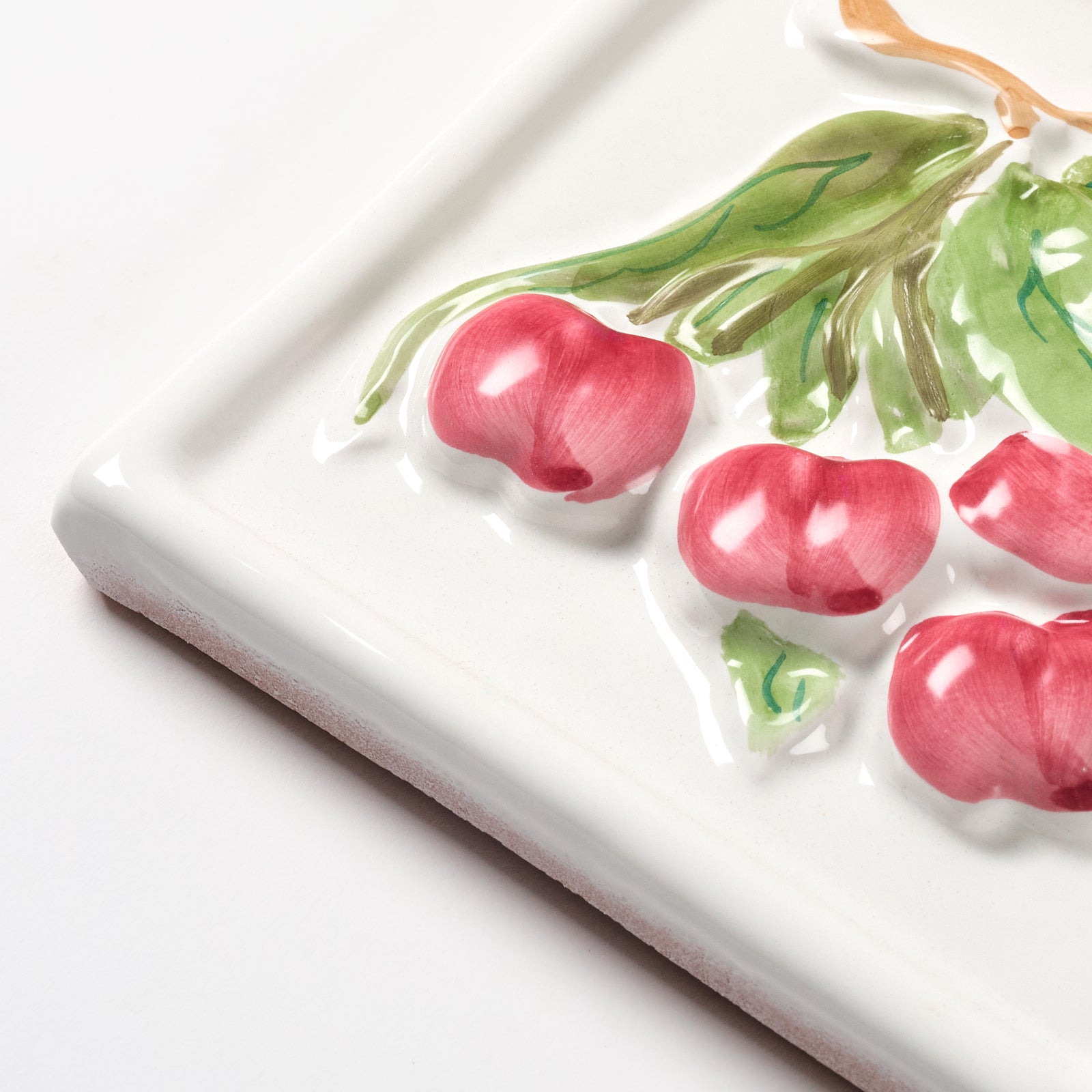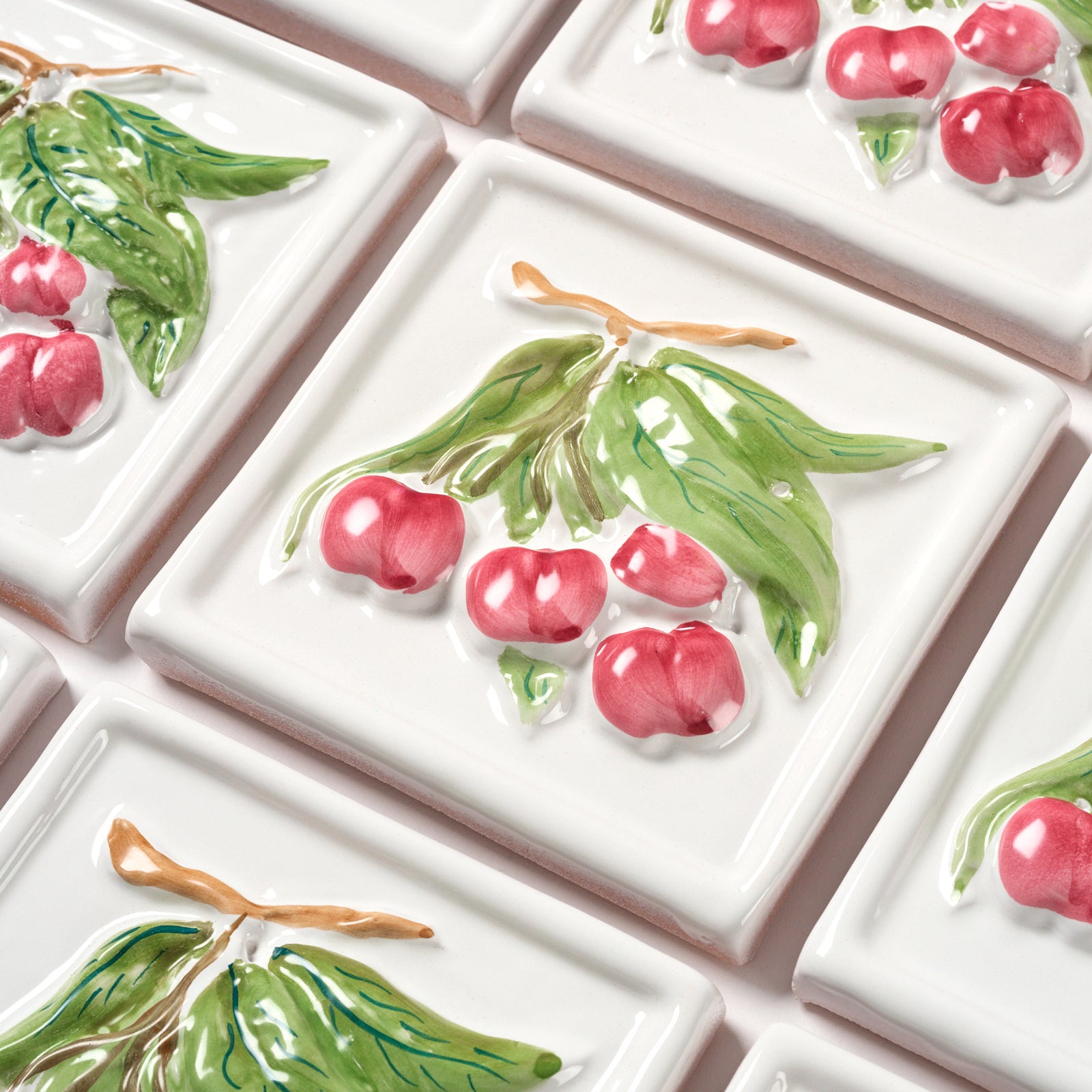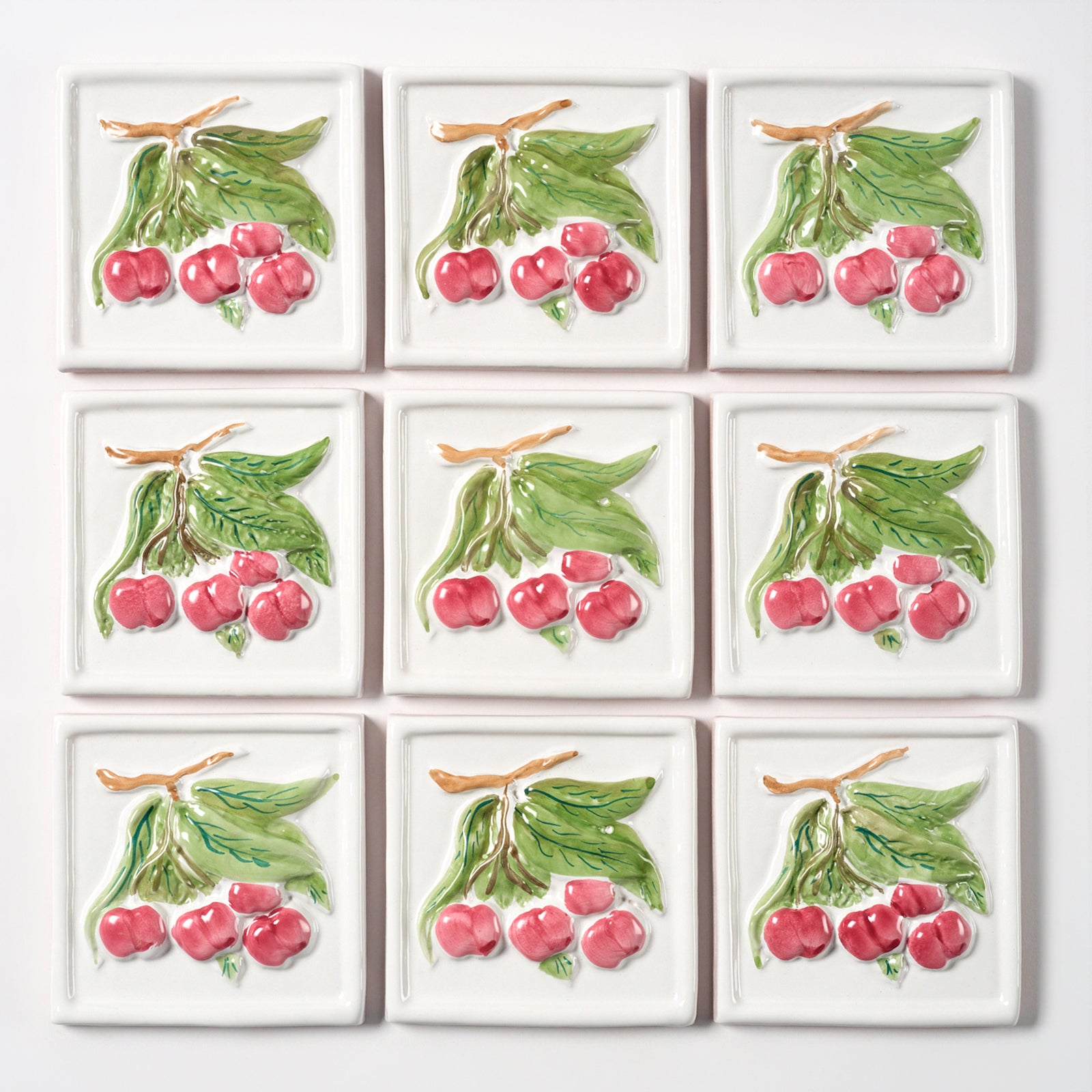 This glazed, high relief, terracotta wall tile has a beautiful green and red (on a white background) raised cherry pattern, each tile is approximately 4” x 4”, 1/2” thick, manufactured in Italy in the 1980s.