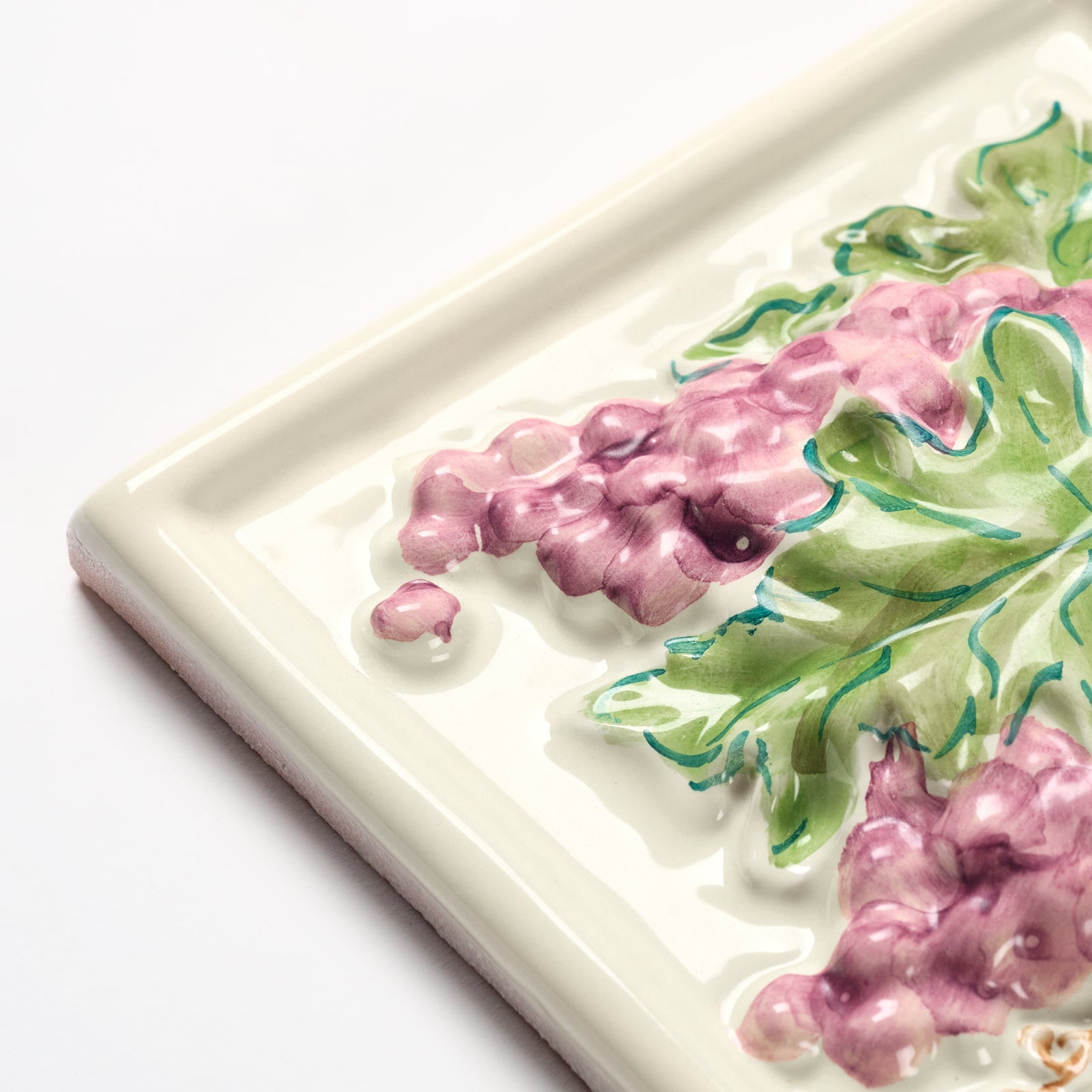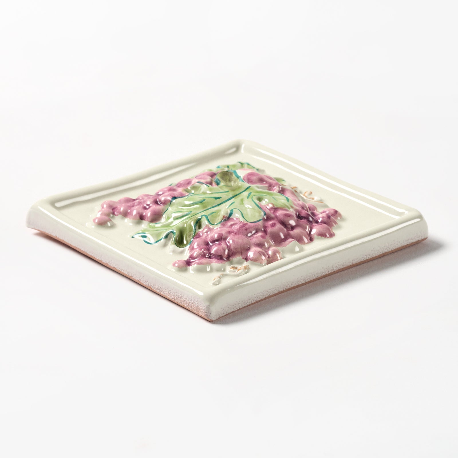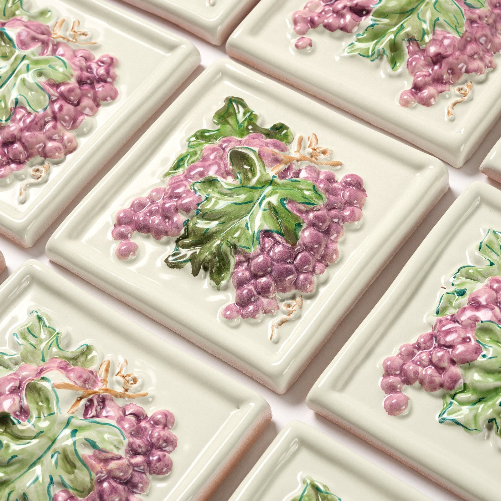 This glazed, high relief, terracotta wall tile has a beautiful green and purple (on an ivory background) raised grape pattern, each tile is approximately 4” x 4”, 1/2” thick, manufactured in Italy in the 1980s.