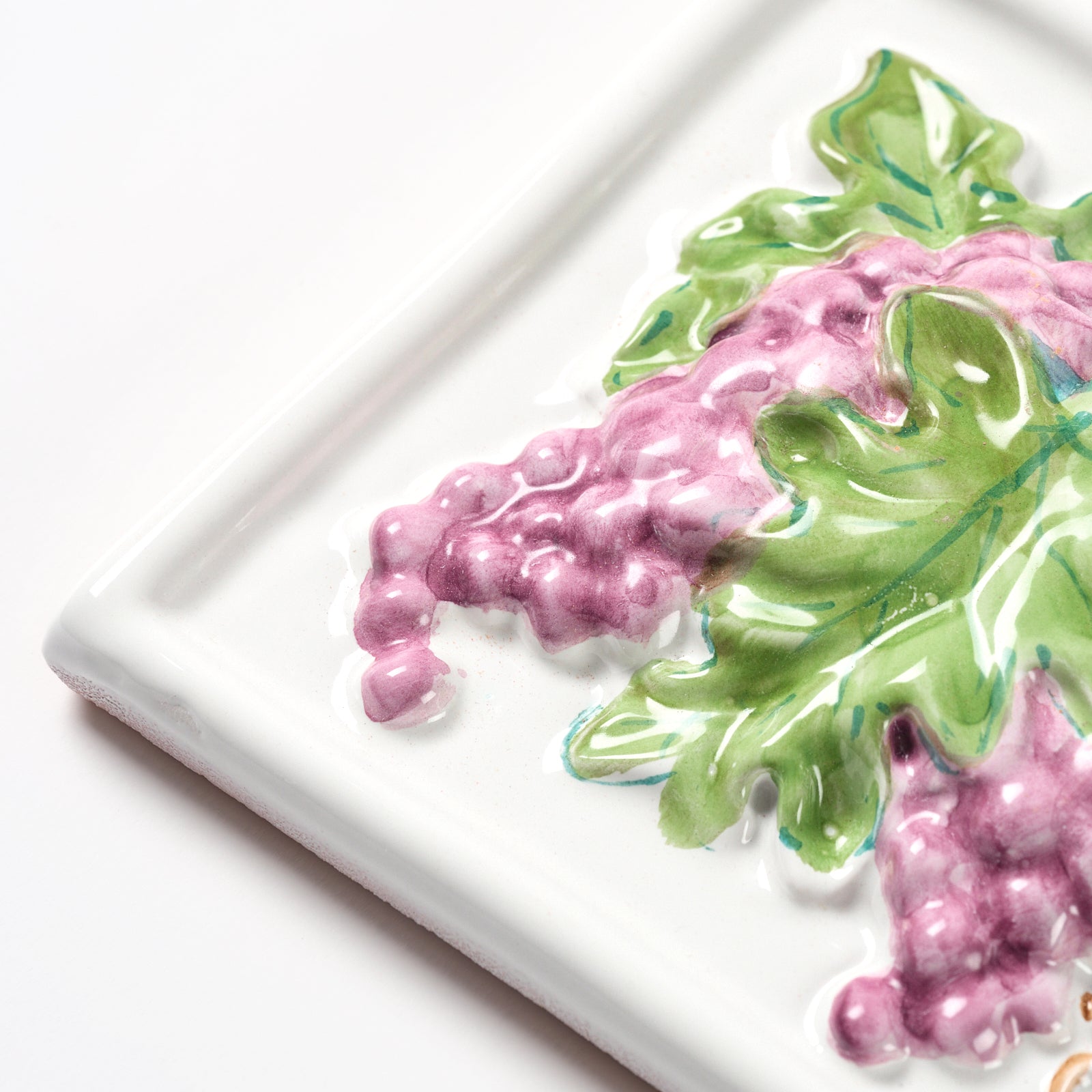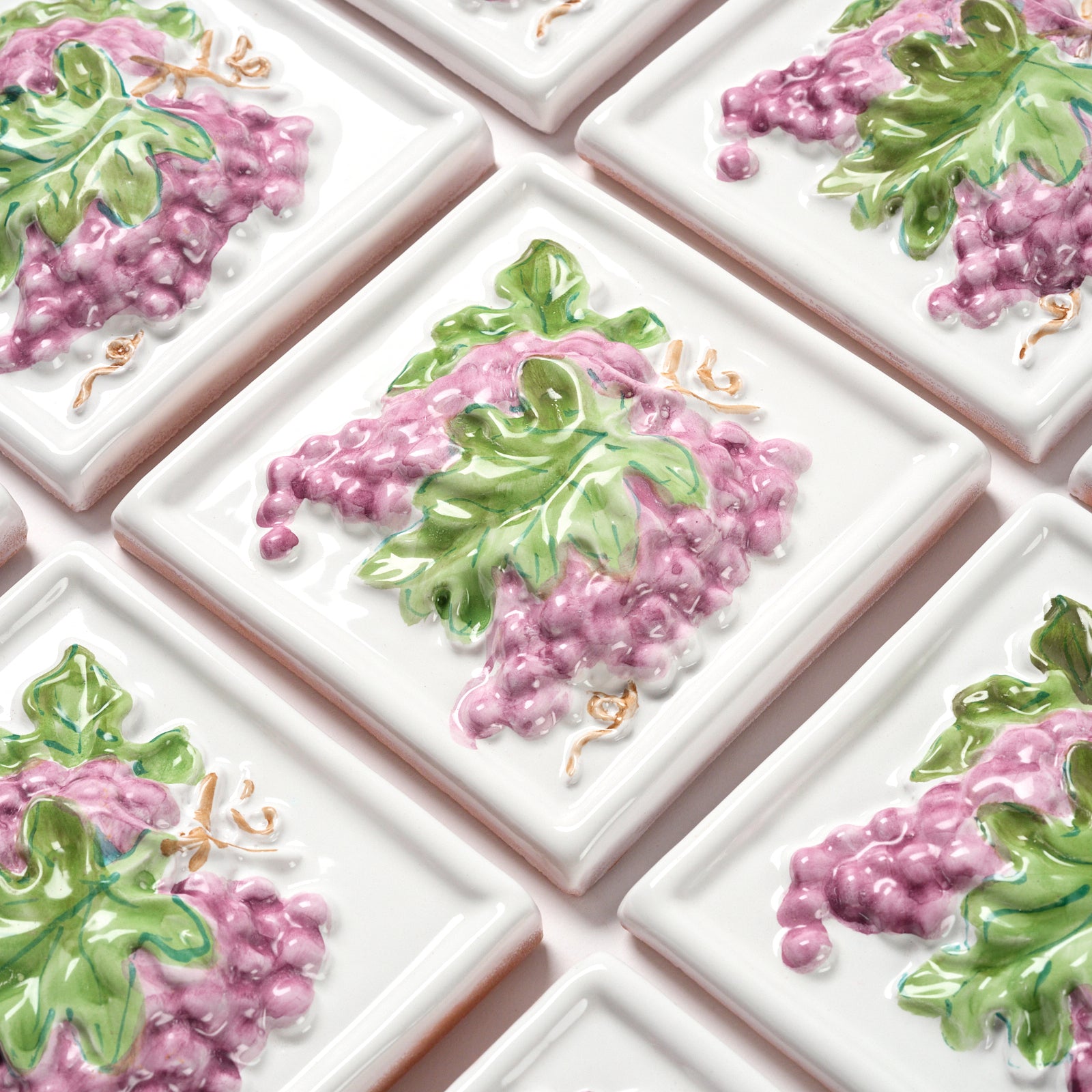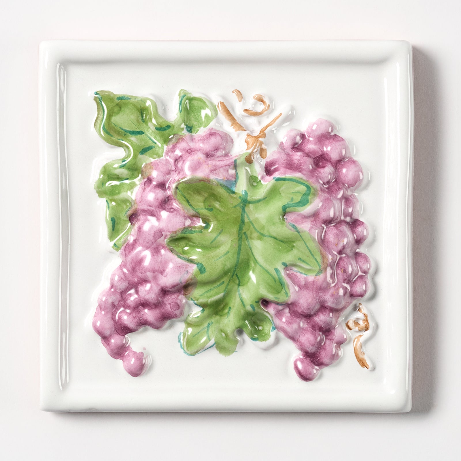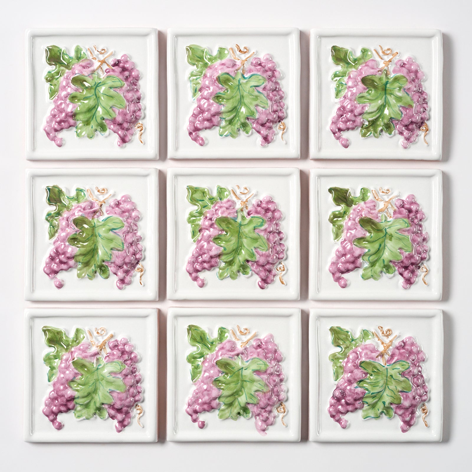 This glazed, high relief, terracotta wall tile has a beautiful green and purple (on a white background) raised grape pattern, each tile is approximately 4” x 4”, 1/2” thick, manufactured in Italy in the 1980s.