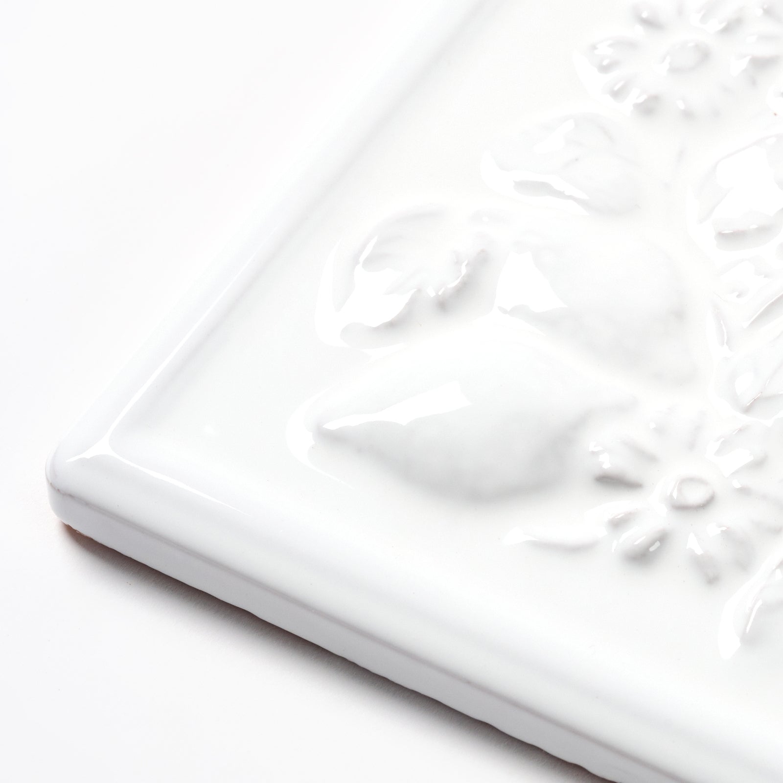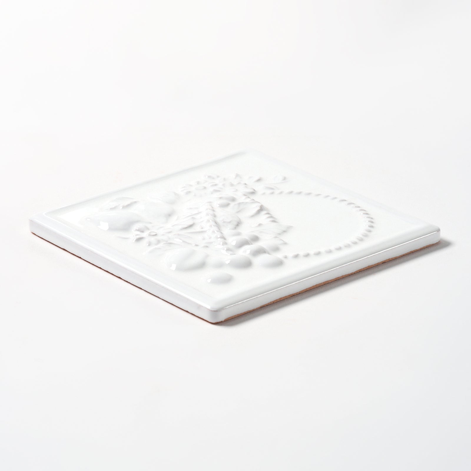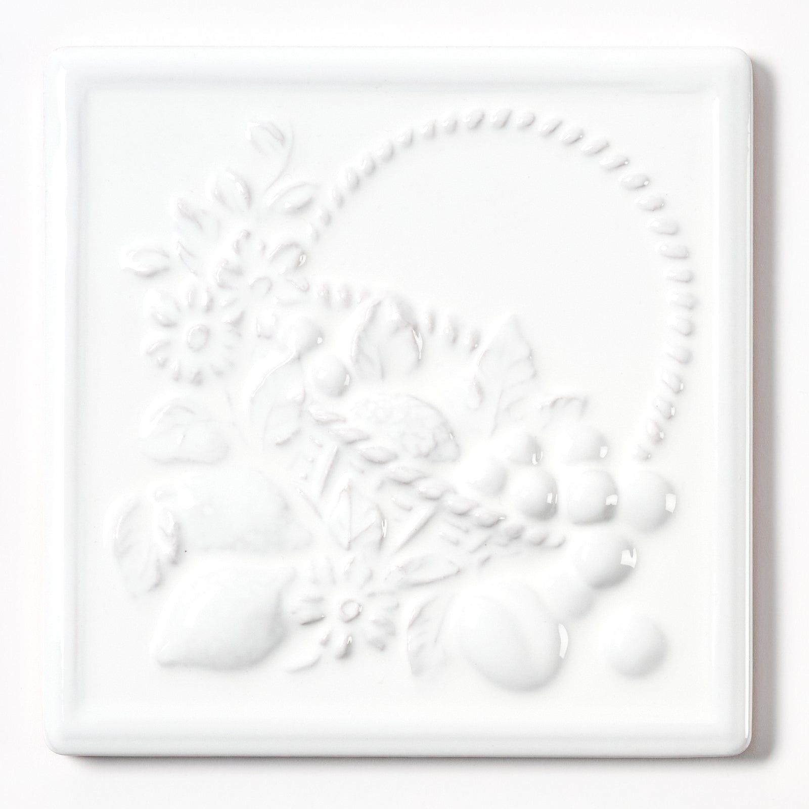 This glazed, white clay wall tile has a beautiful raised fruit basket pattern, each tile is approximately 6” x 6”, 5/16” thick, manufactured in Italy in the 1980s.