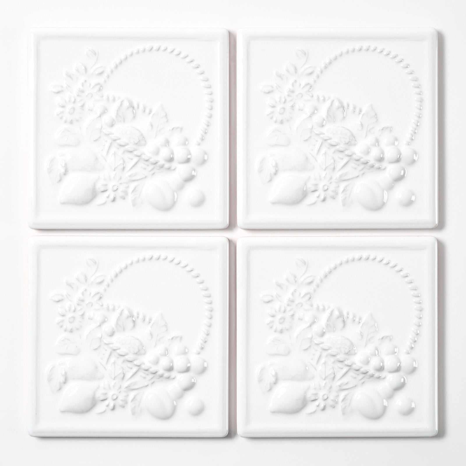 1980s Vintage Italian Raised White Fruit Basket Tile, 18 Sq Ft Available