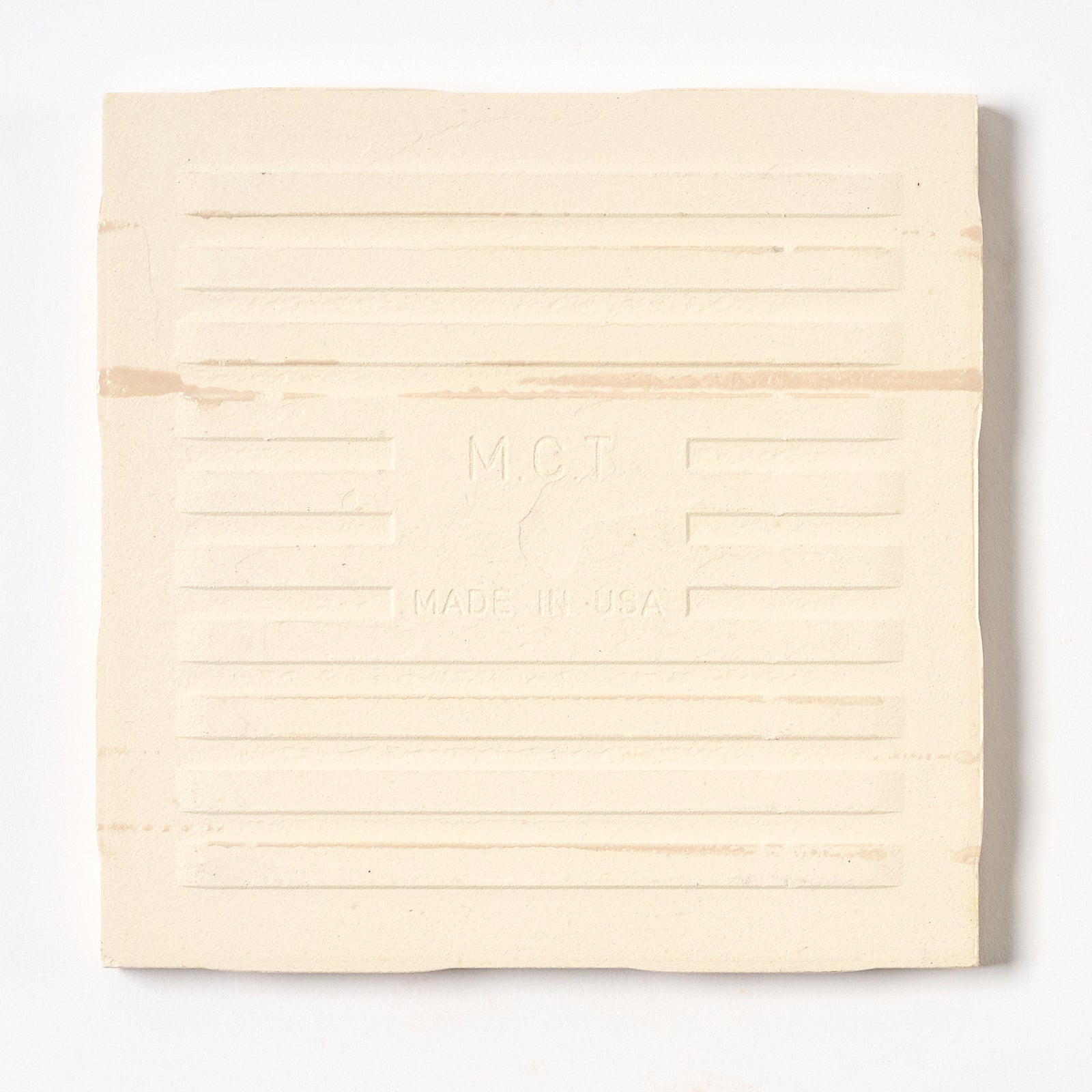 This glossy ceramic wall tile is named Fawn Beige. Each tile is 4 3/8” X 4 3/8”, 1/4” thick. Manufactured in the USA in the 1990s by Mannington, a division of Mid State Tile.