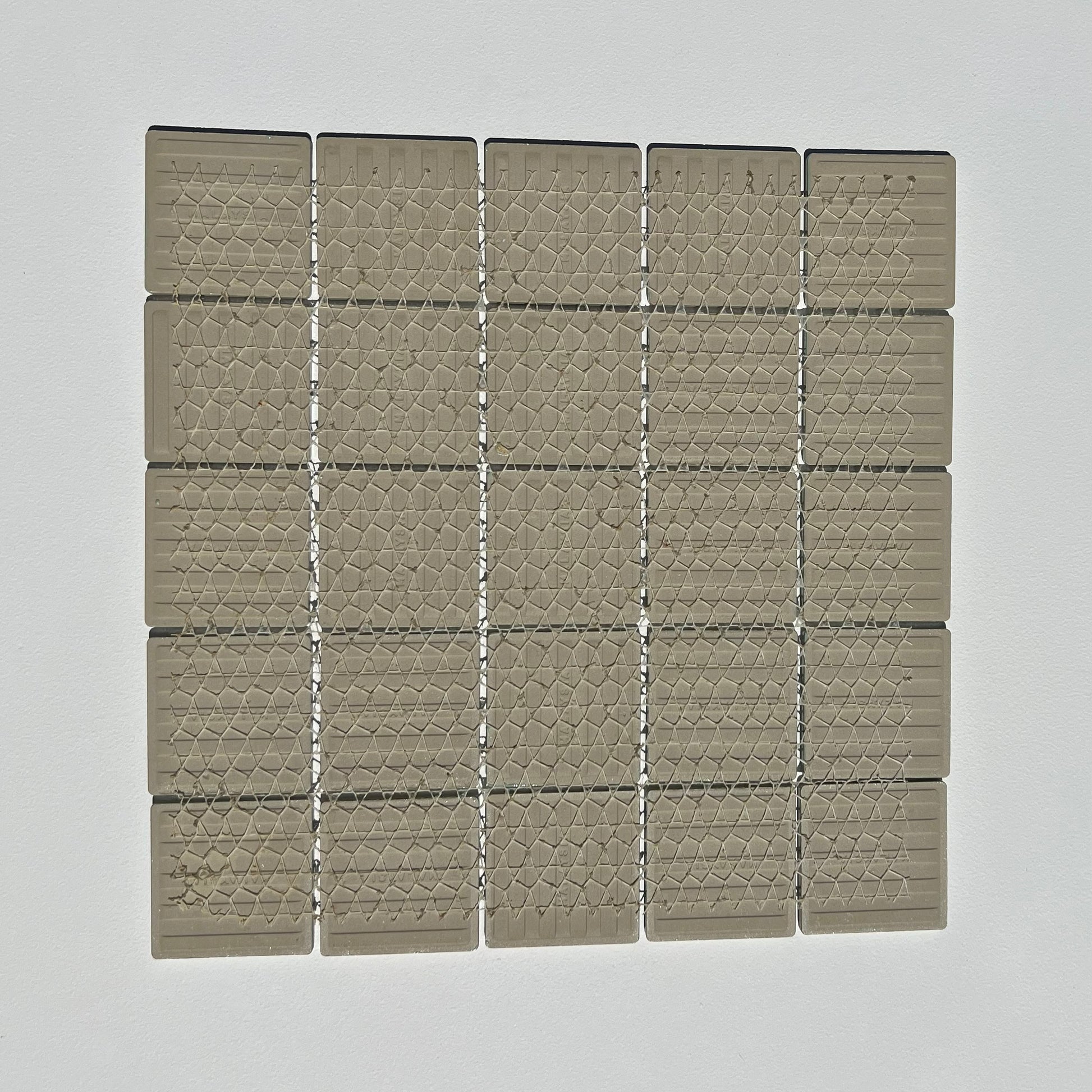 This high gloss ceramic wall tile is a maroon in color, each sheet is 12” x 12”, 3/16” thick, manufactured in Malaysia in the 1980s.