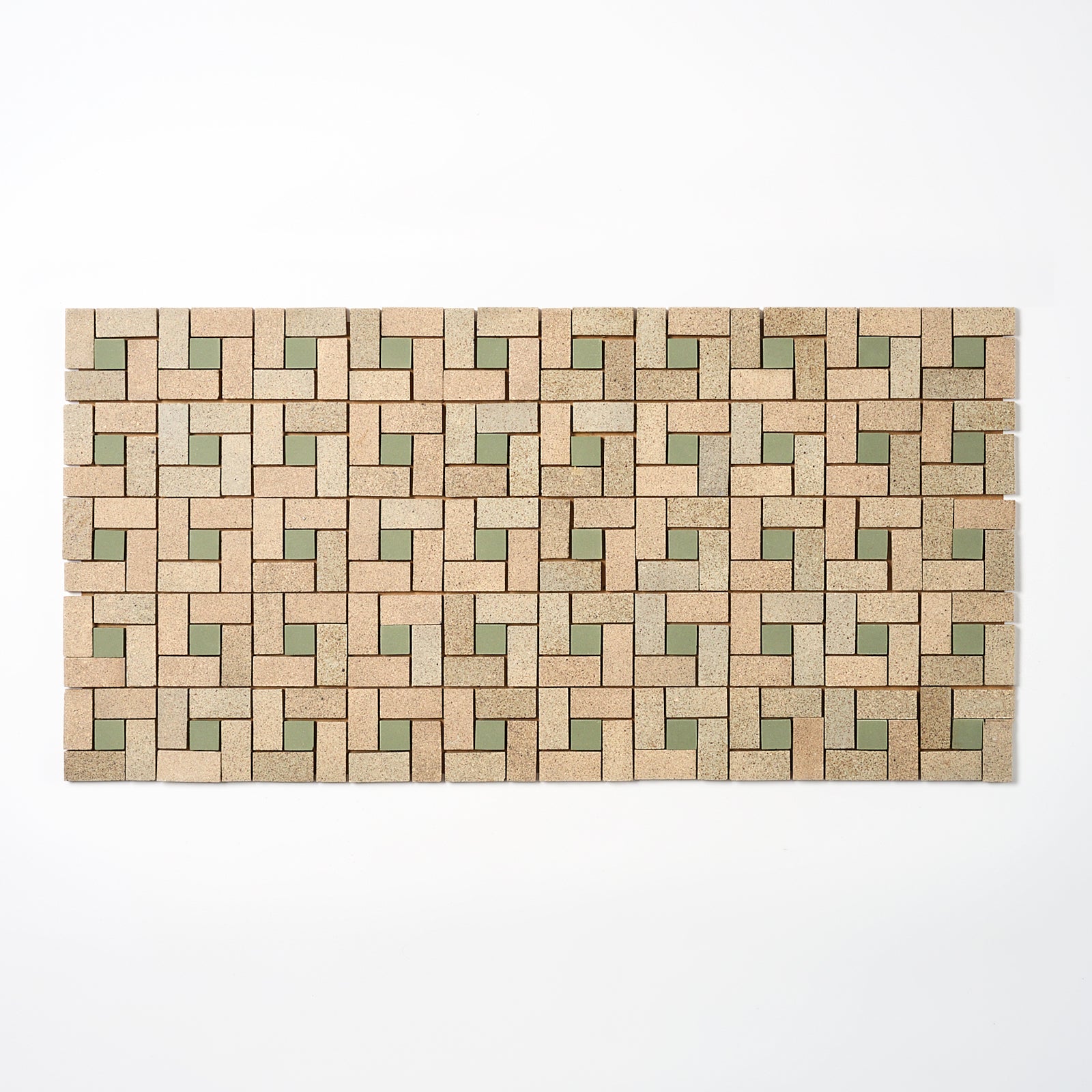 This incredible 1940s unglazed floor tile is sand gray with a green center dot. Each sheet is 12" x 24.5" x 3/16" thick. Manufactured by Newtown Tile Co. in Trenton NJ, USA in the 1940s. Pattern is Spiral.