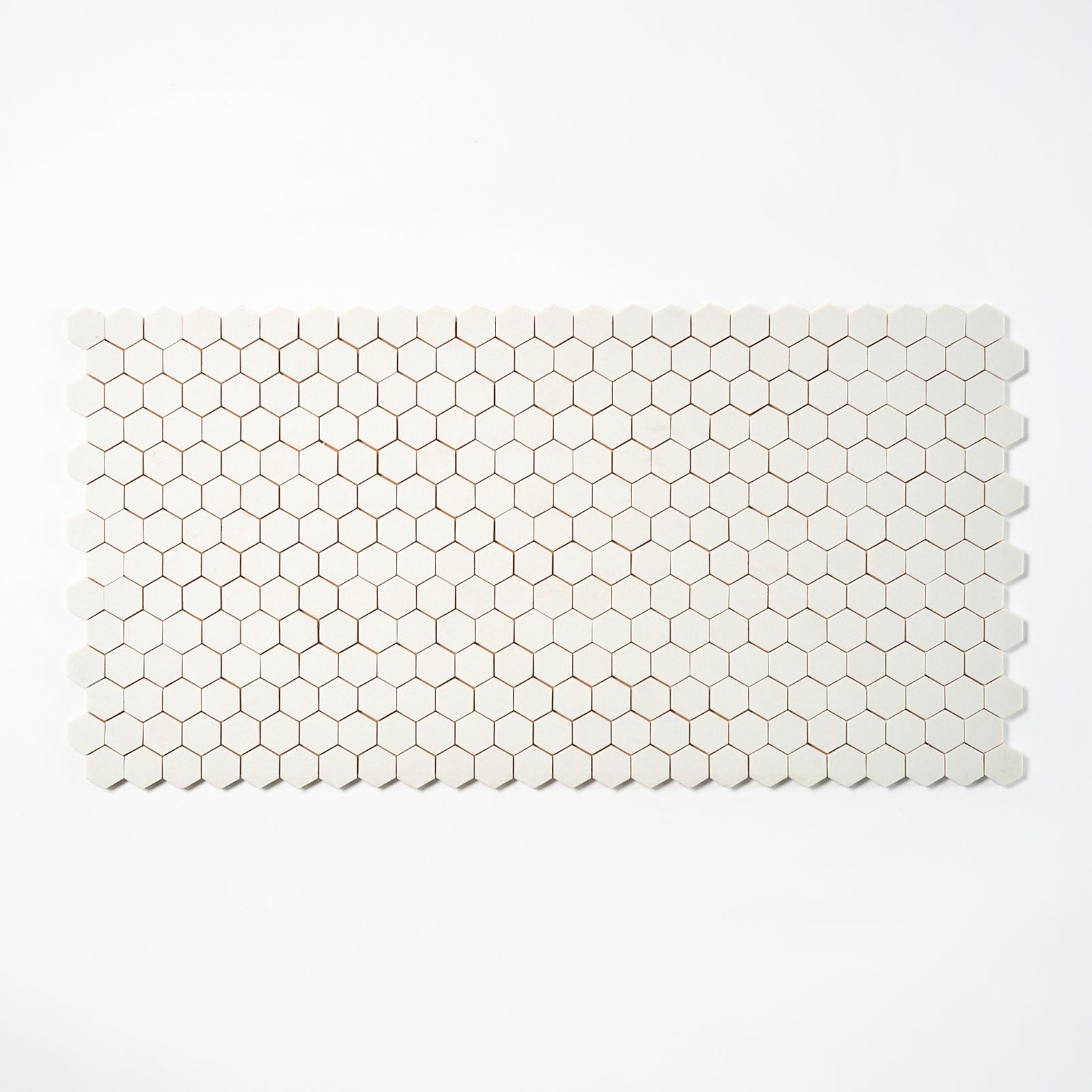 This incredible 1950s unglazed floor tile is called 1" White Hex. Each sheet is 13" x 25" x 1/4" thick. Manufactured by Olean Tile in the USA in the 1950s. Pattern is Hex.