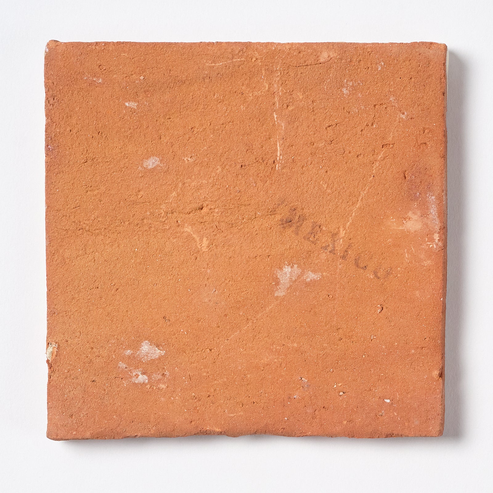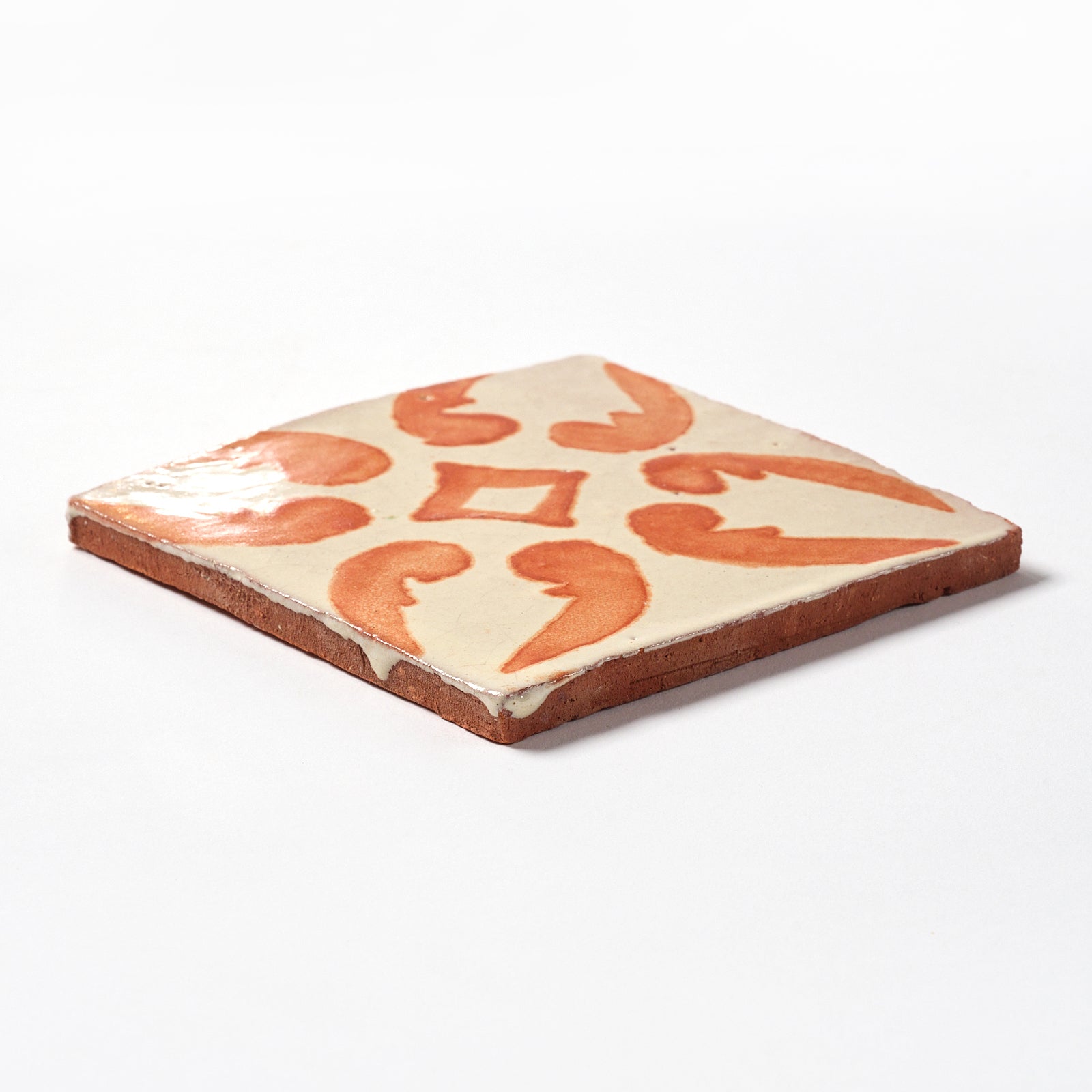 Vintage 1980s hand painted clay orange colored Mexican tiles, each tile is roughly 4.25” x 4.25”, 3/8” thick but the size varies slightly with each tile, manufactured in Mexico in the 1980s. Crazing and minor chips on some tiles.