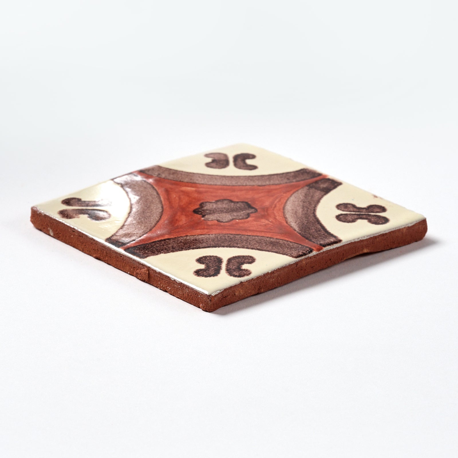 Vintage 1980s hand painted clay rust colored Mexican tiles, each tile is roughly 4.25” x 4.25”, 3/8” thick but the size varies slightly with each tile, manufactured in Mexico in the 1980s. Crazing and minor chips on some tiles.
