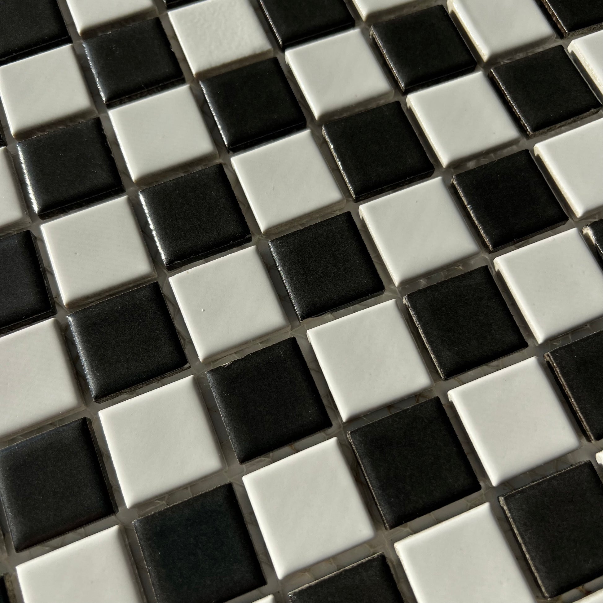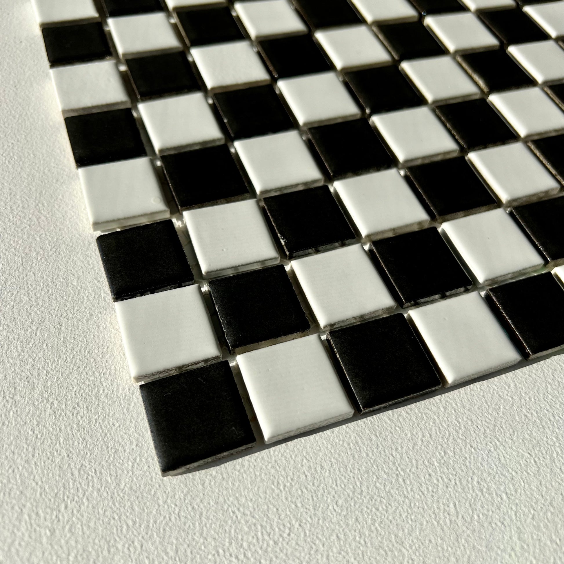 This glazed 1" x 1" checkerboard floor or wall tile is black and white in color, each sheet is 11” x 11”, 3/16” thick, made in Korea in the 1970s.