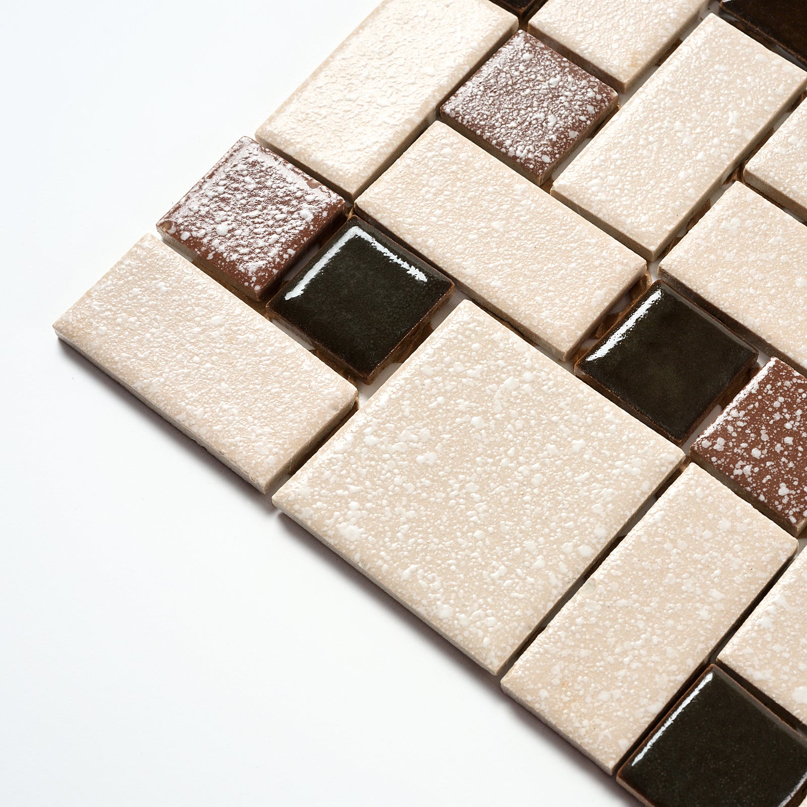 This high gloss ceramic wall tile is a brown colorway in a random pattern. Each sheet is 12.75” x 12.75", 3/16” thick, manufactured in Japan in the 1960s.