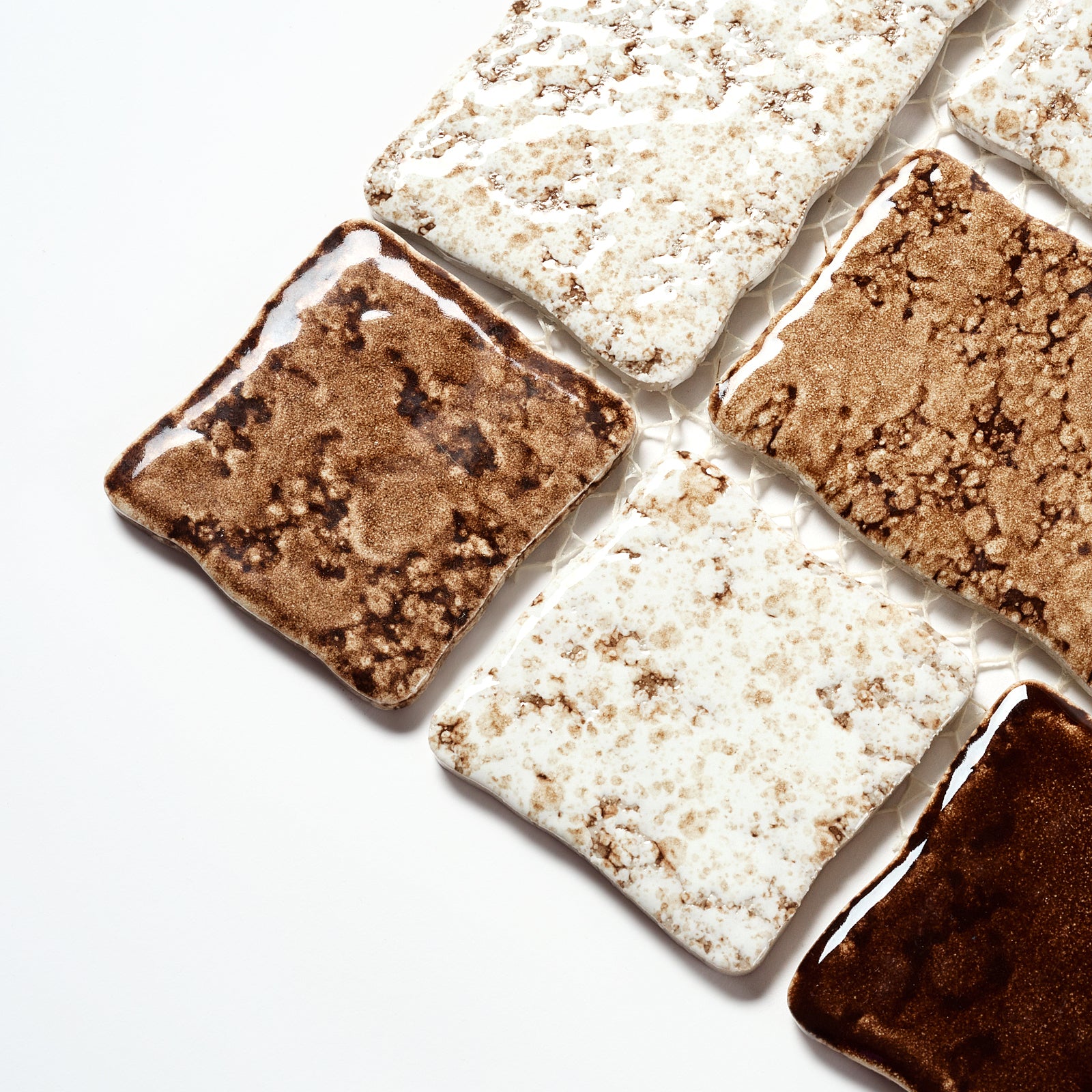 This gloss ceramic wall tile is shades of brown and ivory. Each sheet is 11.75” x 14", 3/16” thick, manufactured in Japan in the 1960s.