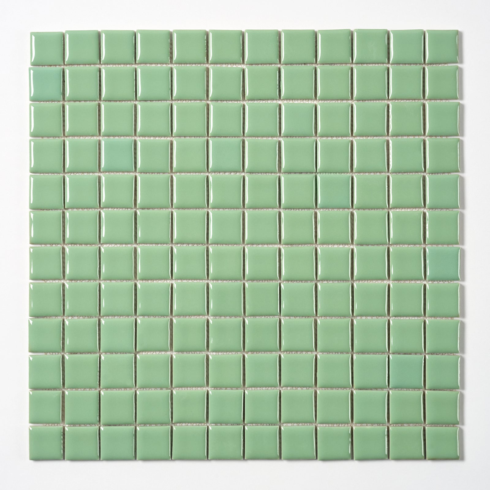 This high gloss ceramic wall tile is jade green in color, each sheet is 12.75” x 12.75", 3/16” thick, manufactured in Japan in the 1960s.