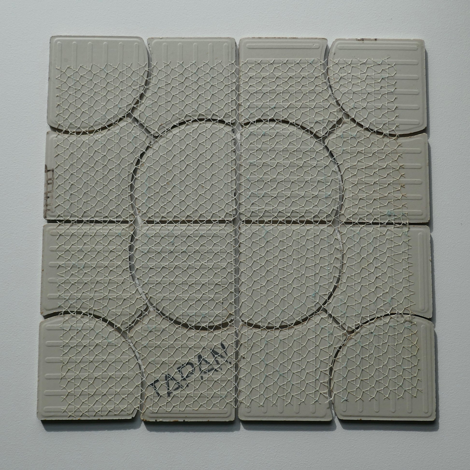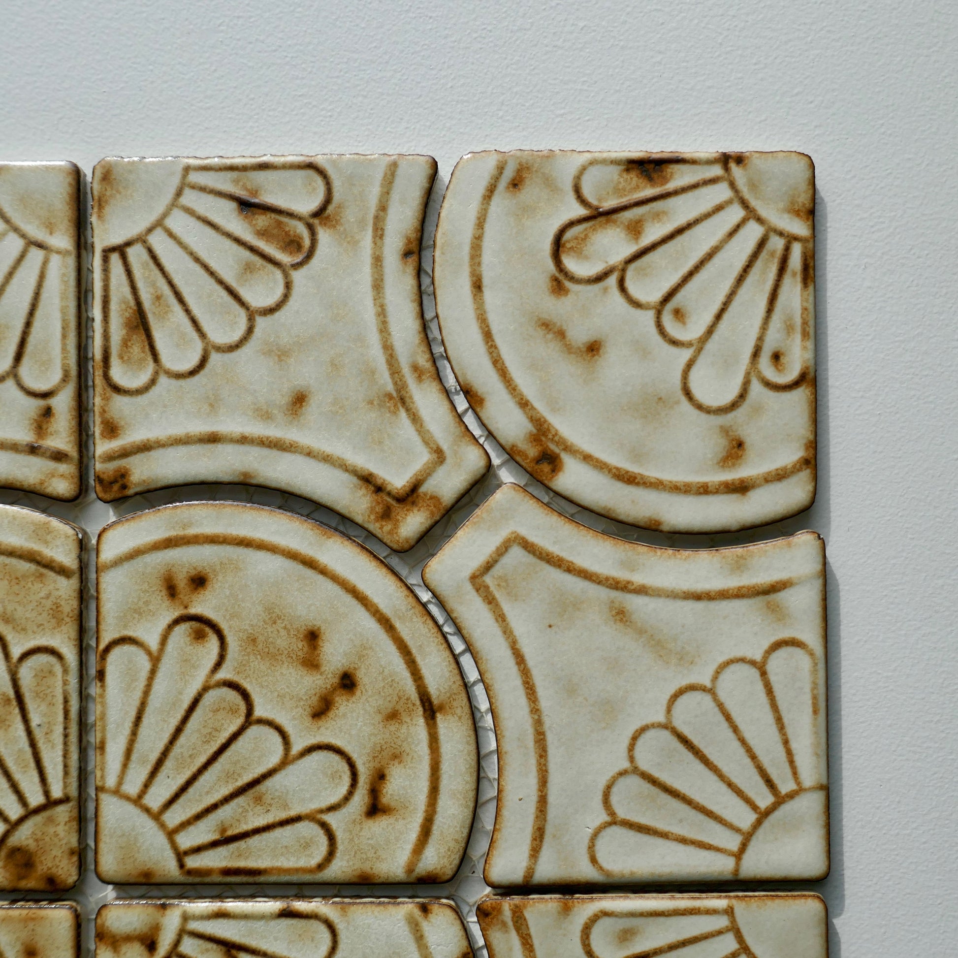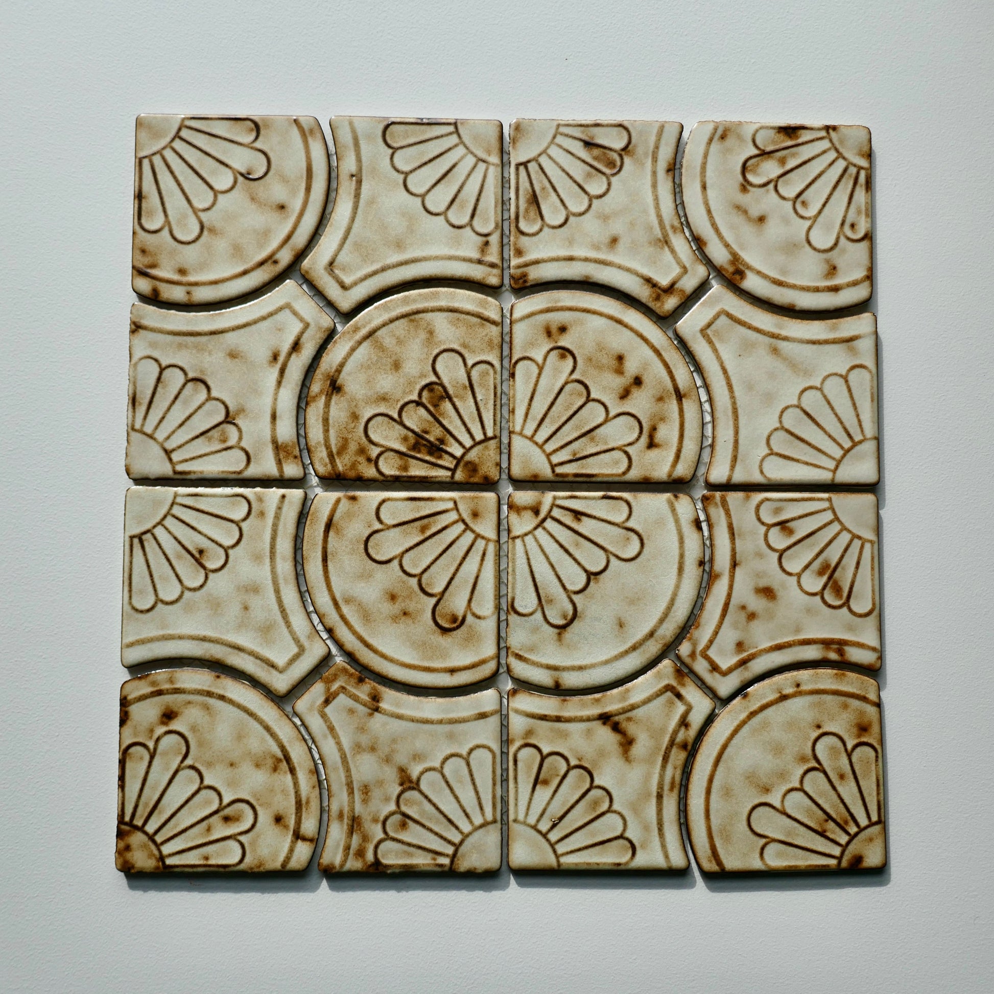 This glazed ceramic floor tile is shades of cream and brown in color, each sheet is 14” x 14”, 1/4” thick, manufactured in Japan in the 1970s. The description on the box is Large Plum Pattern.