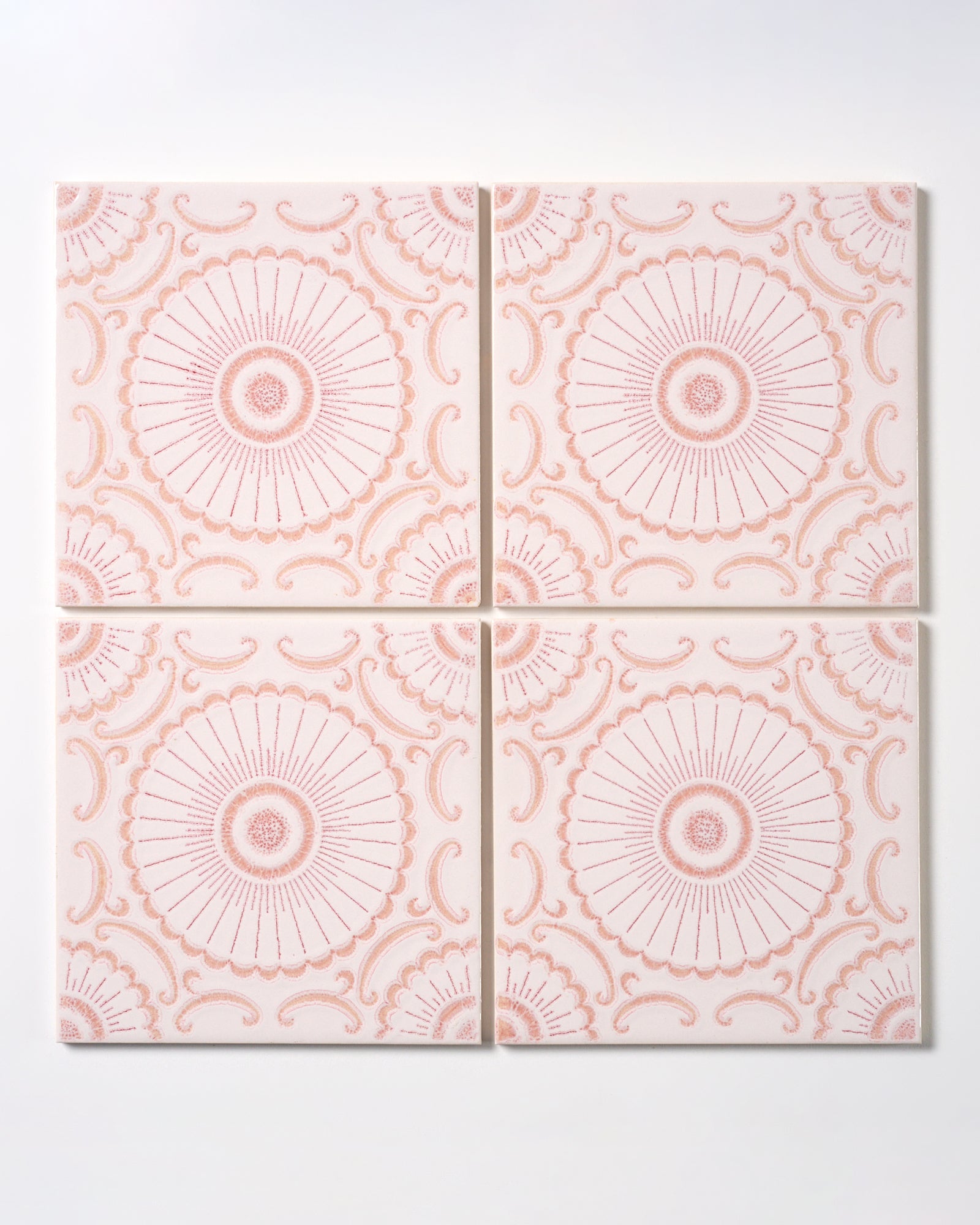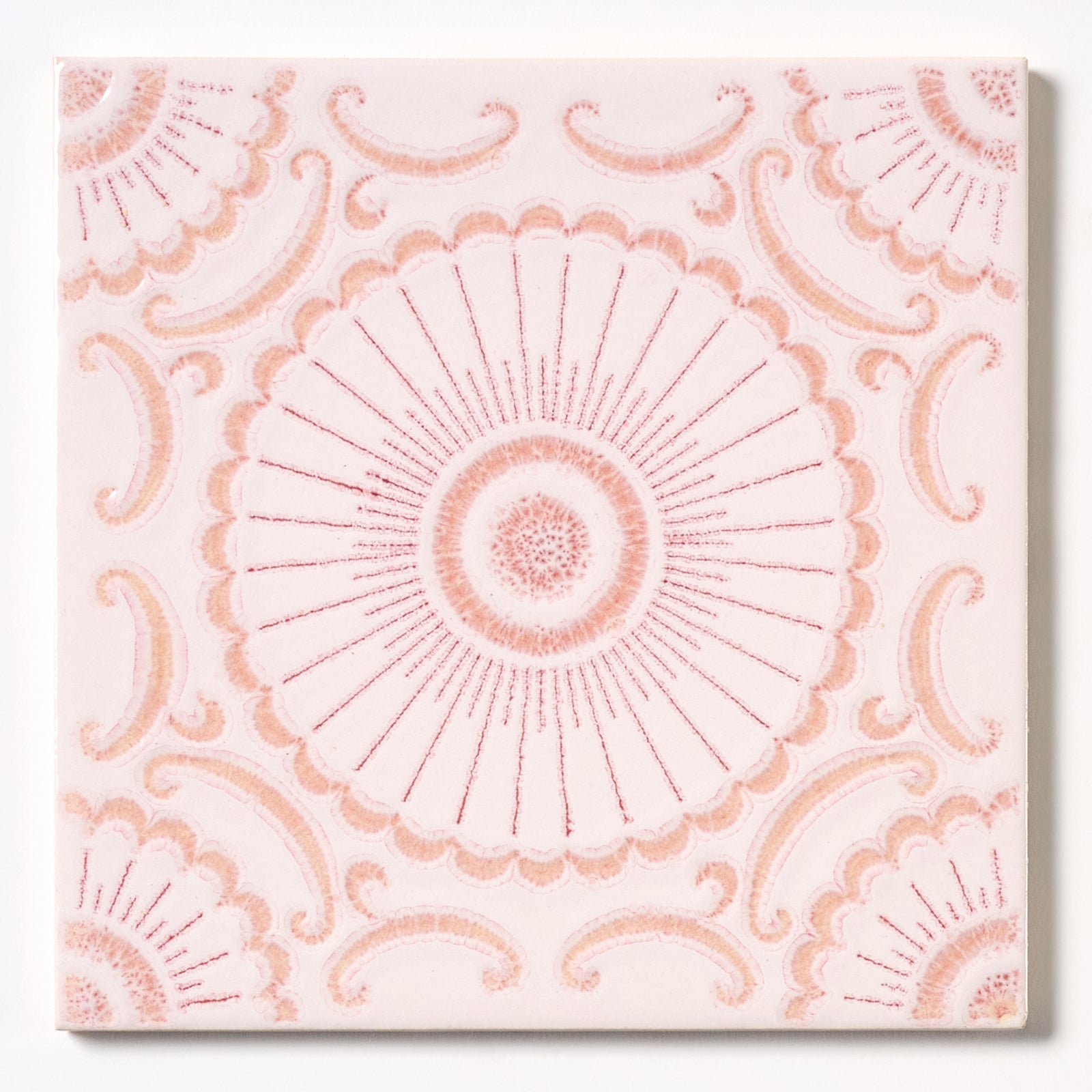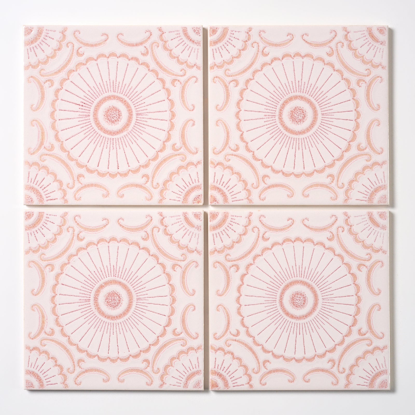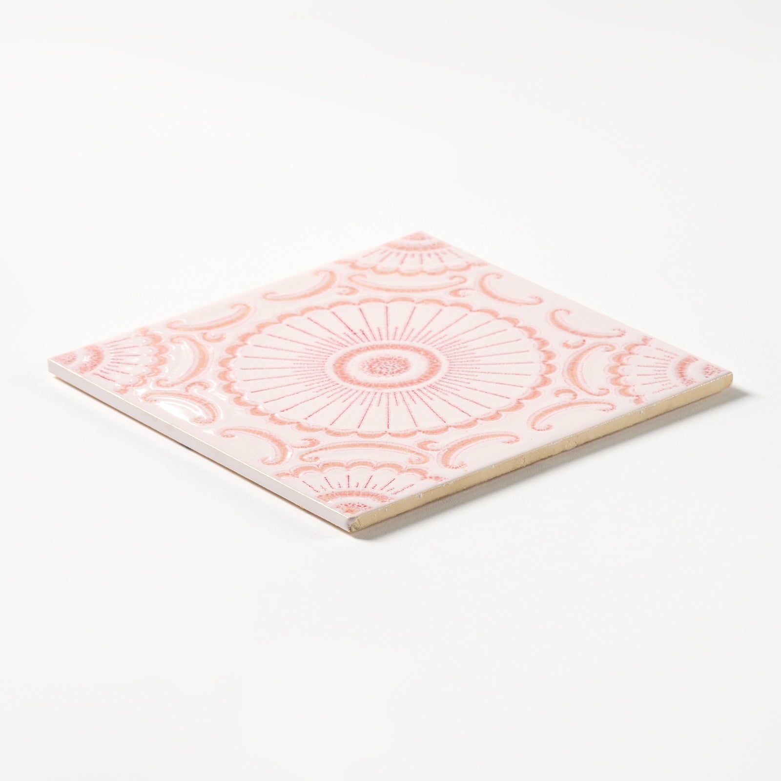 Extremely rare, vintage porcelain wall tile in a pink pattern. Each tile is 6” x 6”, 3/16” thick, manufactured in Switzerland by Laufen in the 1970s.