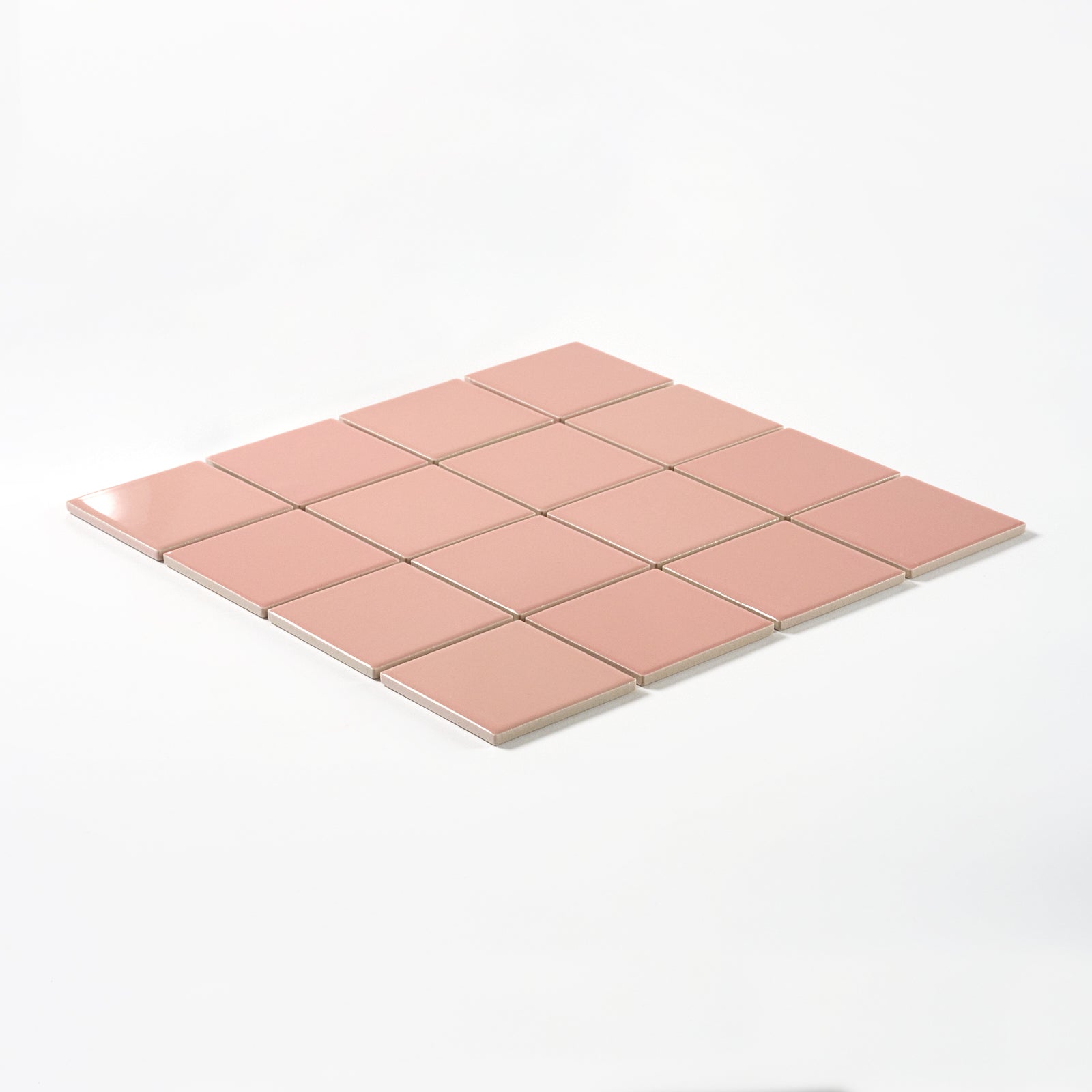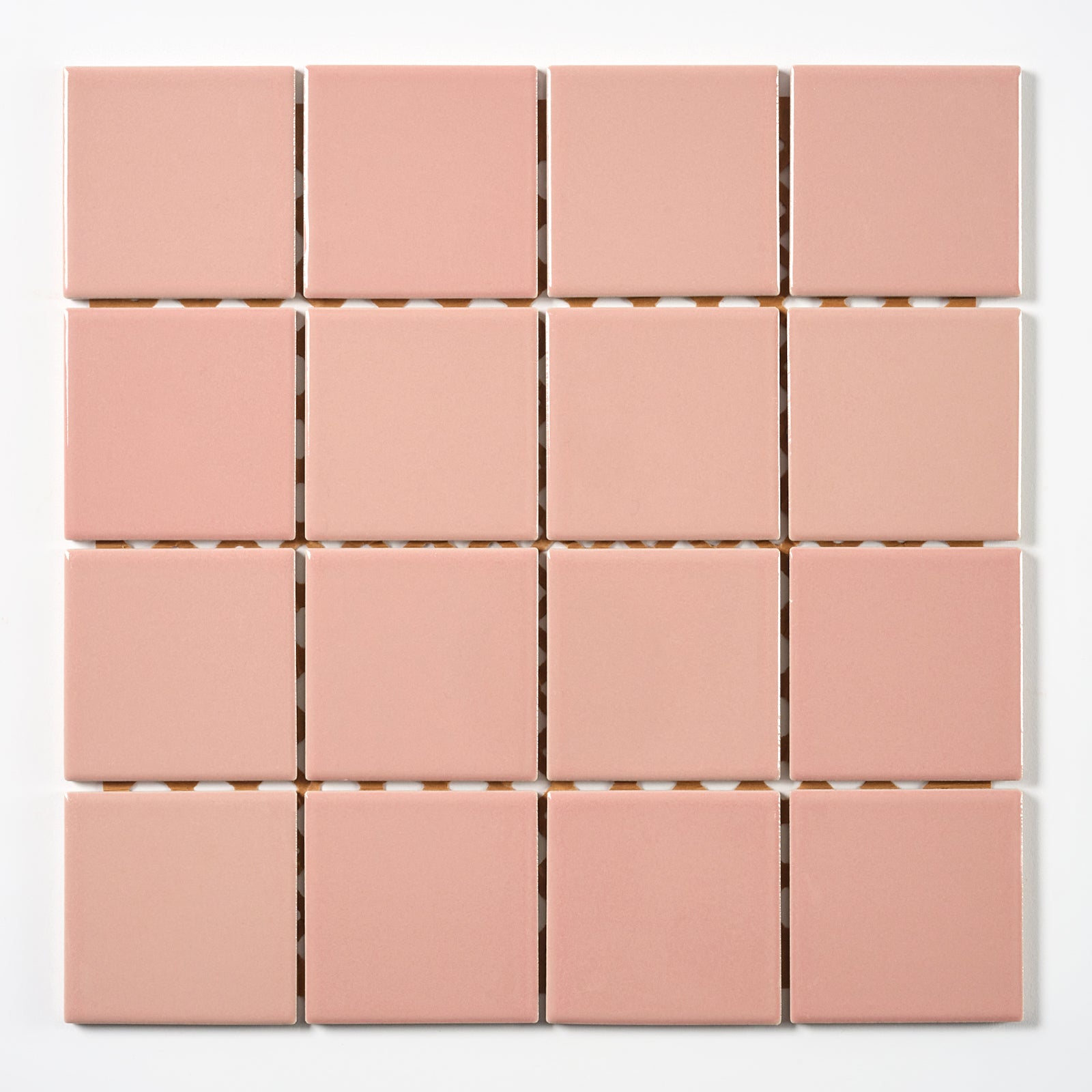 This high gloss ceramic wall tile is a dusty pink in color, each sheet is 12” x 12", 3/16” thick, manufactured in Japan in the 1980s by Impo Glaztile.