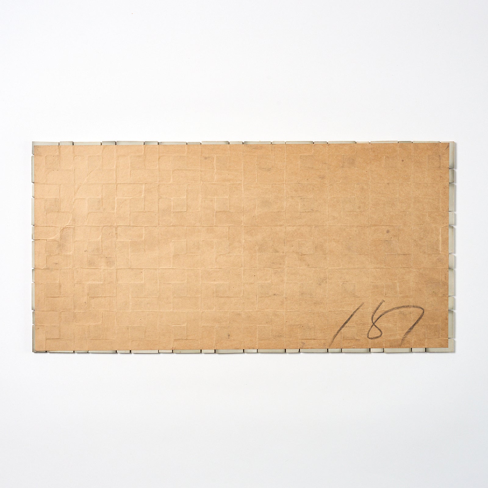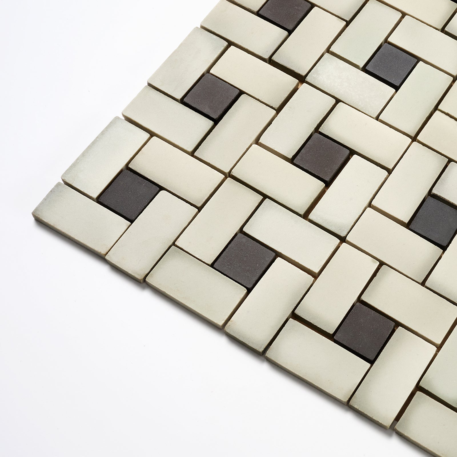 This incredible 1950s unglazed floor tile is labeled "Burnt Buff" with a black center dot. Each sheet is 12" x 24" x 1/4" thick. The color gives off a slight green hue. Manufactured by Wheeling Tile Co. in Wheeling WV, USA in the 1950s. Pattern is Spiral.