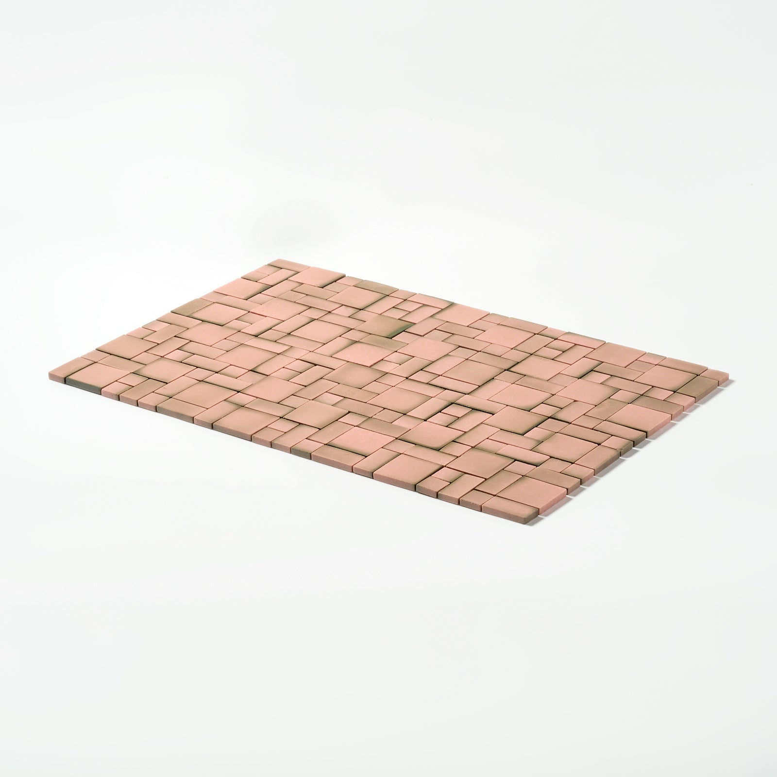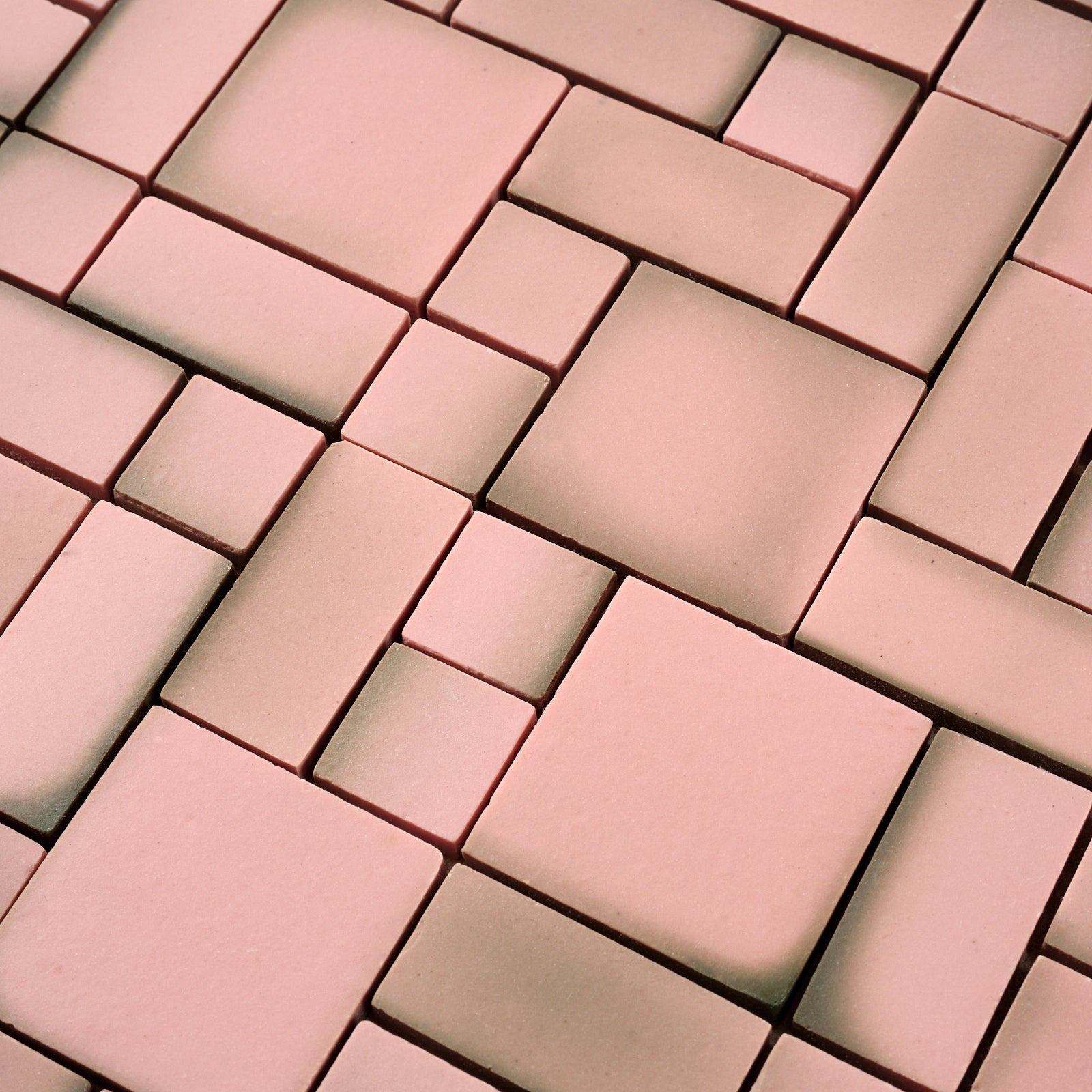 This incredible 1950s unglazed floor tile is labeled "Burnt Corallin". Each sheet is 13" x 20.25" x 1/4" thick. Manufactured by Wheeling Tile Co. in Wheeling WV, USA in the 1950s. Pattern is Block Random.